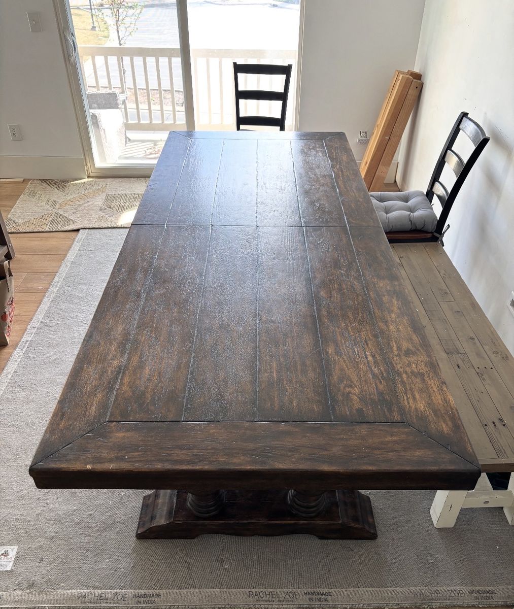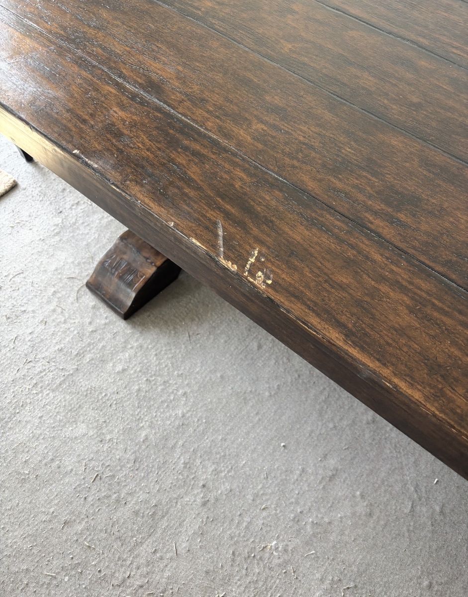 Beautiful Pottery Barn trestle dining table. Dark brown color 98” long x 42” long x 30” high Opens up to 120” long with a 22” center leaf. It has a couple of scratches that can be fixed easily.