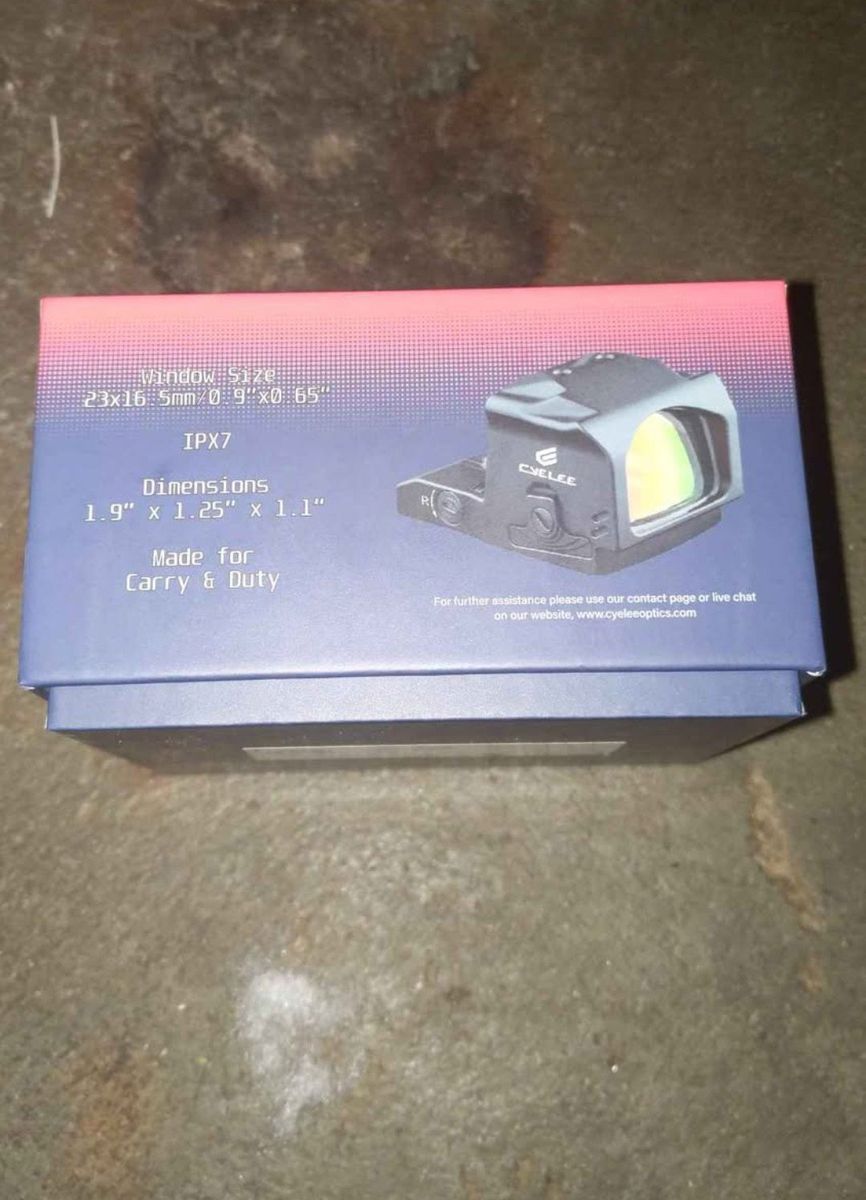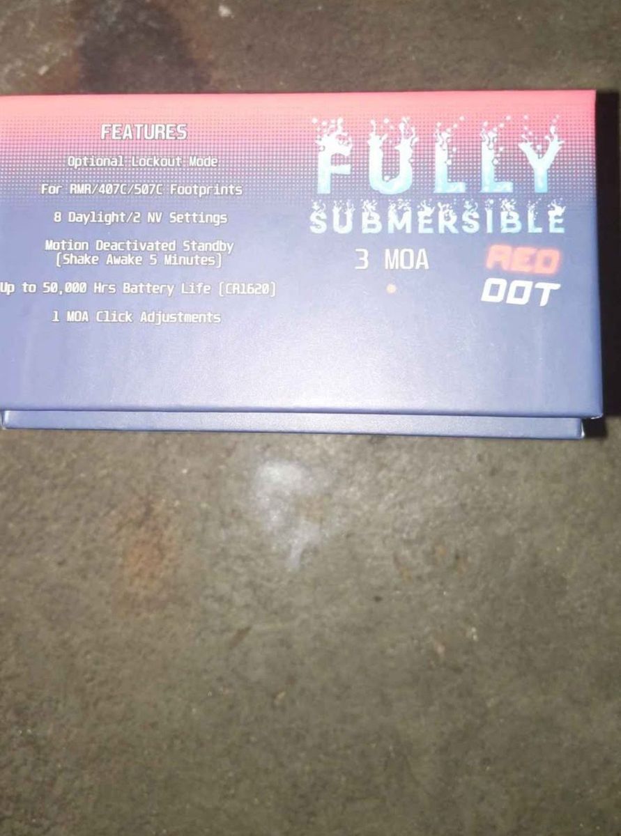 Venmo(Cyelee optics) this is brand new only tried to install the red dot, did not fit. lockout mode, for RMR 407C/507C footprints 8 daylight and 2 night settings shake awake 5 minutes up to 50,000 hrs of battery (CR1620) 1 MOA adjustments Velcro patch (cyelee) tools and cleaning cloth
