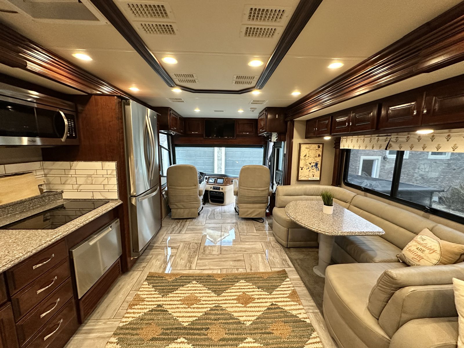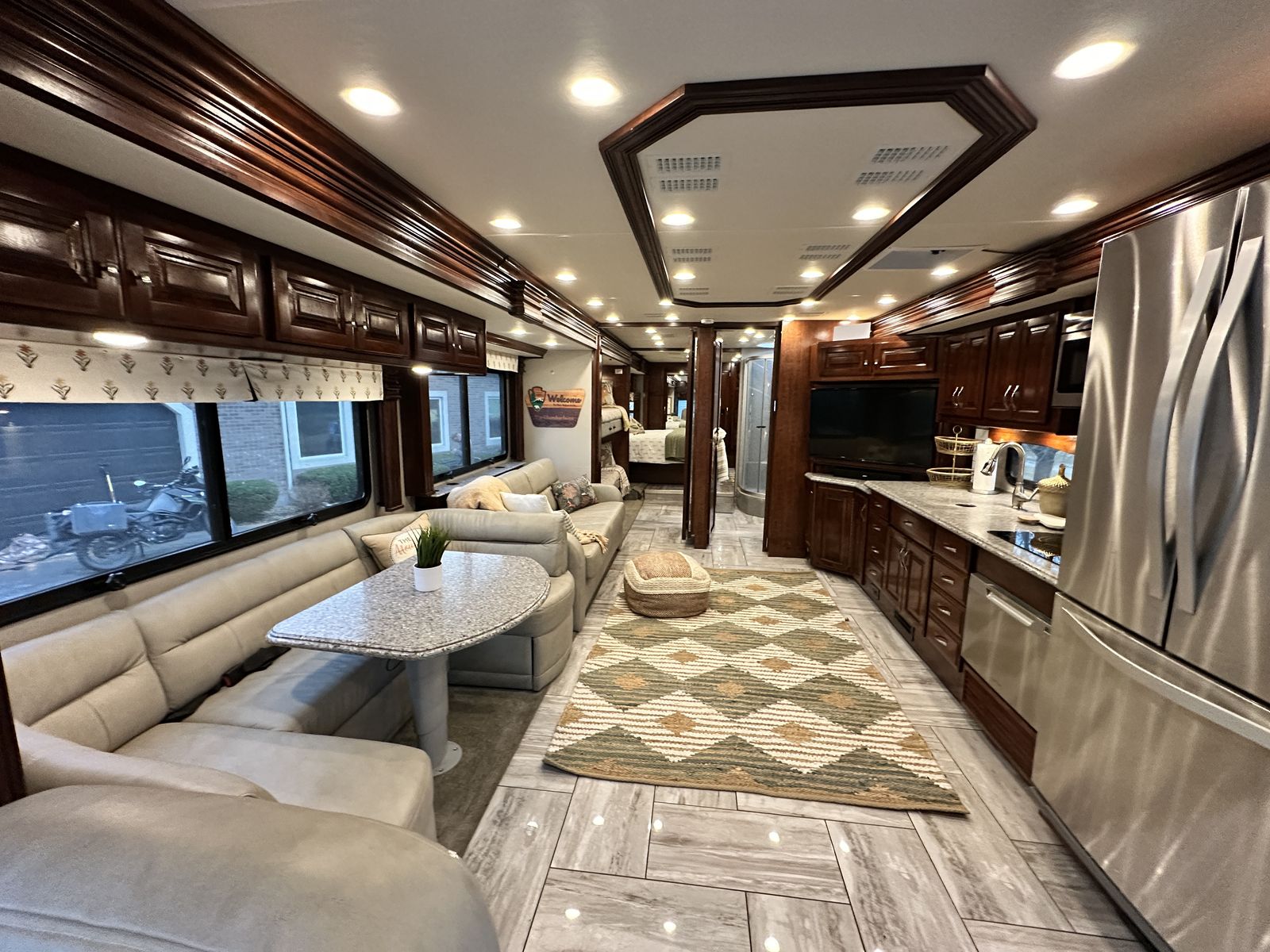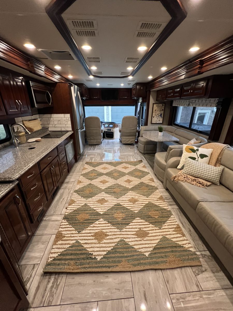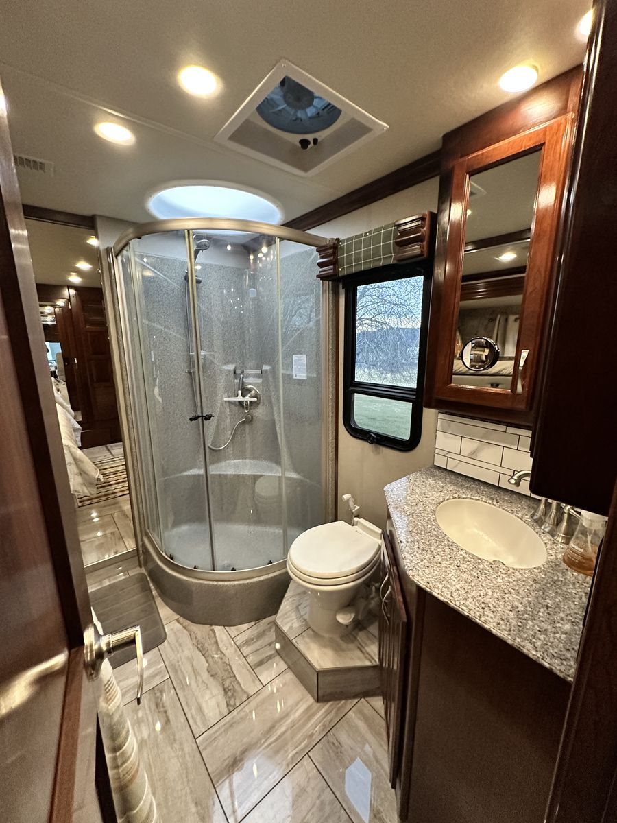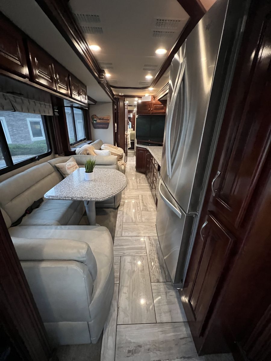 Inside, the Fleetwood Discovery LXE 40G is appointed with high-end finishes and premium amenities. The living area is open and inviting, with plenty of seating options for relaxing or entertaining guests. The kitchen is equipped with top-of-the-line appliances and ample counter space for meal preparation. Full size refrigerator, dishwasher, induction cooking top, microwave, washer and dryer.