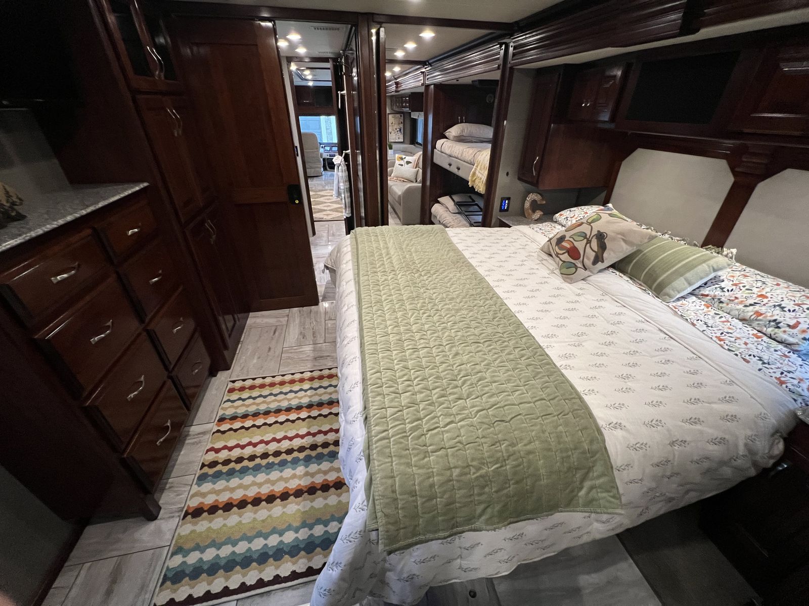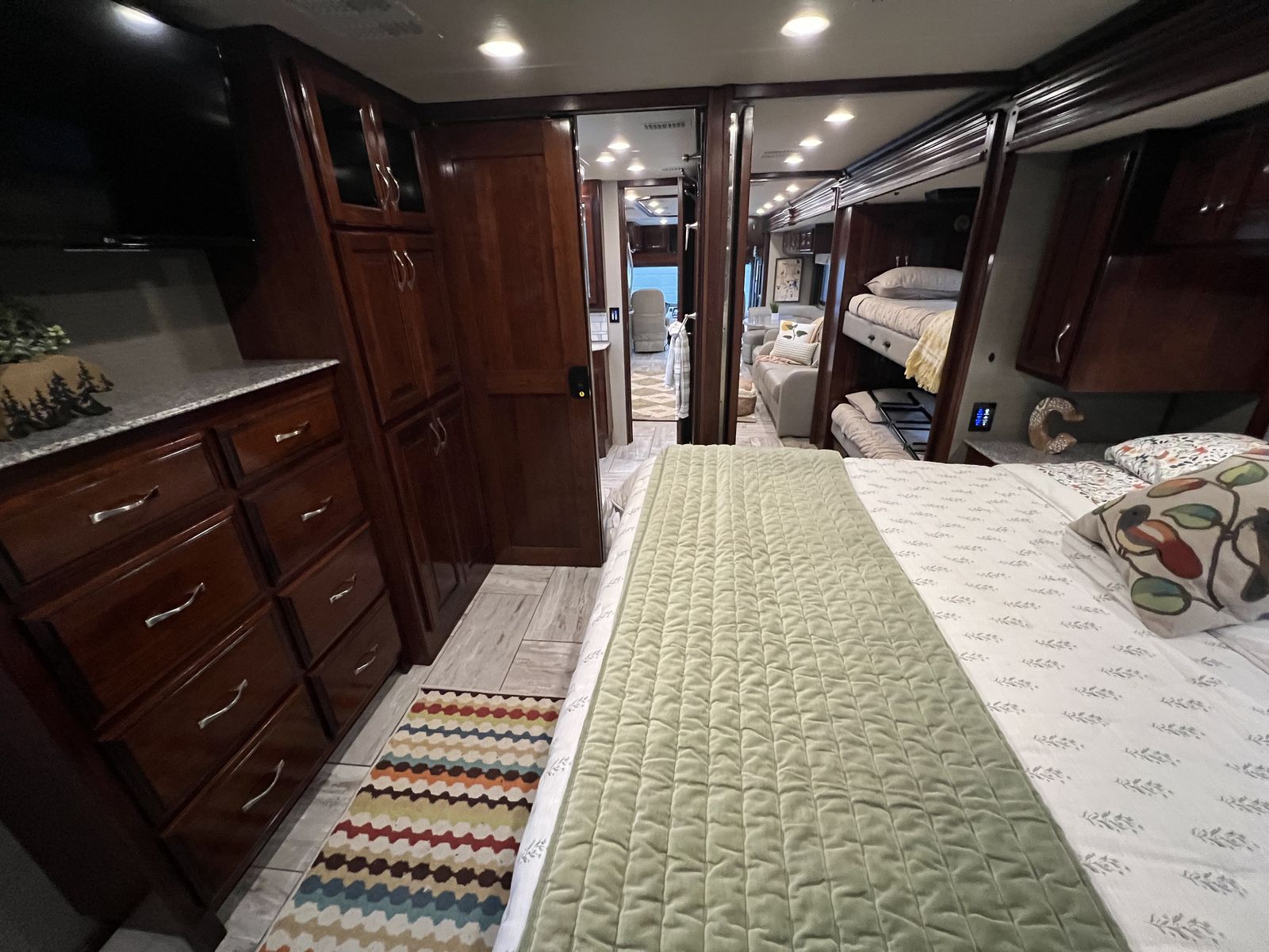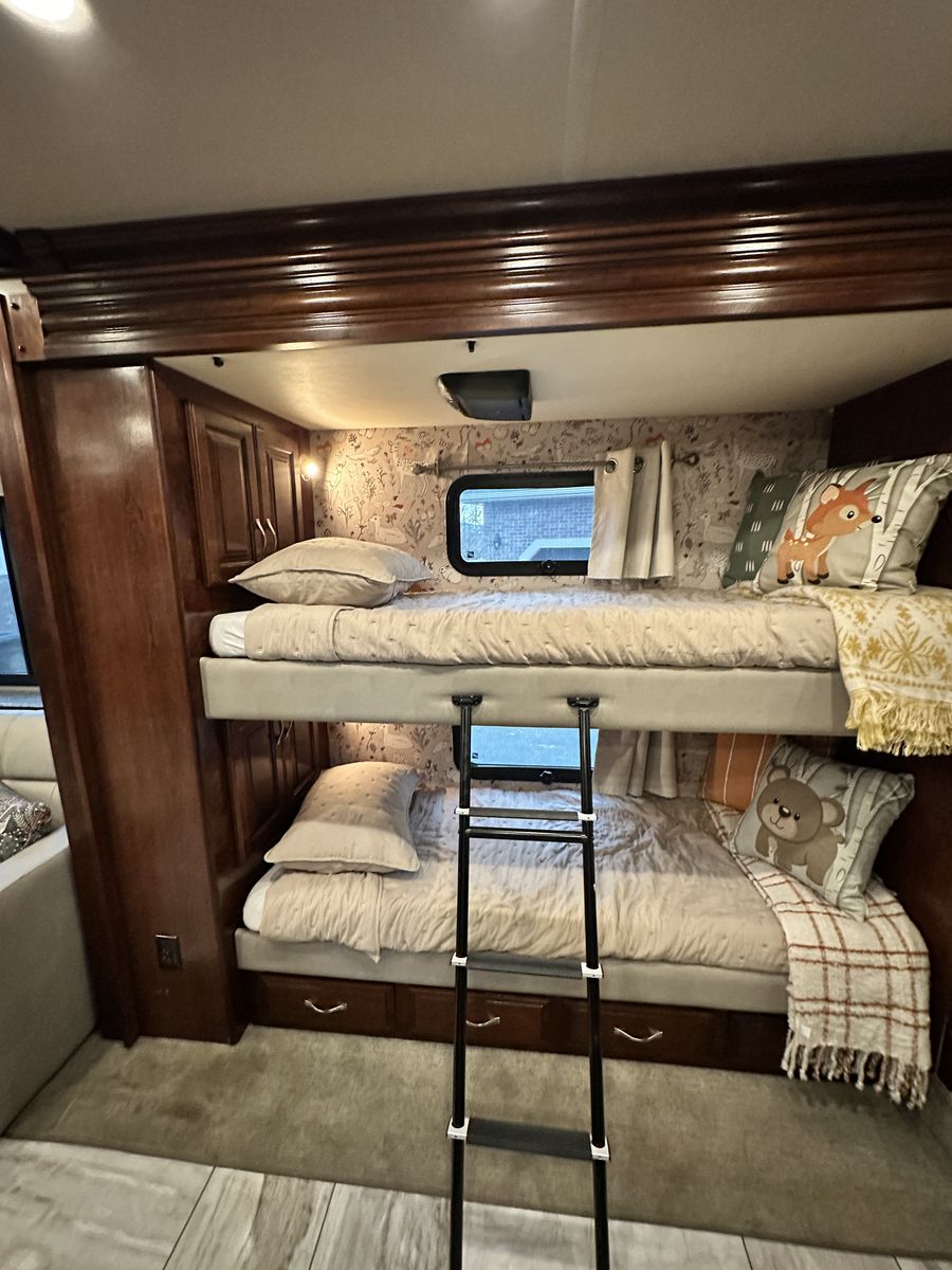 The bedroom in the Fleetwood Discovery LXE 40G offers a comfortable retreat with a king-sized bed, plenty of storage, and a flat-screen TV for late-night viewing. The bathroom is spacious and well-appointed, with a large shower and modern fixtures. Bunk beds with privacy doors, queen size sofa sleeper and wraparound dinette that converts to bed for sleeping up to 7-8.