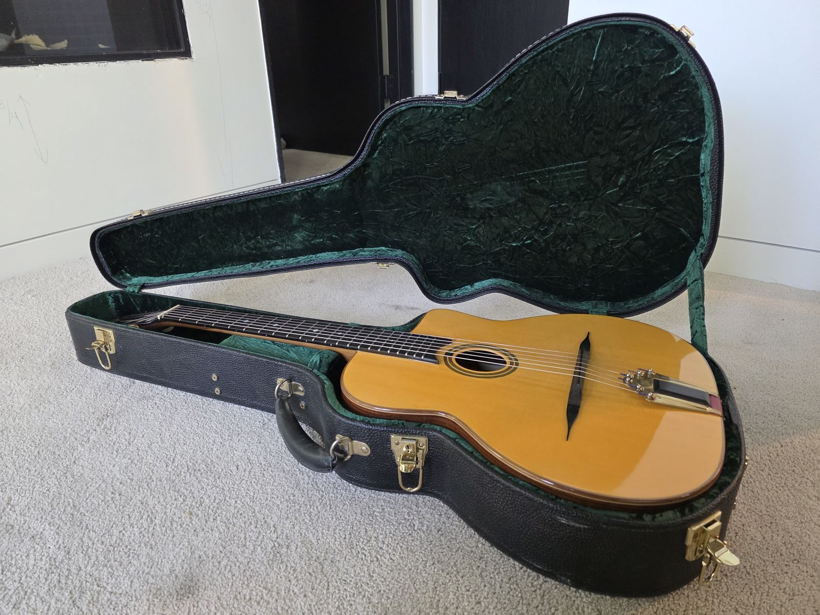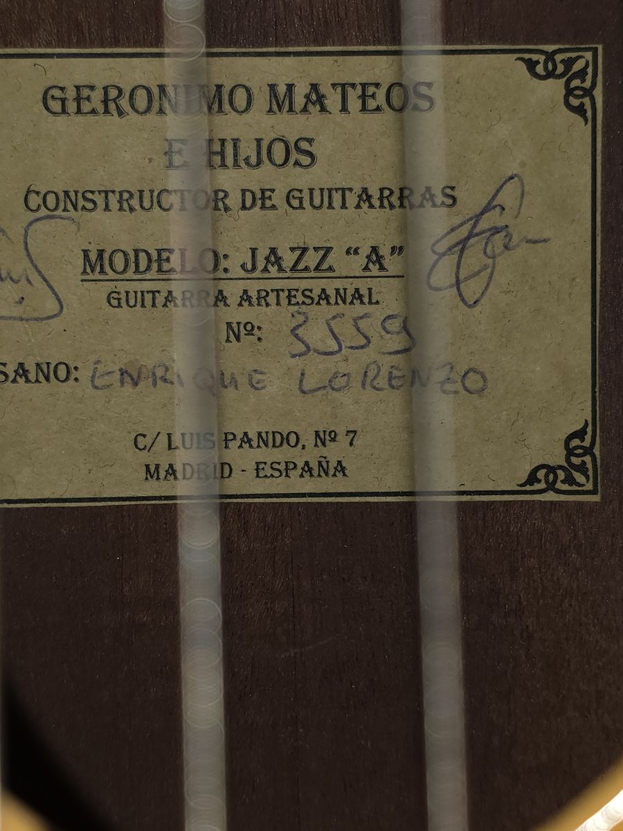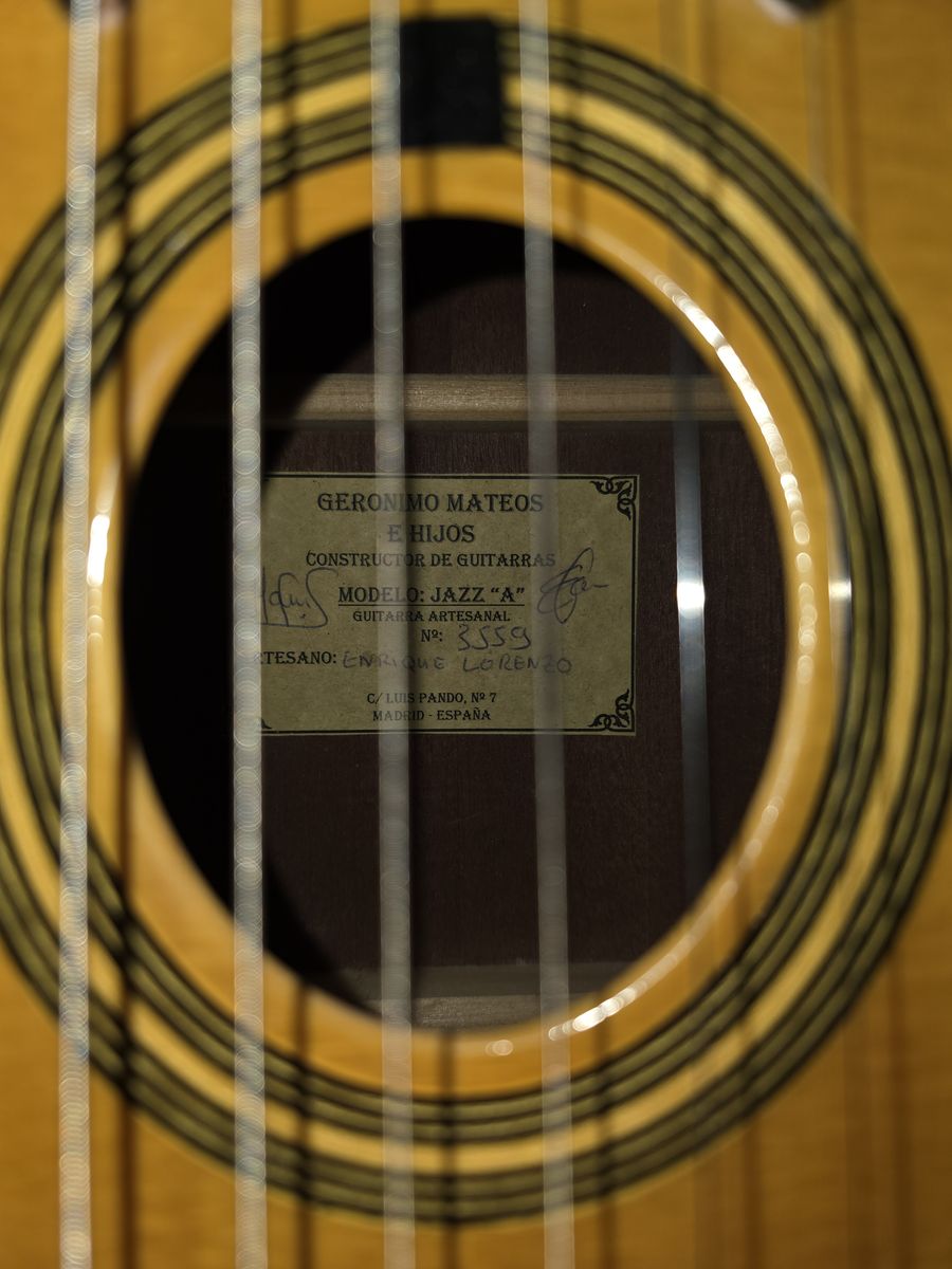 Geronimo Mateos has long been one of the leading Selmer Maccaferri style luthiers in Spain. Based in Madrid, his guitars are played worldwide by such notably luminaries as Angelo Debarre, Tchavolo Schmitt, and Gonzalo Bergara. Angelo Debarre played a Mateos guitar on the CDs "Come Into My Swing," "Entre Amis," and "Memoires," (Tchavolo Schmitt plays one as well on "Memoires") and Gonzalo Bergara played a Mateos built guitar on the CD Porteña Soledad. Some of his earlier instruments were rebranded as "Gallato" but were built in the same shop as this Mateos instrument.