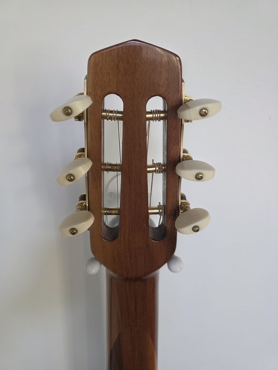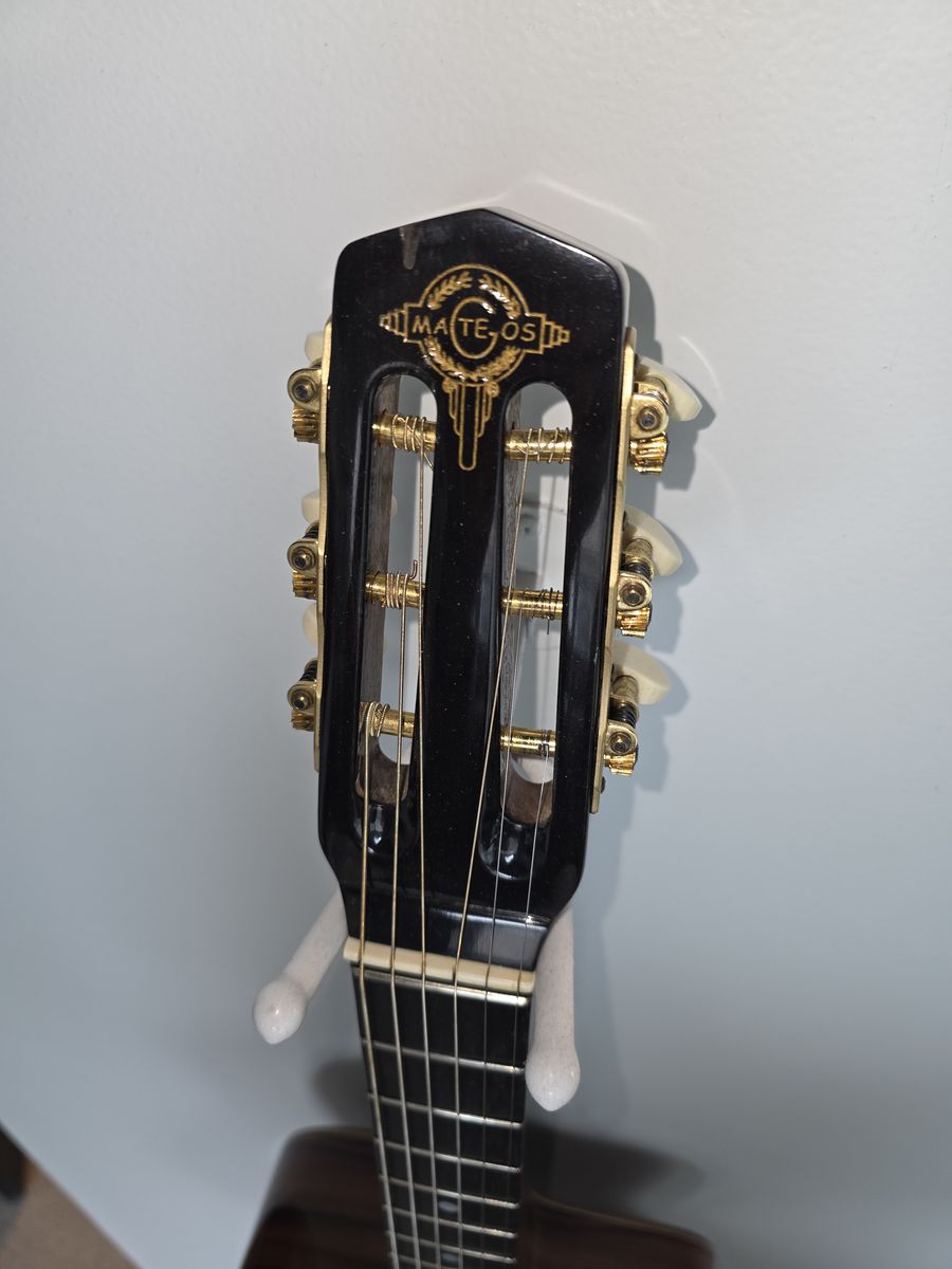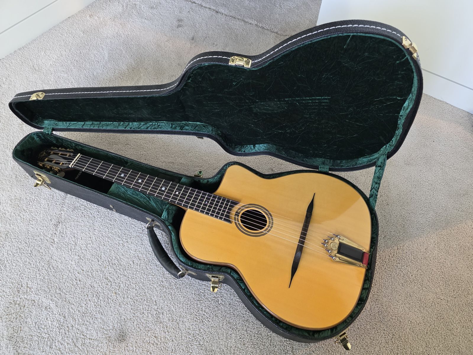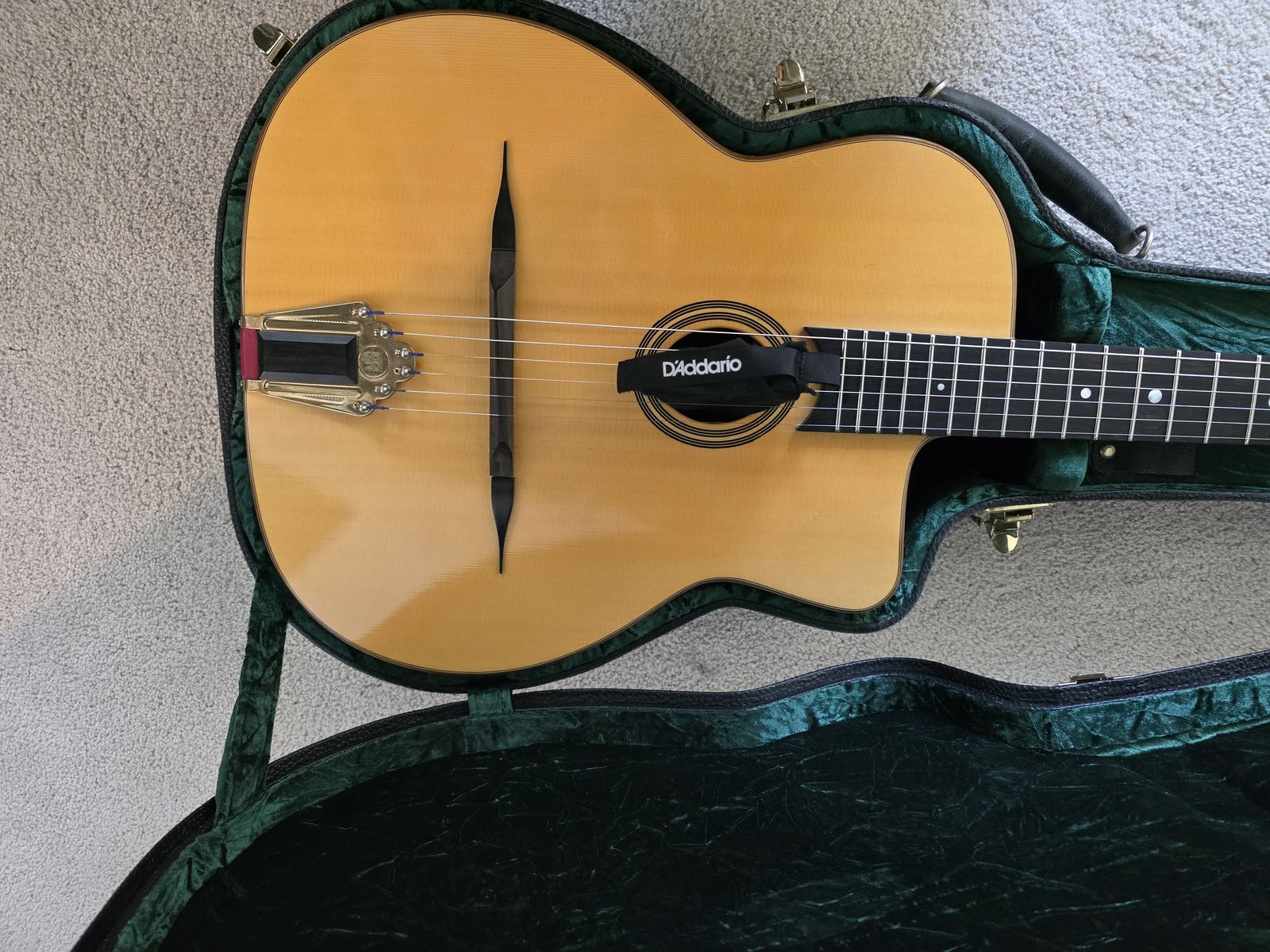 Geronimo Mateos has long been one of the leading Selmer Maccaferri style luthiers in Spain. Based in Madrid, his guitars are played worldwide by such notably luminaries as Angelo Debarre, Tchavolo Schmitt, and Gonzalo Bergara. Angelo Debarre played a Mateos guitar on the CDs "Come Into My Swing," "Entre Amis," and "Memoires," (Tchavolo Schmitt plays one as well on "Memoires") and Gonzalo Bergara played a Mateos built guitar on the CD Porteña Soledad. Some of his earlier instruments were rebranded as "Gallato" but were built in the same shop as this Mateos instrument.
