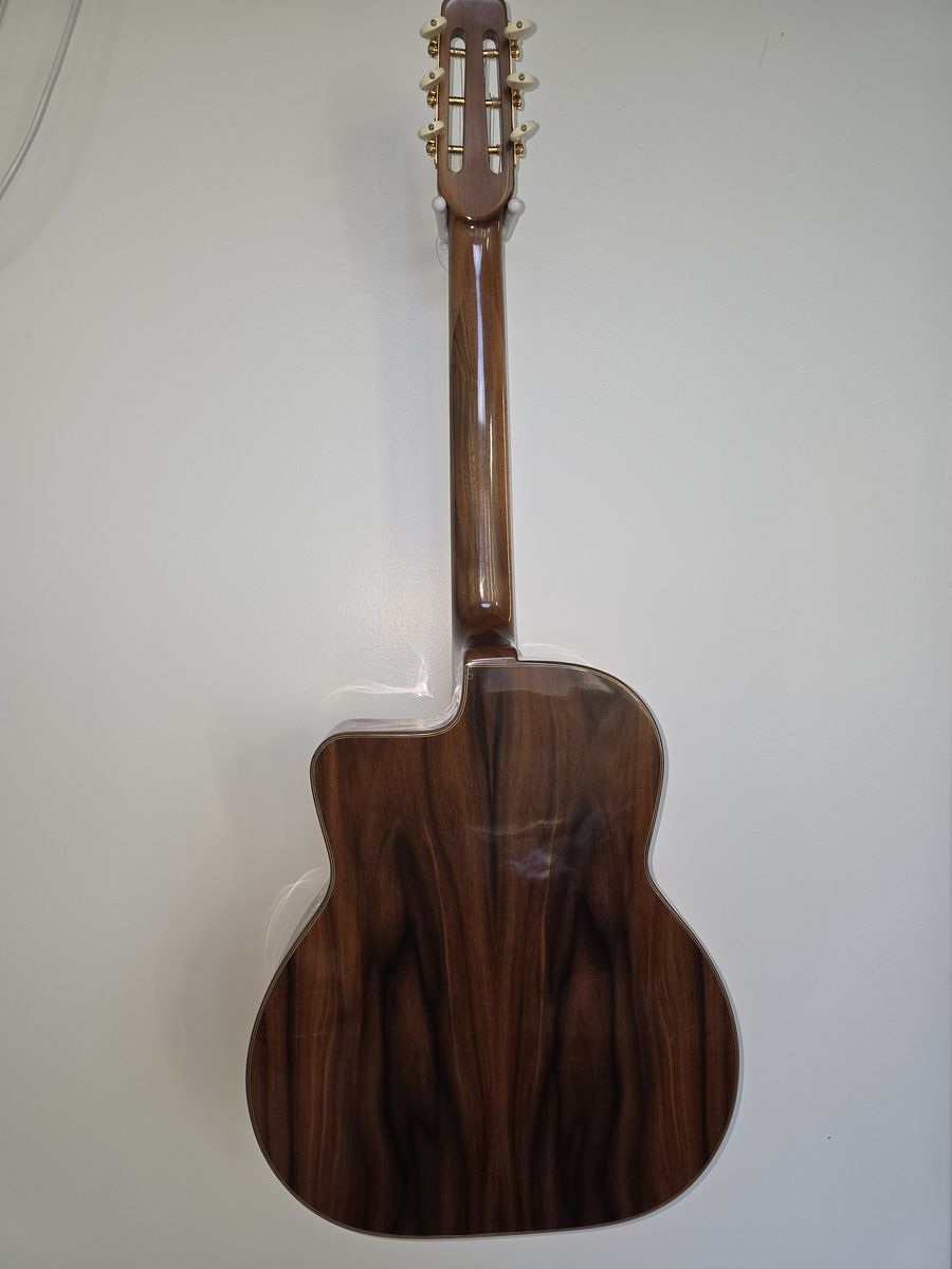 The Jazz A model is a Selmer copy so it has all the specs you'd expect of a classic Gypsy guitar. The comfortable 15 3/4" body is constructed of highly figured palo santos and the 670mm scale walnut neck features a modern, ergonomic profile. The top is European spruce which has been tastefully tinted to give the guitar the look of a finely aged instrument.