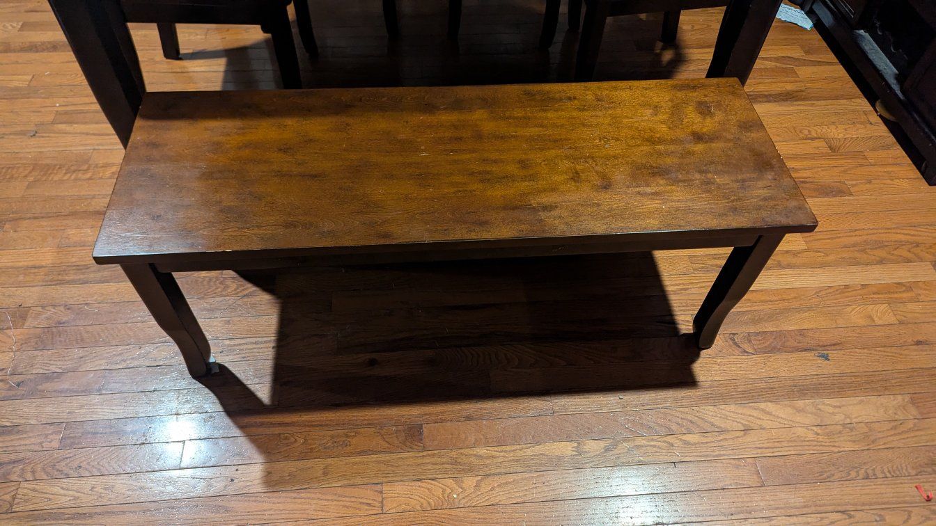 Make an offer for this well used dining table with leaf , 4 chairs and bench. There are knicks, scuffs, and other imperfections but it is wood and could be refinished. Price says $50 but I am willing to take offers