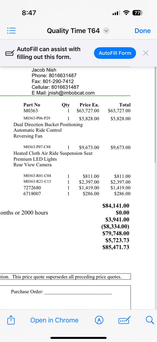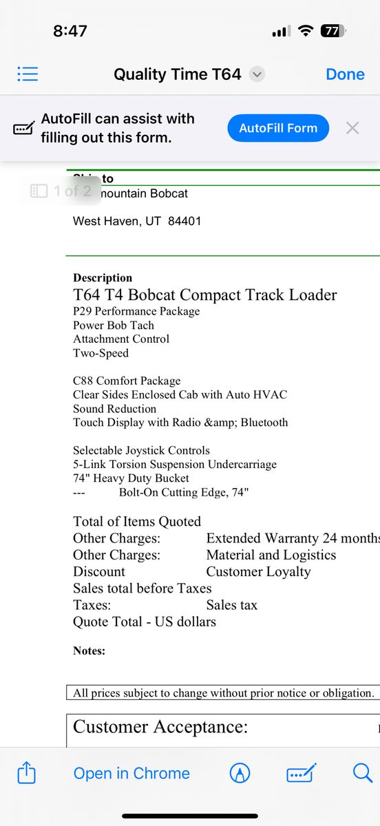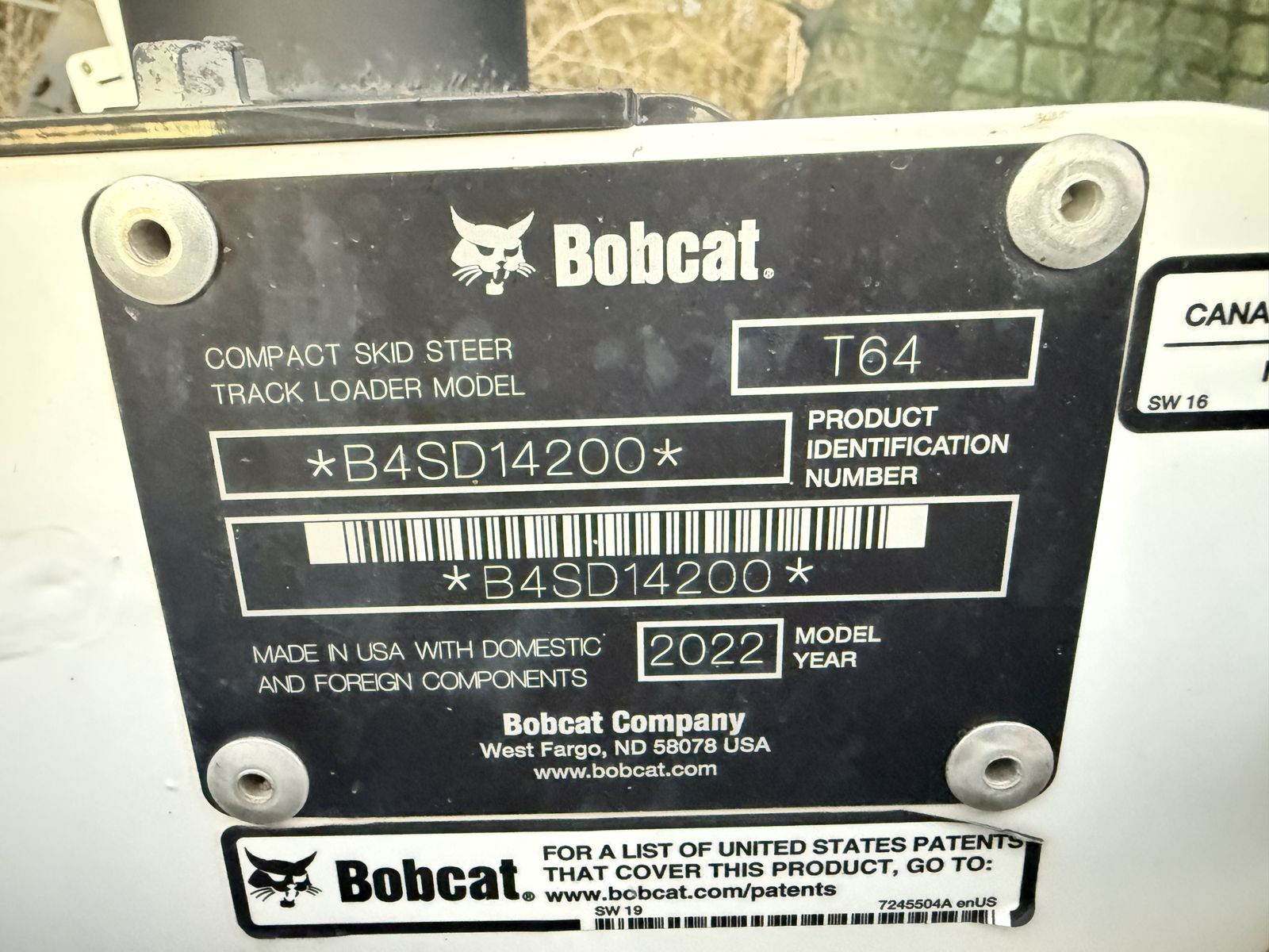 2022 T64 Track loader 684 hrs with bucket and forks. Loaded with 5 link suspension, rear camera, bob tach hydraulic attachment system, 68hp t4 engine, Auto bucket leveling, auto AC/heat, sound Reduction, Bluetooth radio. Super clean like new. Original invoice with all info attached in photos.