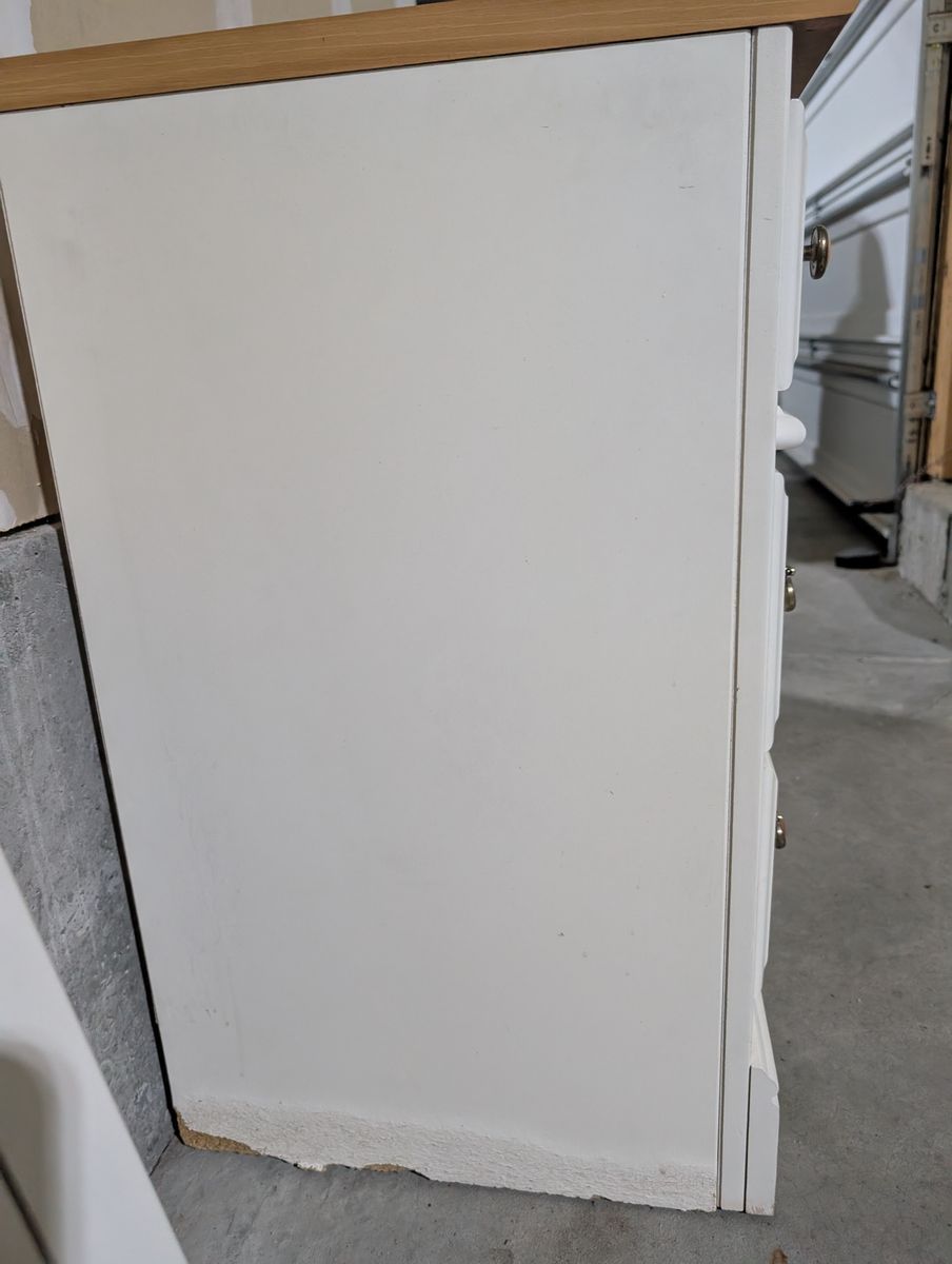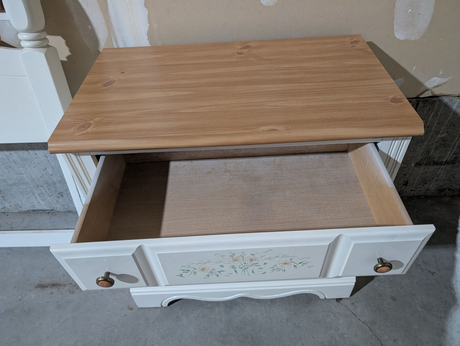 All drawers are clean (no marker/paint/gum, etc.) and work perfectly. Really solid and great quality. On the nightstand there is some water damage along the base (shown in picture). Otherwise, really great condition!