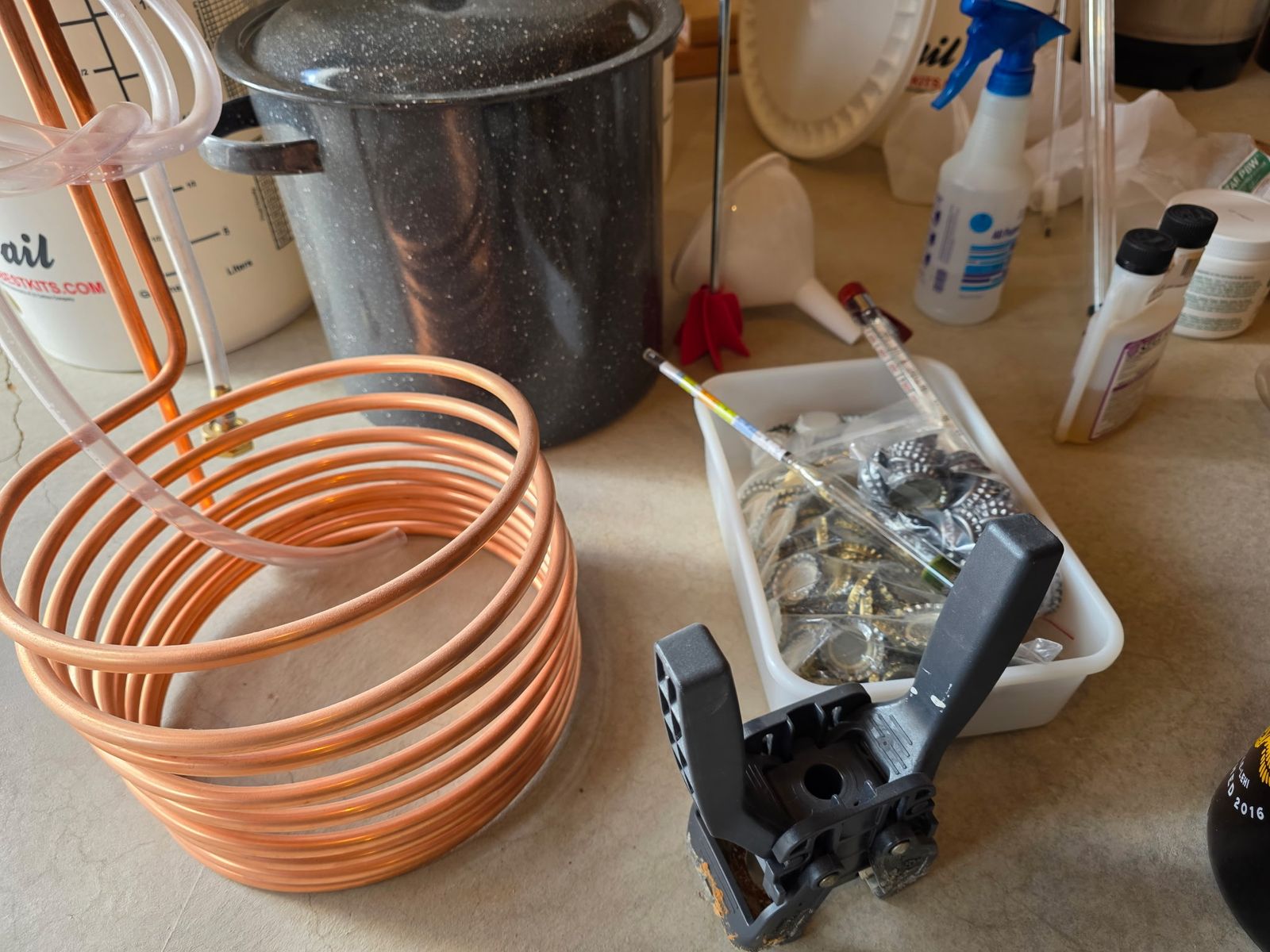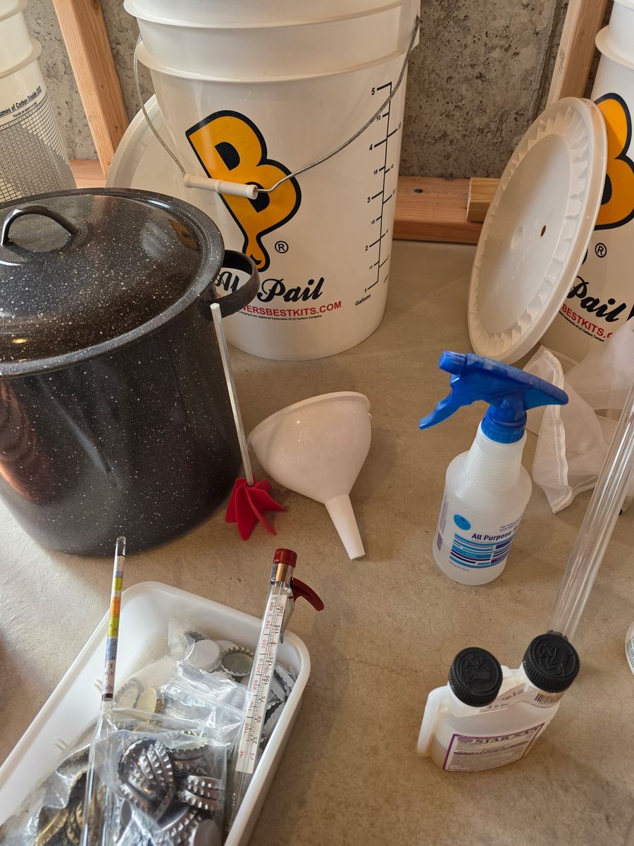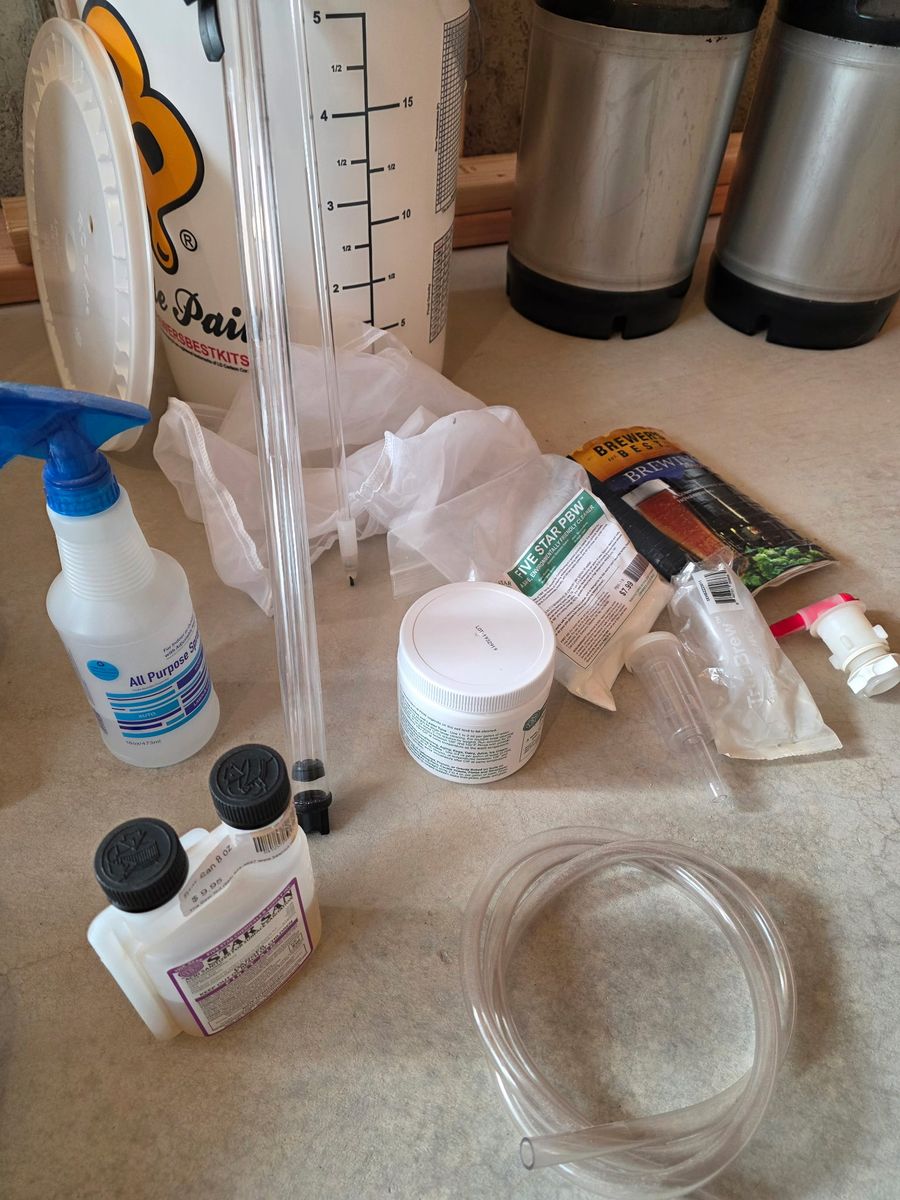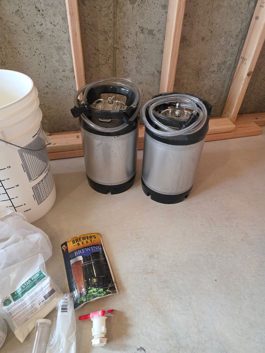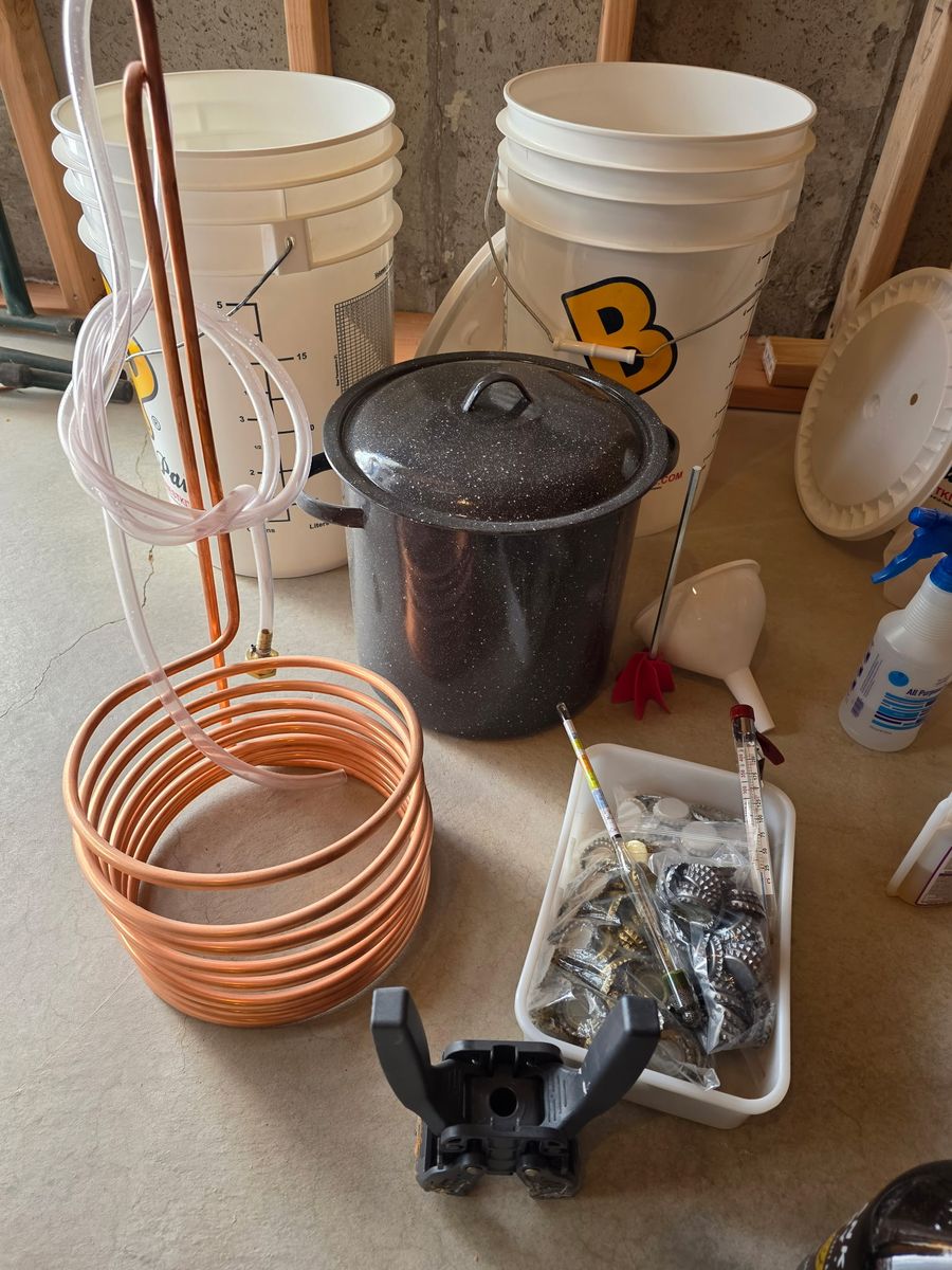 Everything you see in the pictures is included Buckets, lids, air locs, mixer, pot with chiller, two 2.5 gallon kegs with picnic tap and co2 tank gauge, Hydrometer, bottle cap crimper, with tons of bottle caps, thermometer, some cleaners, self priming transfer pump, I’m sure I’m missing stuff. There is everything here you need to make home made beer from kits. I have made a lot of batches with what is here. If I was to add it all up there is $700-$800 in stuff. I will sale it all together for $400 obo will not separate anything. All or none. Call or text no email