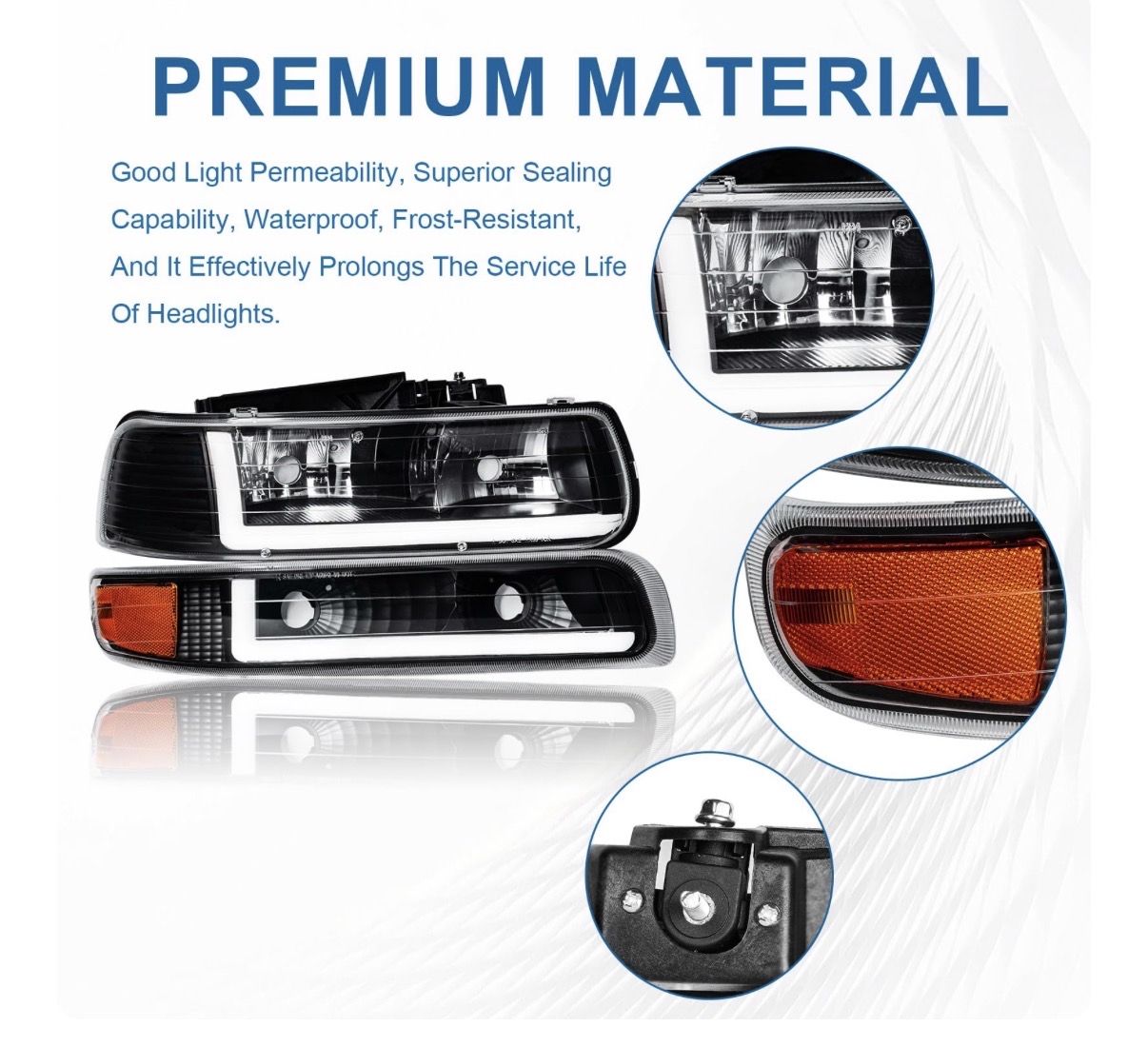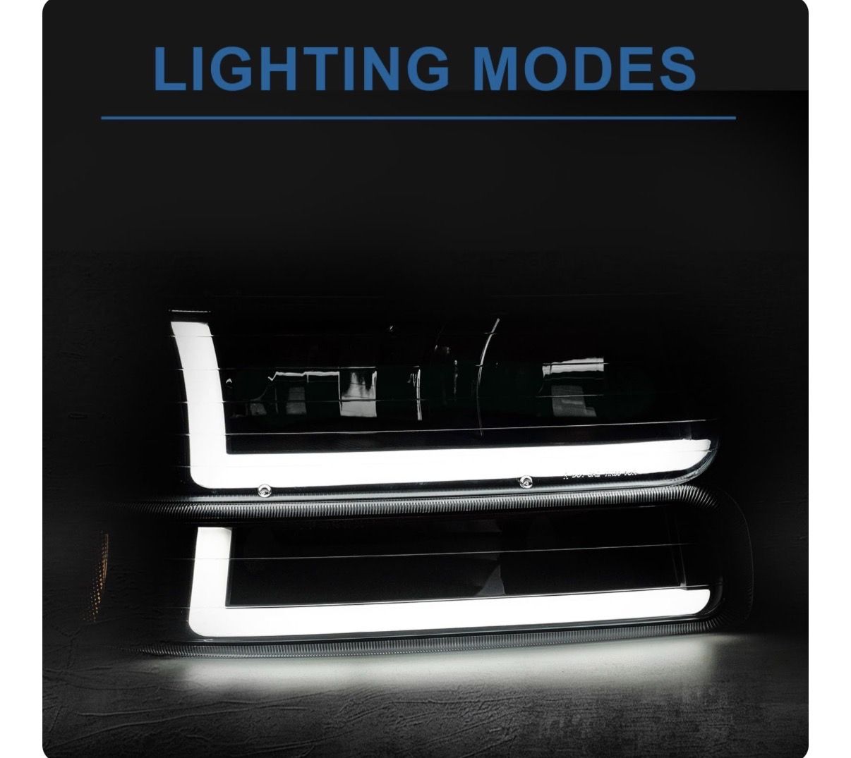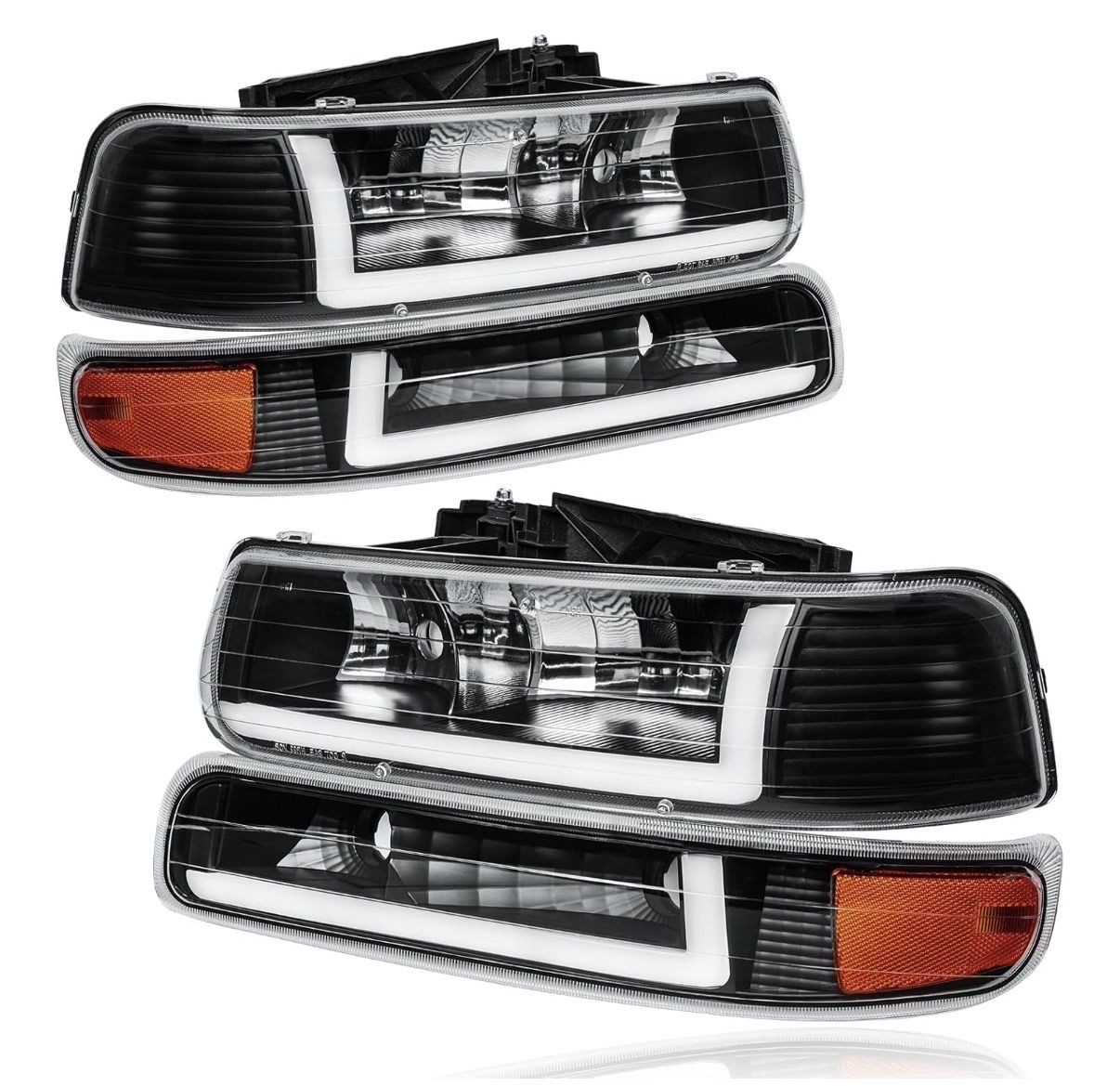 Fullux LED DRL Headlights Assembly for 1999-2002 Chevy Silverado 1500 2500 1500HD 2500HD 3500/2000-2006 Tahoe Suburban 1500 2500 Replacements Amber Reflector Black Housing