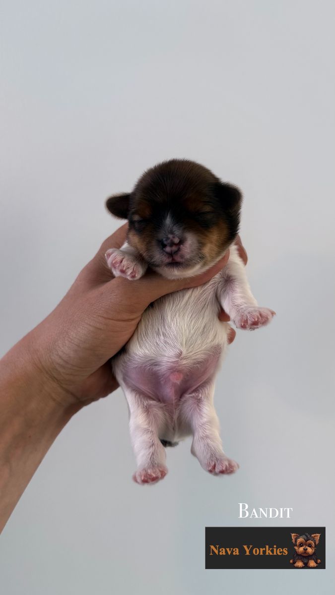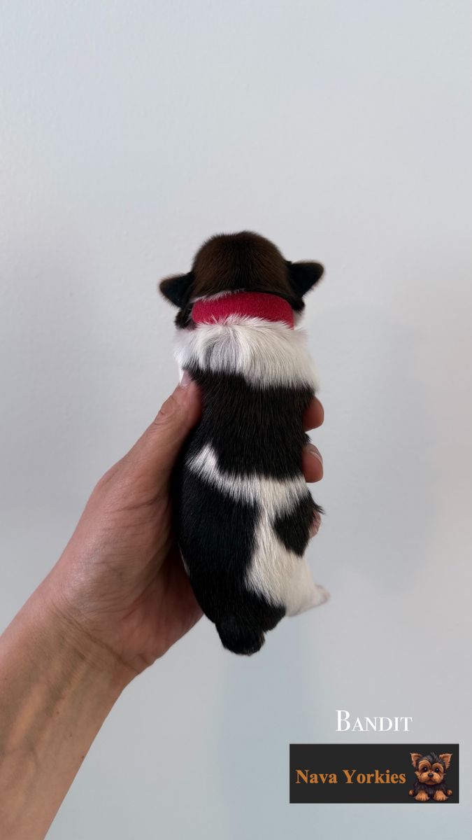 Bandit – Black & Tan Parti Male – $3,000 (White with black patches + tan points – very unique markings)