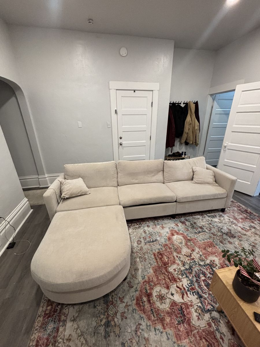 Super comfy couch We are moving and doesn’t fit anymore L: 9feet W: 3 feet H: 32 inches Ottoman L: 3feet W: 3 feet H: 16 inches