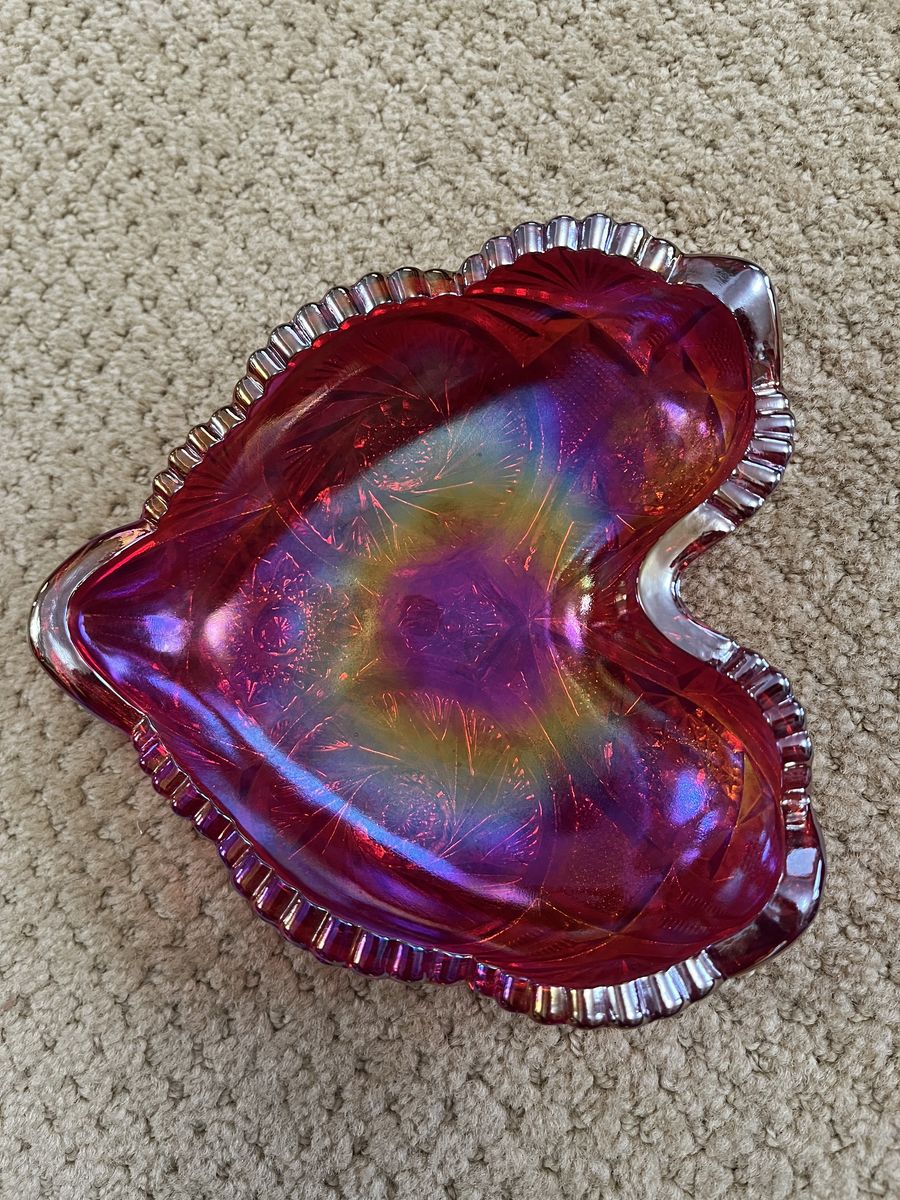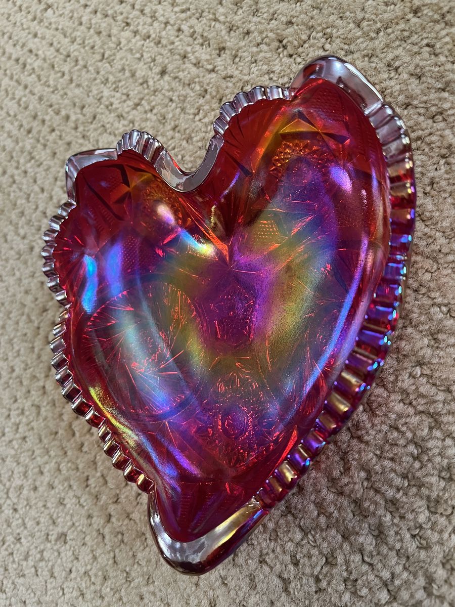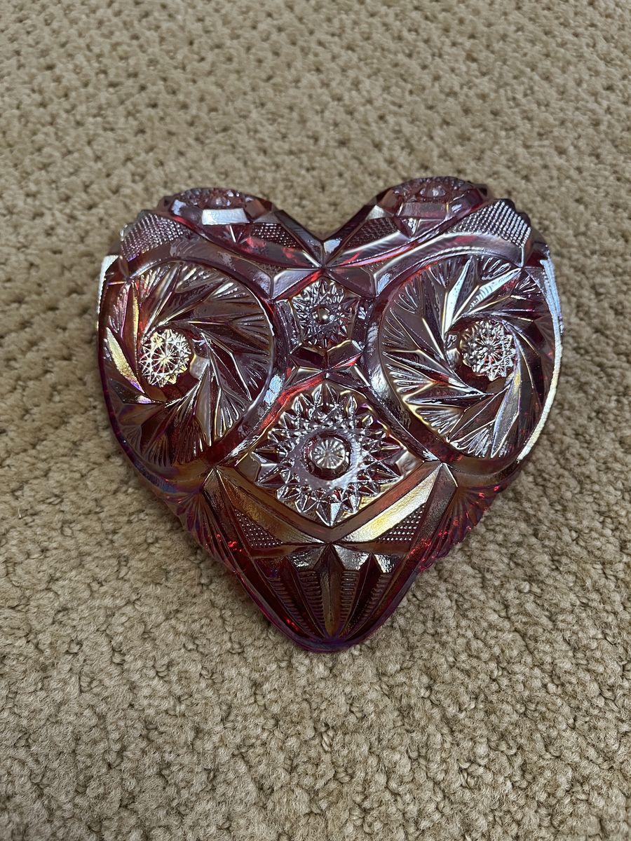 VenmoThis is a gorgeous red heart. Red is one the most collected and soft after colors in this stunning carnival glass. This is a reddish orange with blue and gold shimmers. Carnival glass is sometimes called rainbow glass, taffeta glass, or even poor mans Tiffany glass. This was first made in about 1908 by the Fenton Art Glass Company. They used iridescent metallic salts poured into the hot glass. Tiffany was selling to the rich, so Fenton wanted to sell to the middle class. They went to where the middle class were. One of the places was fairs and carnivals. Pieces of glass were given away, as novelty prizes. This turned out to be a genius marketing compaign and the sale of carnival glass was a huge hit. This is a really beautiful must see piece. It measures 6 inches wide x 6 1/4 inches tall x 1 1/2 inches deep. This bowl/dish is in excellent condition. Selling for a parent. Price is firm.