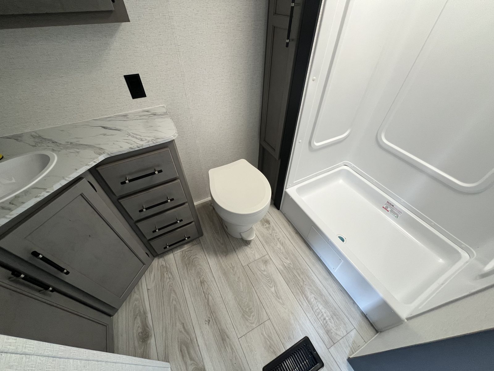 This rear bath floorplan is perfect for camping. Fully loaded with a tankless water heater, solar, power tongue jack and so much more.
