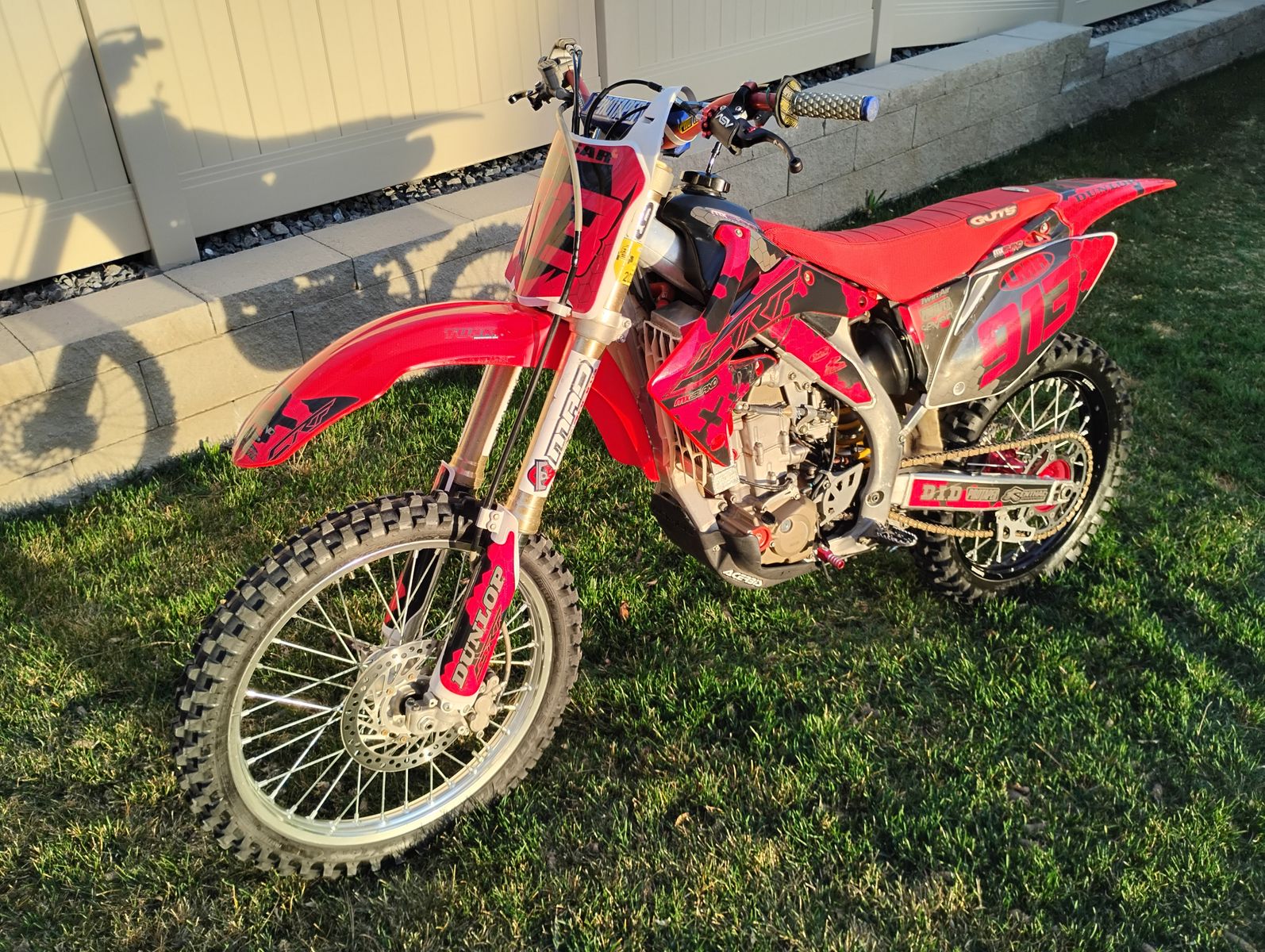 Equipped with: Full Yoshimura titanium exhaust, Boyesen Quickshot 2 accelerator pump, GPI high capacity radiators, red silicon radiator hoses, oversize fuel tank, ASV levers, new motion pro clutch cable, Motion Pro Revolver throttle kit with new throttle tube, acerbis skid plate.