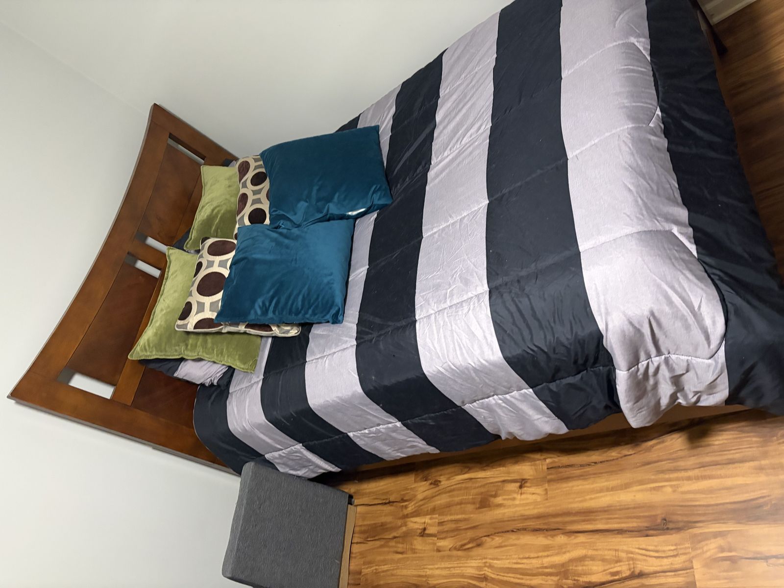 ApplePayFull Bed with bedding, box spring, mattress, and bedframe.