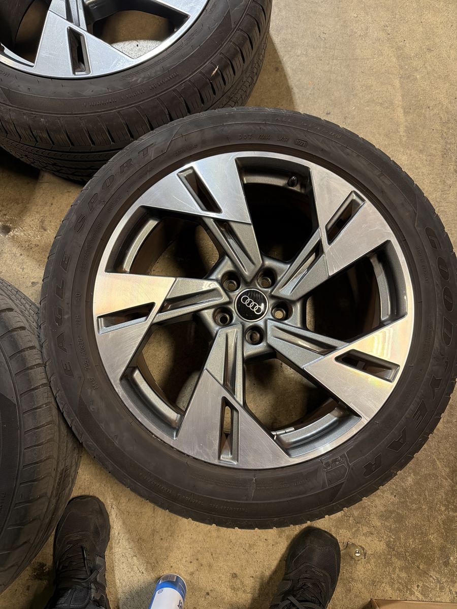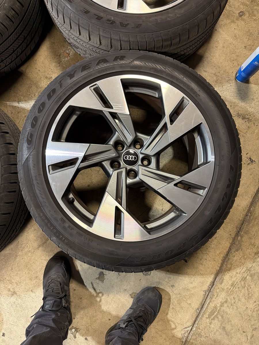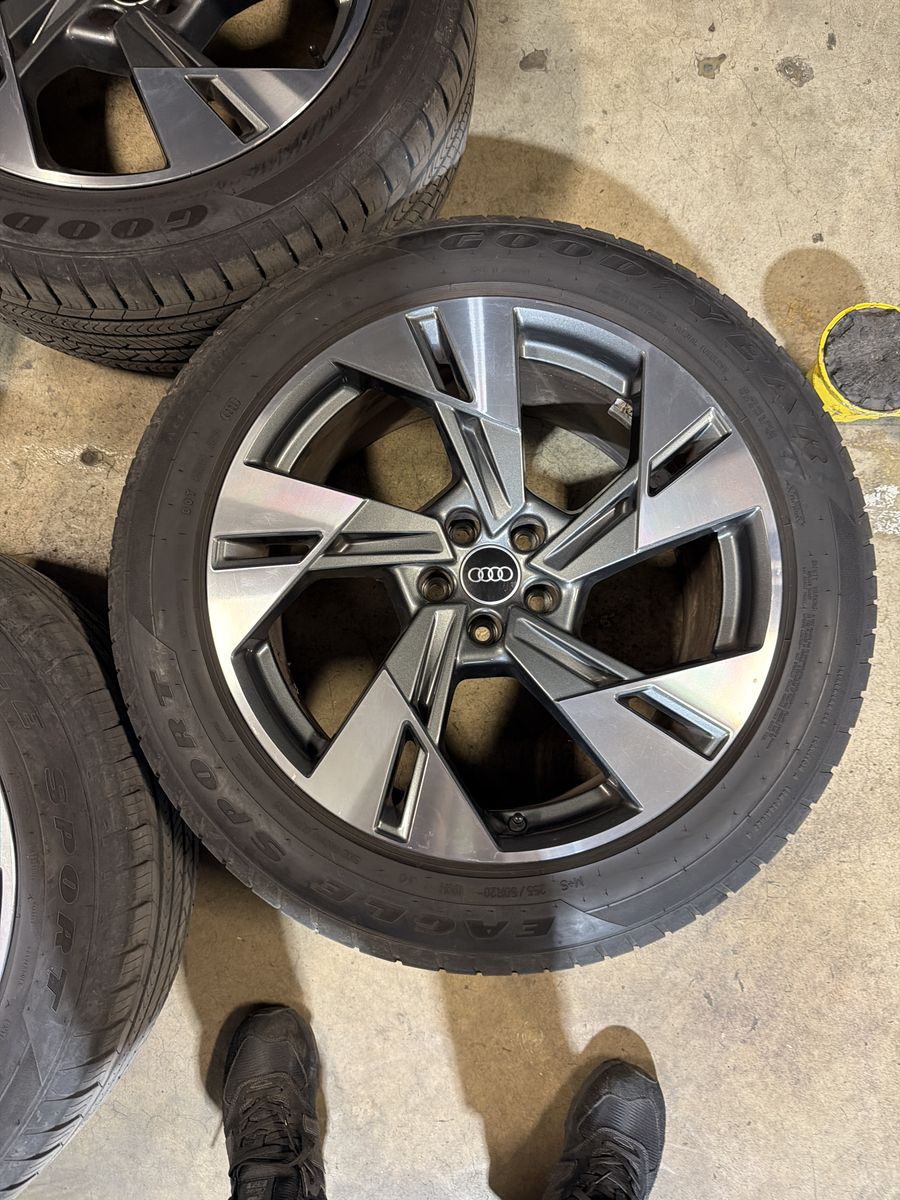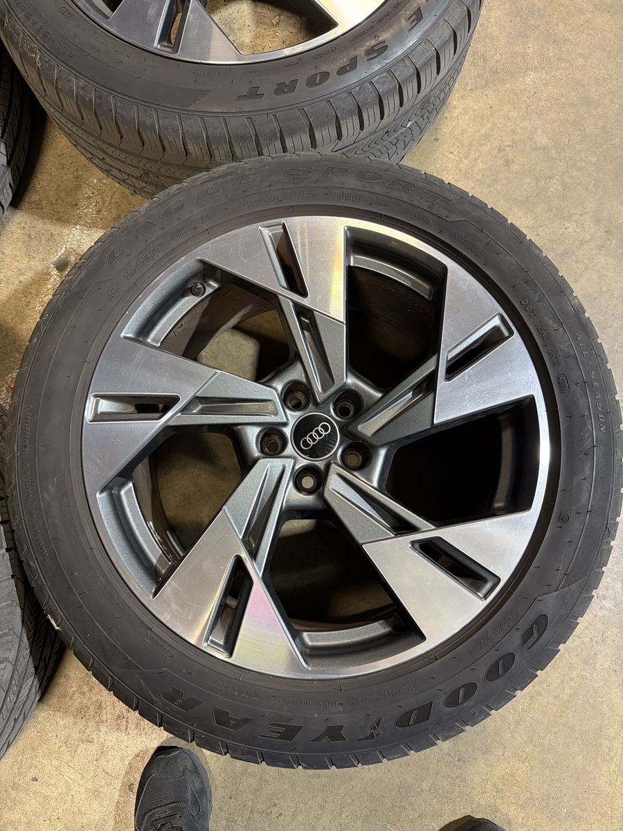 4 oem audi e-tron suv rims and Goodyear all season tires. Great condition removed from a clean title car we upgraded the wheels on. Tires are all matching 8-9 32nds of tread. We just balanced these so they are ready to bolt up and go!
