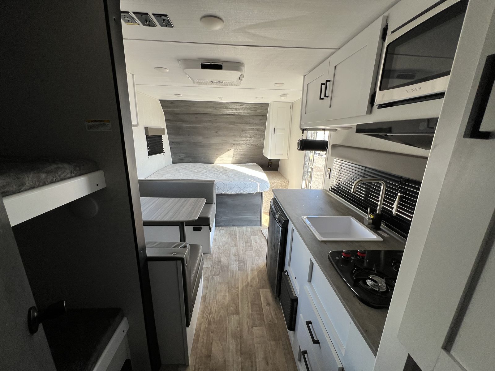 This bunkhouse sleeps up to 6. KEEPS IT SUPER SIMPLE WITH NO SLIDEOUT. It does come with solar! 1 YEAR WARRANTY.