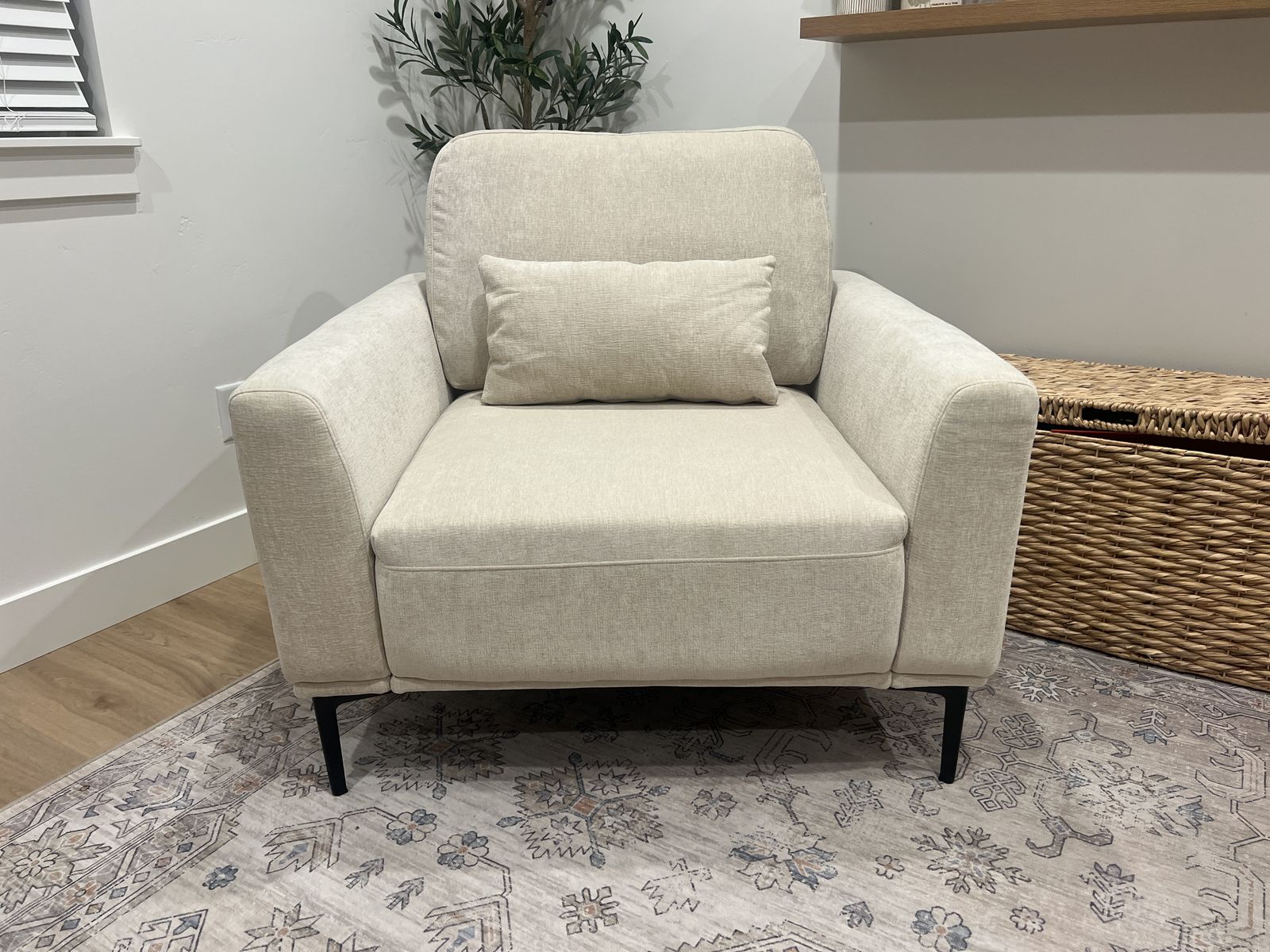 VenmoBrand new. Assembled this week. Very soft cushions and beautiful color. Also slightly reclines as shown in the video! Dimensions in the Amazon photos.