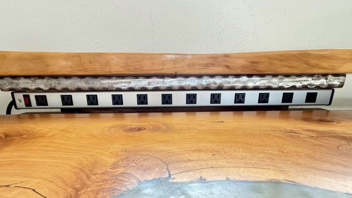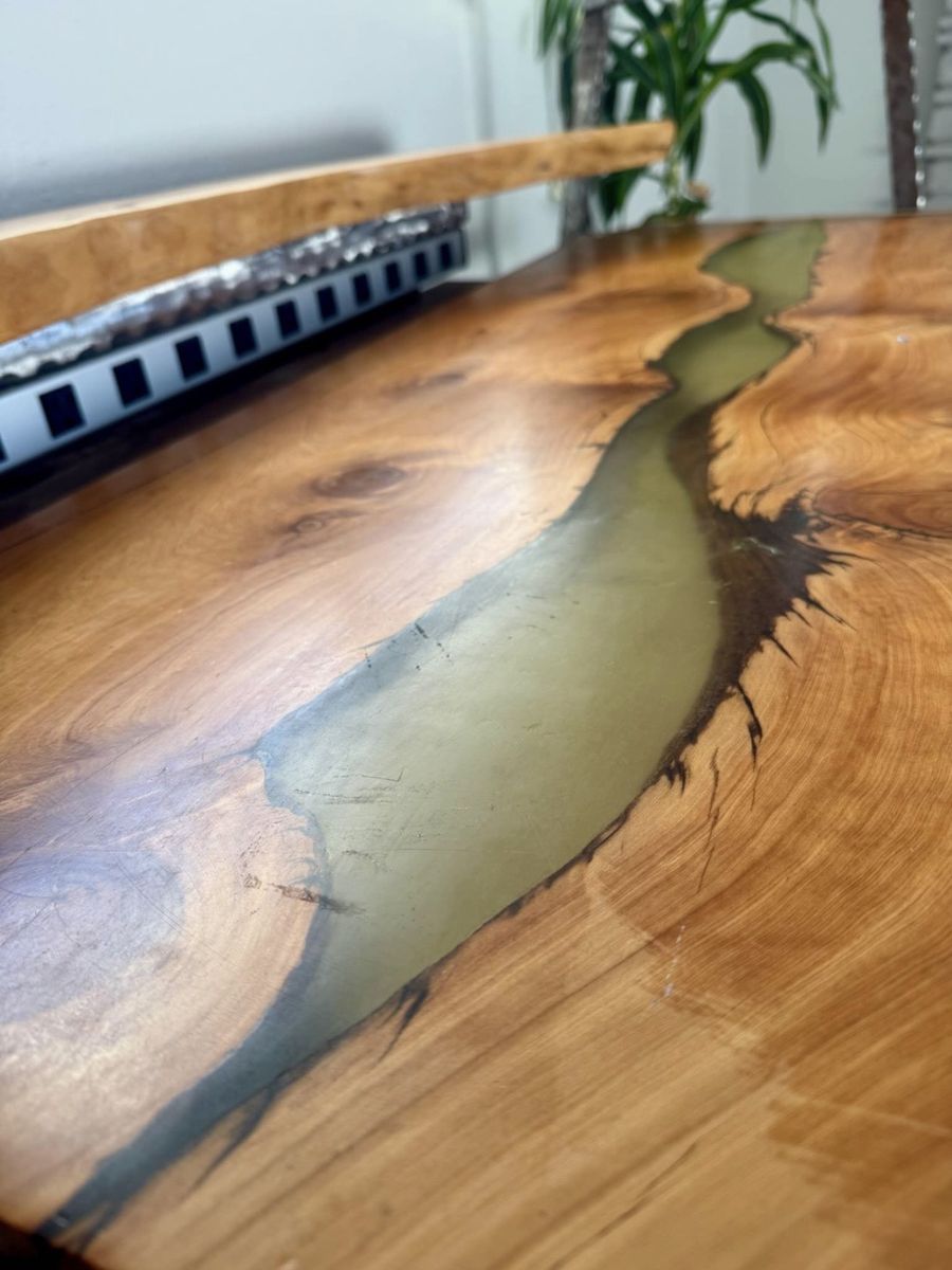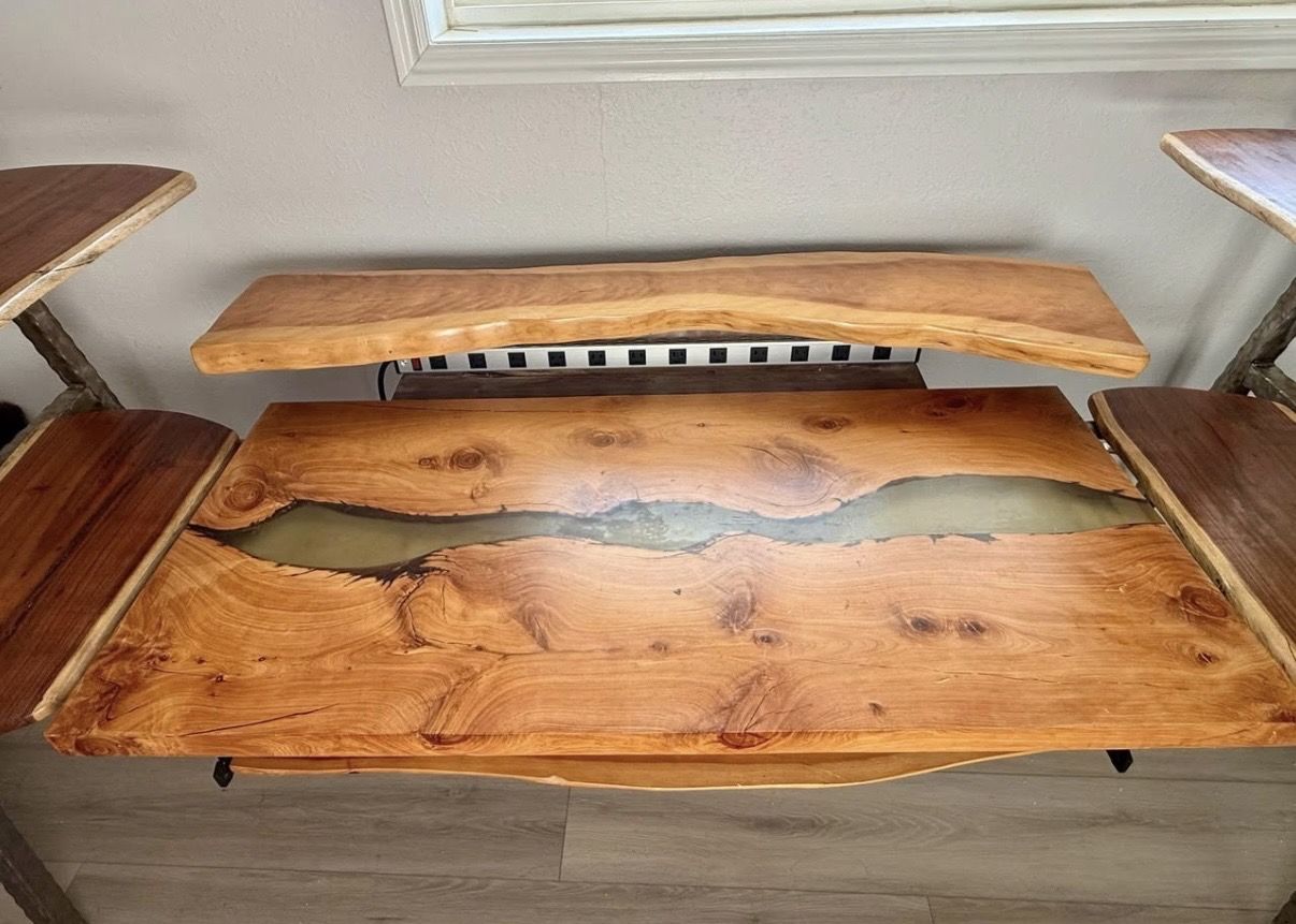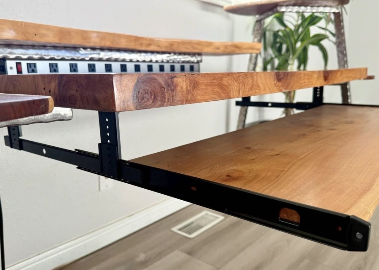 Features: • Gorgeous main wooden surface + epoxy • Hand-forged steel frame ️ • Solid live-edge hardwood surfaces 🪵 • Integrated keyboard tray ️ • Raised monitor shelf ️️ • Built-in power strip (multiple outlets) • Side shelves for gear, speakers, plants, or controllers 🪴 • Extremely sturdy and well balanced • Modular layout suitable for studio, office, or creative workspace Built to last decades. Easily adaptable for: • Music production studios ️️ • Audio / video editing ️ • Creative offices • Statement home workspaces Condition: Excellent structural condition. Minor cosmetic wear consistent w studio use. Important: • Heavy piece — two adults required to lift • Pickup only • Reasonable offers considered
