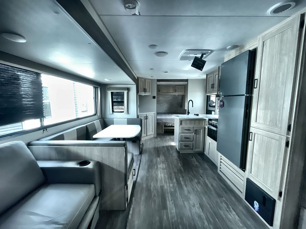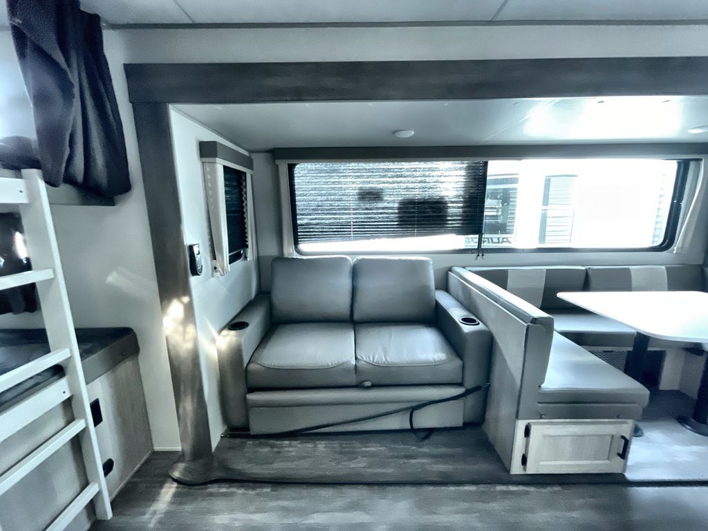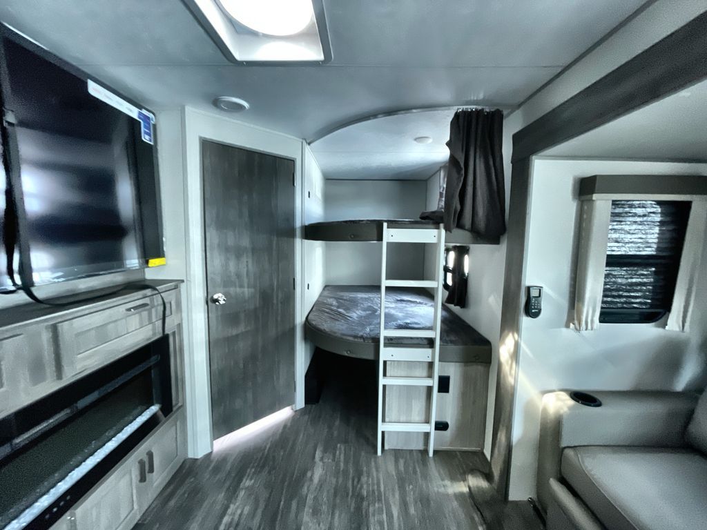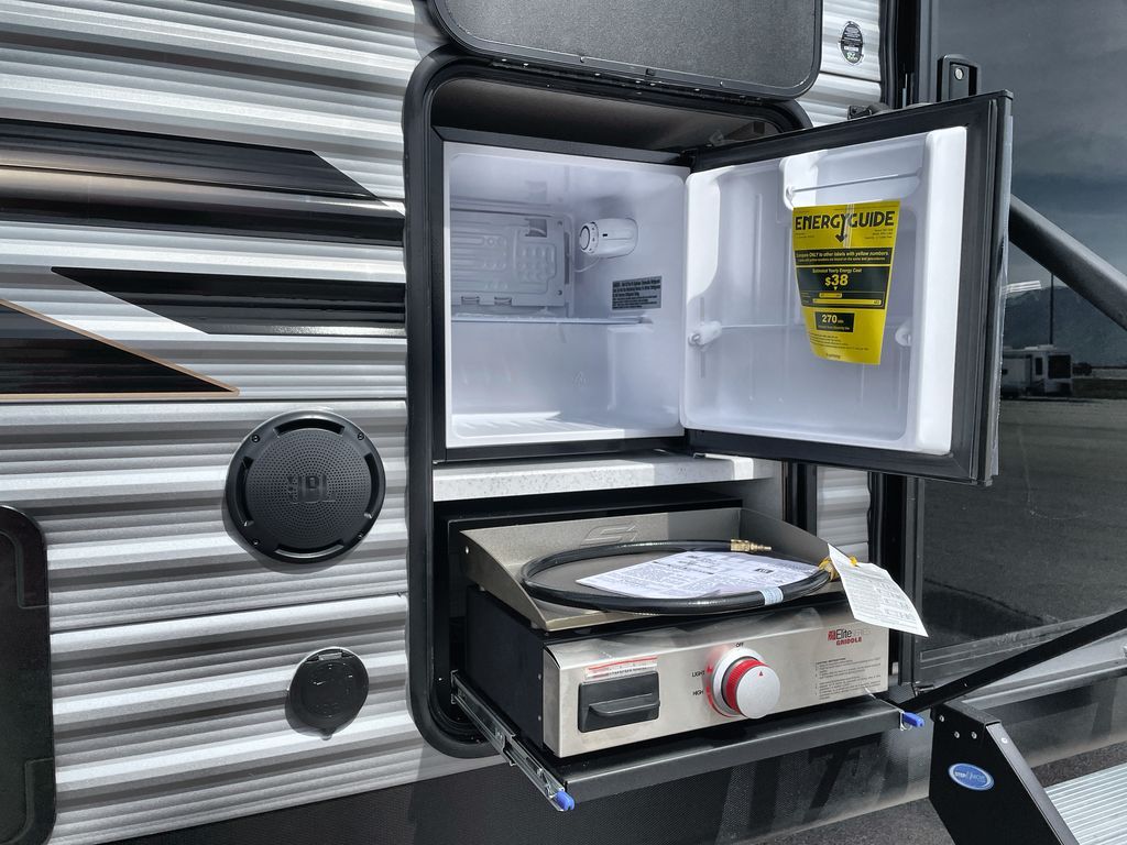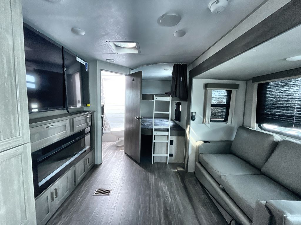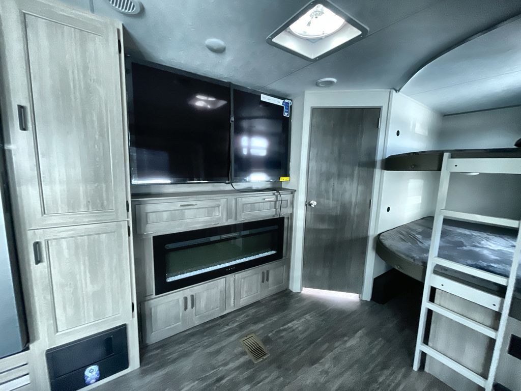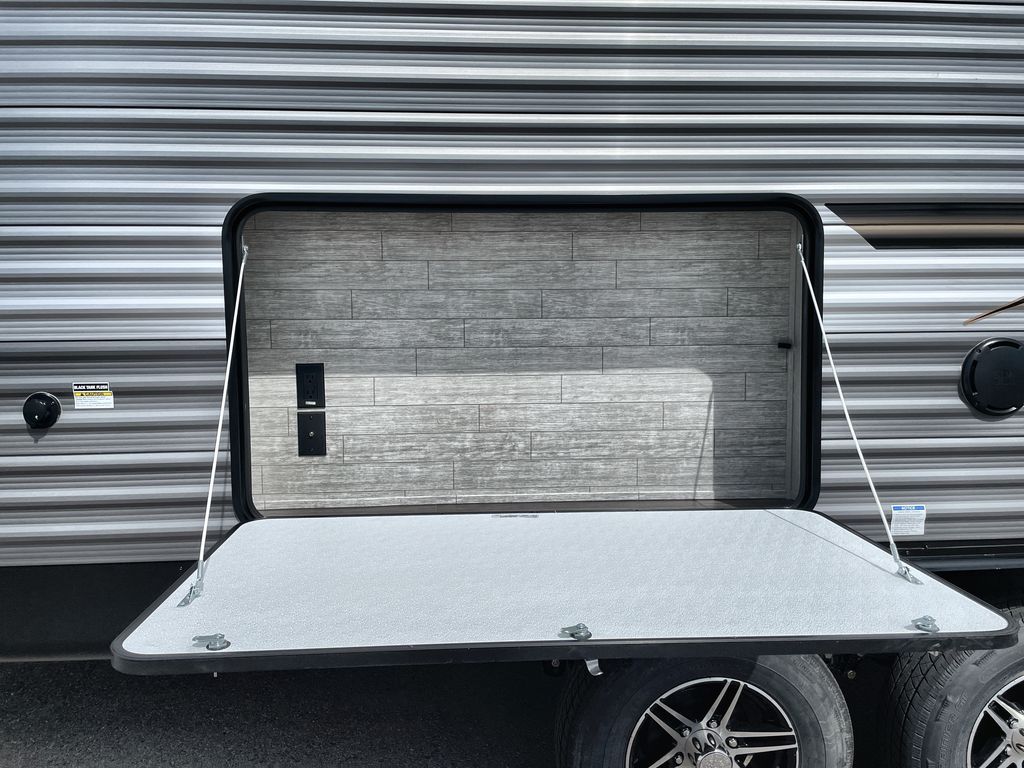 Life is easier in this travel trailer with dual entry doors! One of the entrances is right next to the front private bedroom which has a 60" x 74" queen bed with wardrobes on either side to keep your things tidy. The second entrance leads into the full bath, which also includes a full tub to make bathtime easier for little ones. The living area has everything you need for a cozy evening indoors between the 60" trundle sofa, U-shaped dinette, and entertainment center with a fireplace and 65" TV for cozy movie nights. Cook a sunrise breakfast at the outside camper kitchen with a griddle and mini refrigerator. There is also exterior storage with a fold-down table and a TV hookup if you plan to watch the big game outdoors!