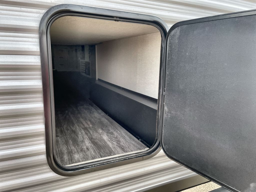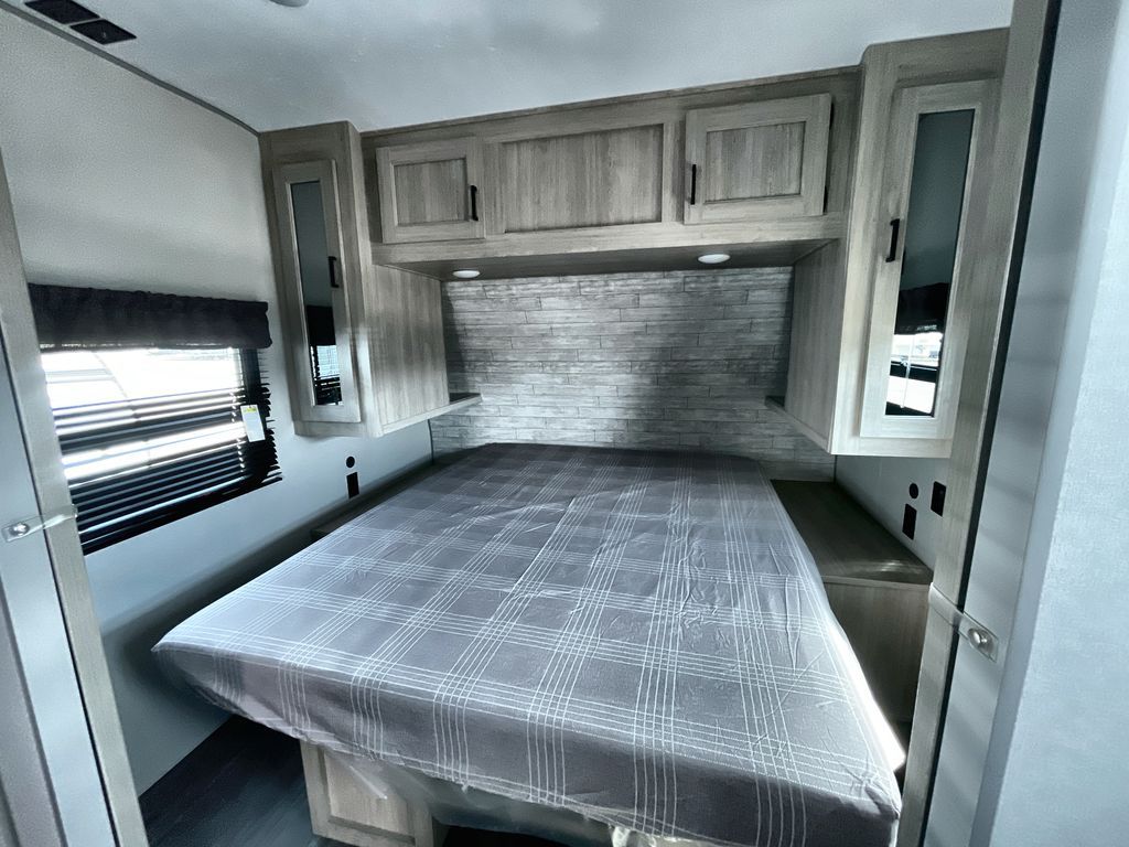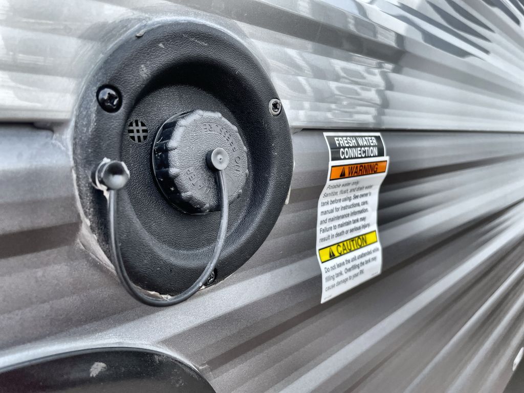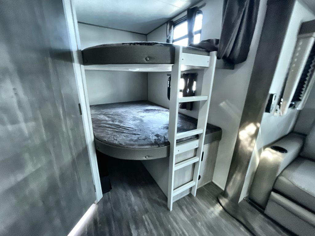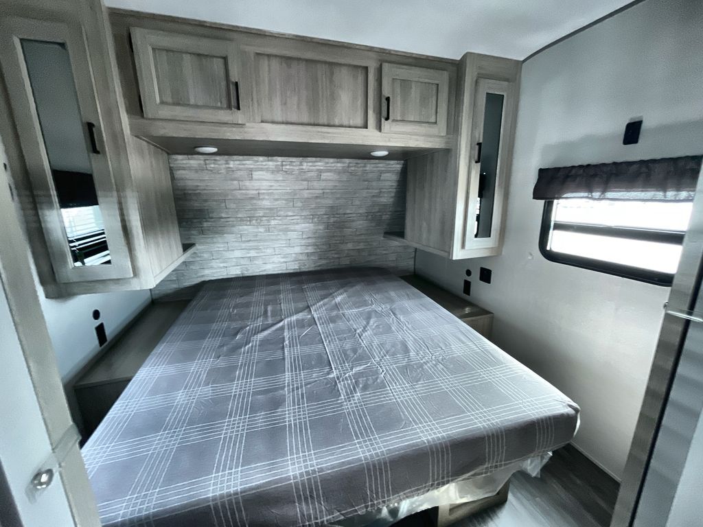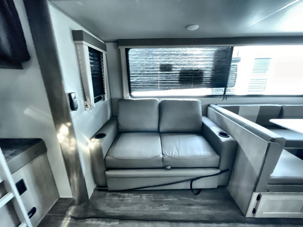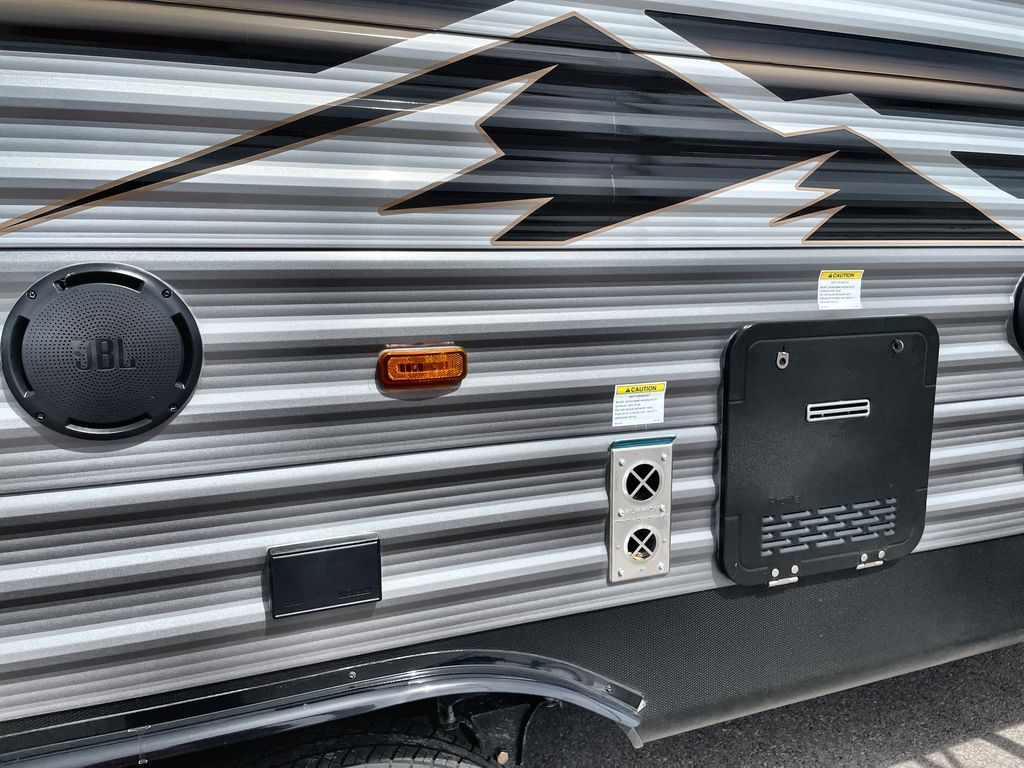 Life is easier in this travel trailer with dual entry doors! One of the entrances is right next to the front private bedroom which has a 60" x 74" queen bed with wardrobes on either side to keep your things tidy. The second entrance leads into the full bath, which also includes a full tub to make bathtime easier for little ones. The living area has everything you need for a cozy evening indoors between the 60" trundle sofa, U-shaped dinette, and entertainment center with a fireplace and 65" TV for cozy movie nights. Cook a sunrise breakfast at the outside camper kitchen with a griddle and mini refrigerator. There is also exterior storage with a fold-down table and a TV hookup if you plan to watch the big game outdoors!