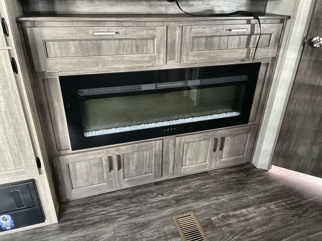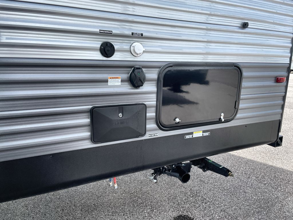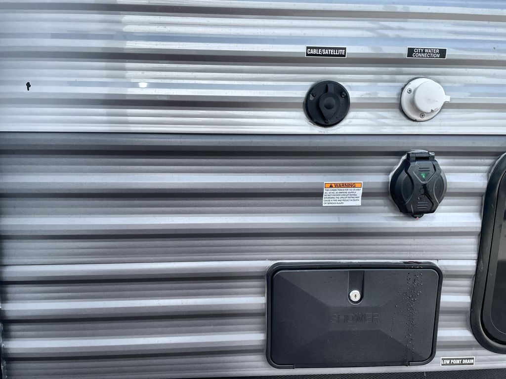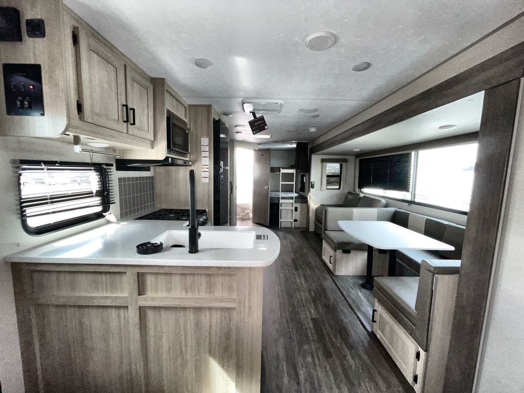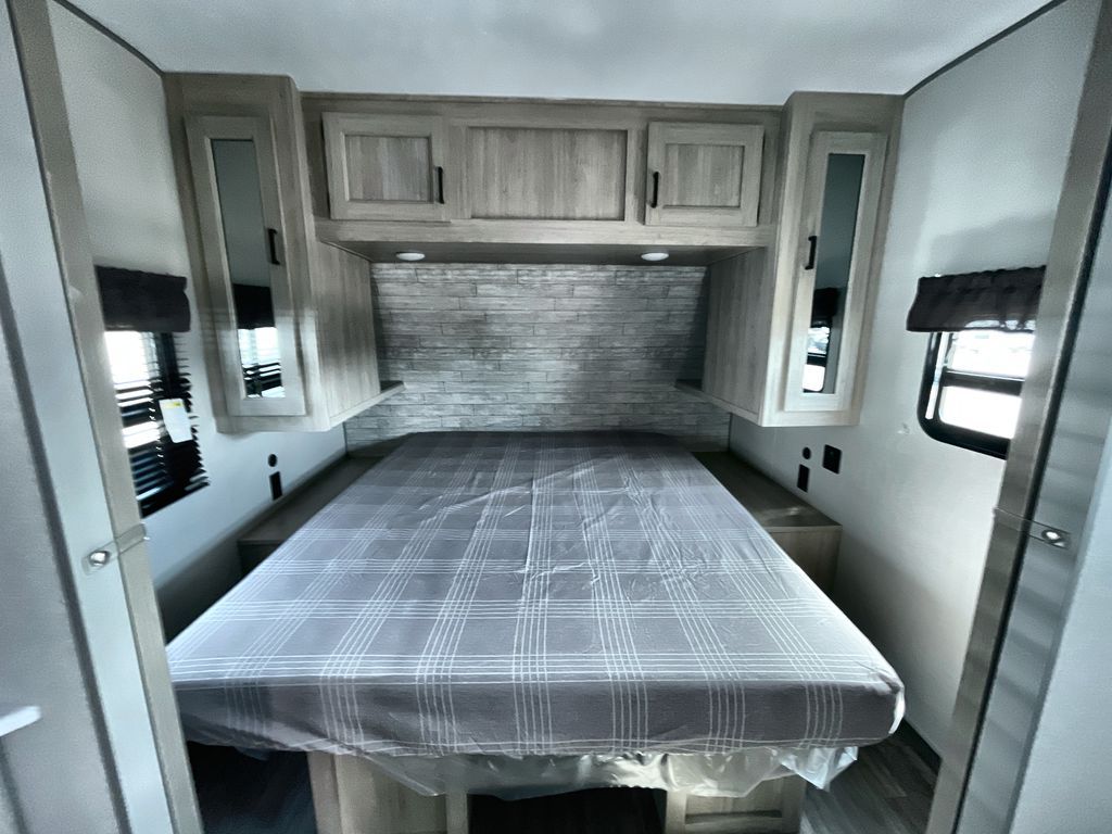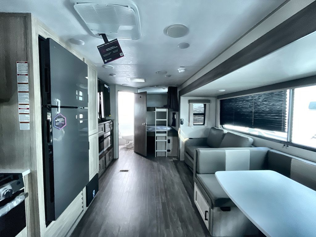 Life is easier in this travel trailer with dual entry doors! One of the entrances is right next to the front private bedroom which has a 60" x 74" queen bed with wardrobes on either side to keep your things tidy. The second entrance leads into the full bath, which also includes a full tub to make bathtime easier for little ones. The living area has everything you need for a cozy evening indoors between the 60" trundle sofa, U-shaped dinette, and entertainment center with a fireplace and 65" TV for cozy movie nights. Cook a sunrise breakfast at the outside camper kitchen with a griddle and mini refrigerator. There is also exterior storage with a fold-down table and a TV hookup if you plan to watch the big game outdoors!