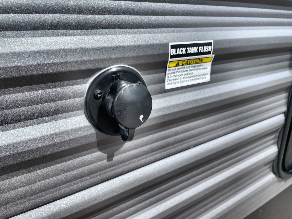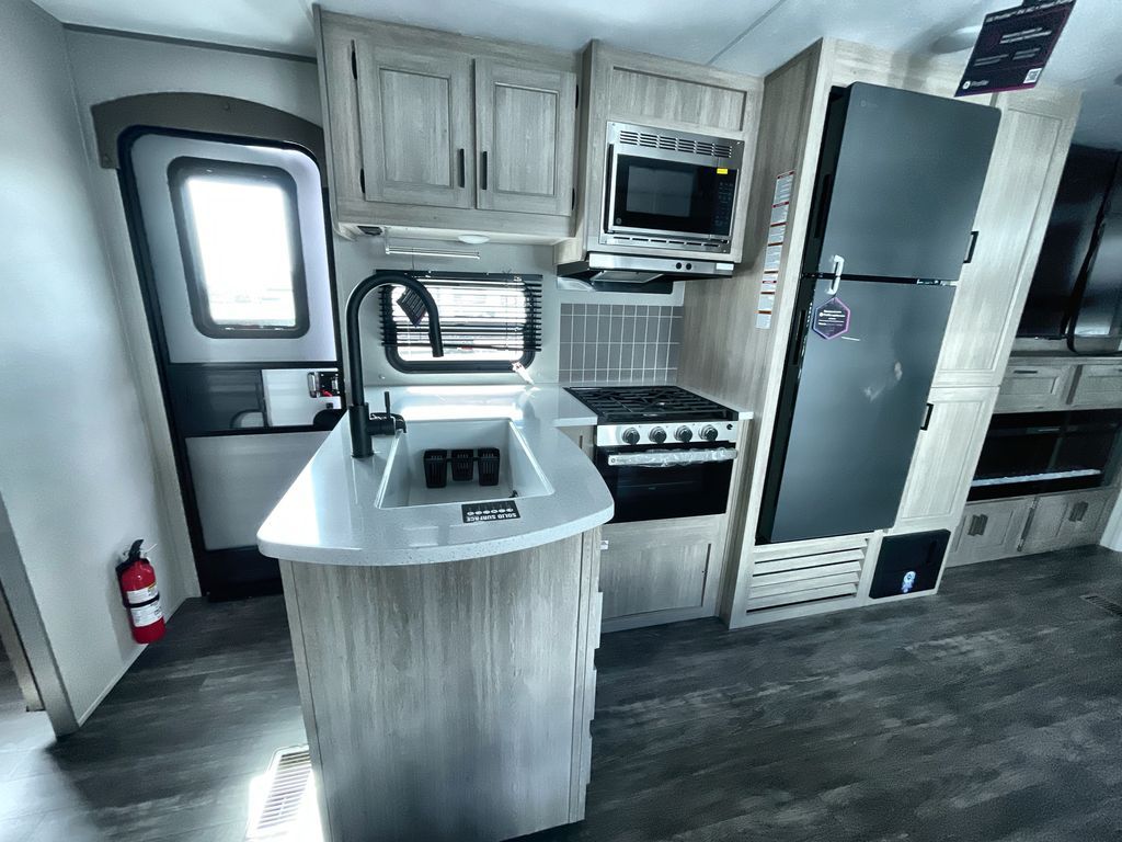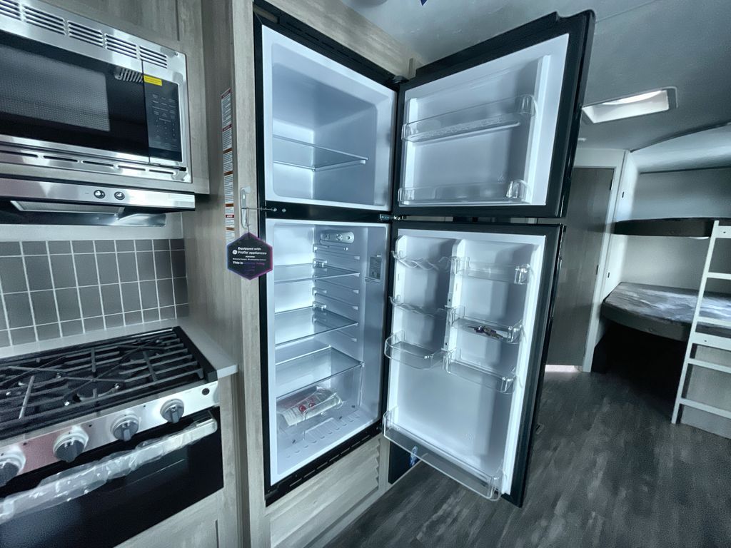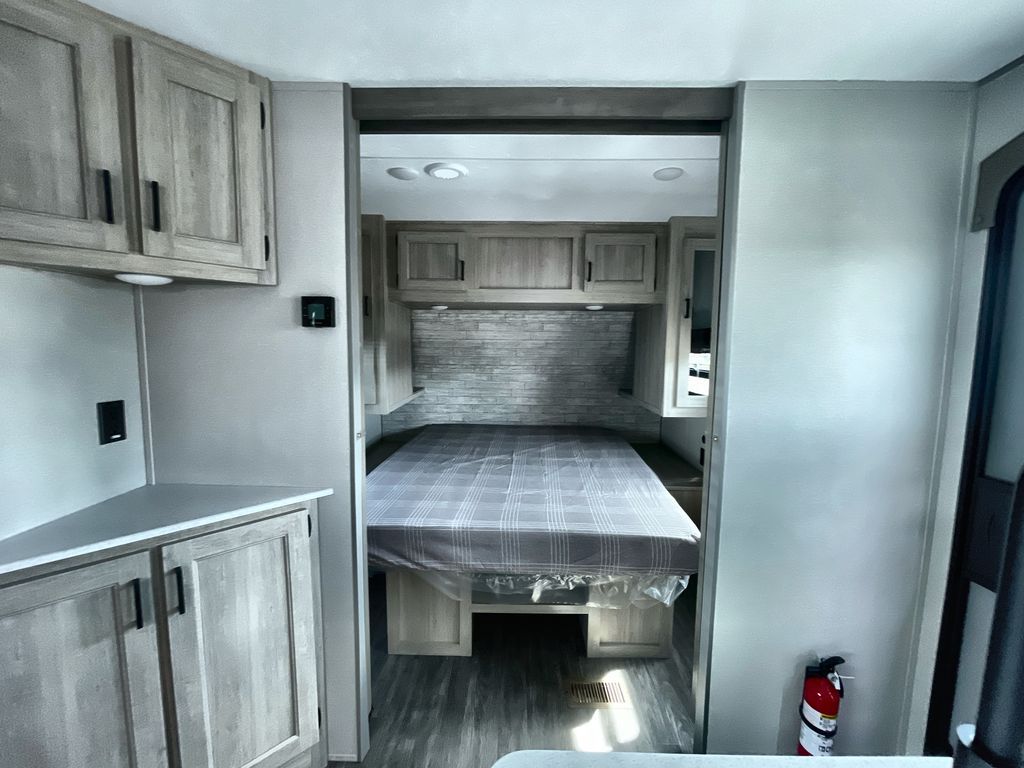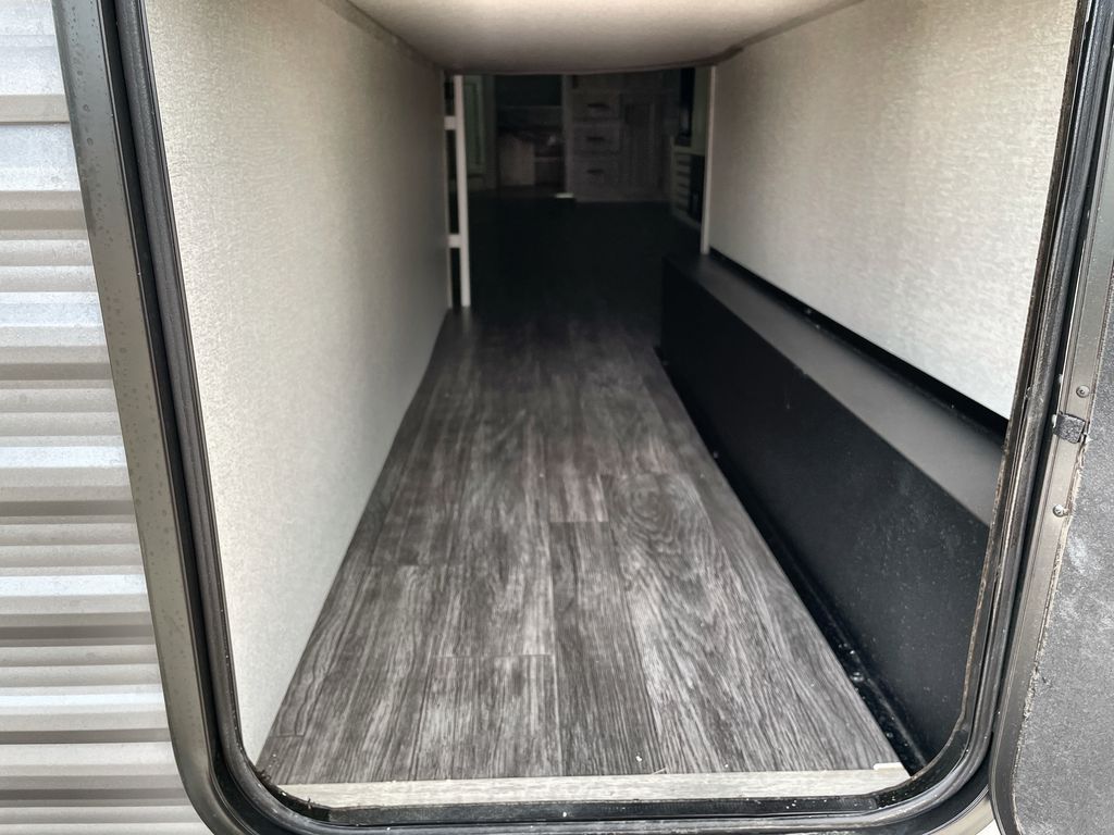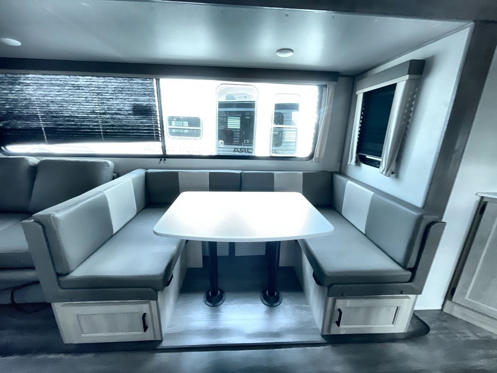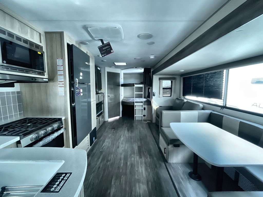 Life is easier in this travel trailer with dual entry doors! One of the entrances is right next to the front private bedroom which has a 60" x 74" queen bed with wardrobes on either side to keep your things tidy. The second entrance leads into the full bath, which also includes a full tub to make bathtime easier for little ones. The living area has everything you need for a cozy evening indoors between the 60" trundle sofa, U-shaped dinette, and entertainment center with a fireplace and 65" TV for cozy movie nights. Cook a sunrise breakfast at the outside camper kitchen with a griddle and mini refrigerator. There is also exterior storage with a fold-down table and a TV hookup if you plan to watch the big game outdoors!