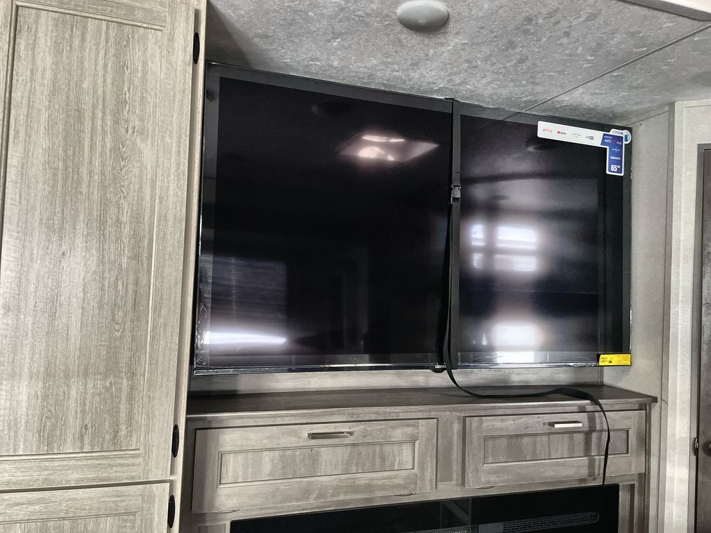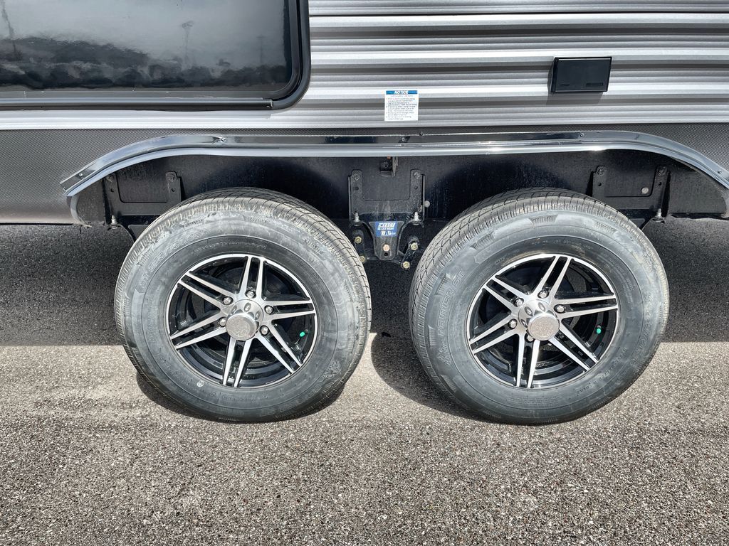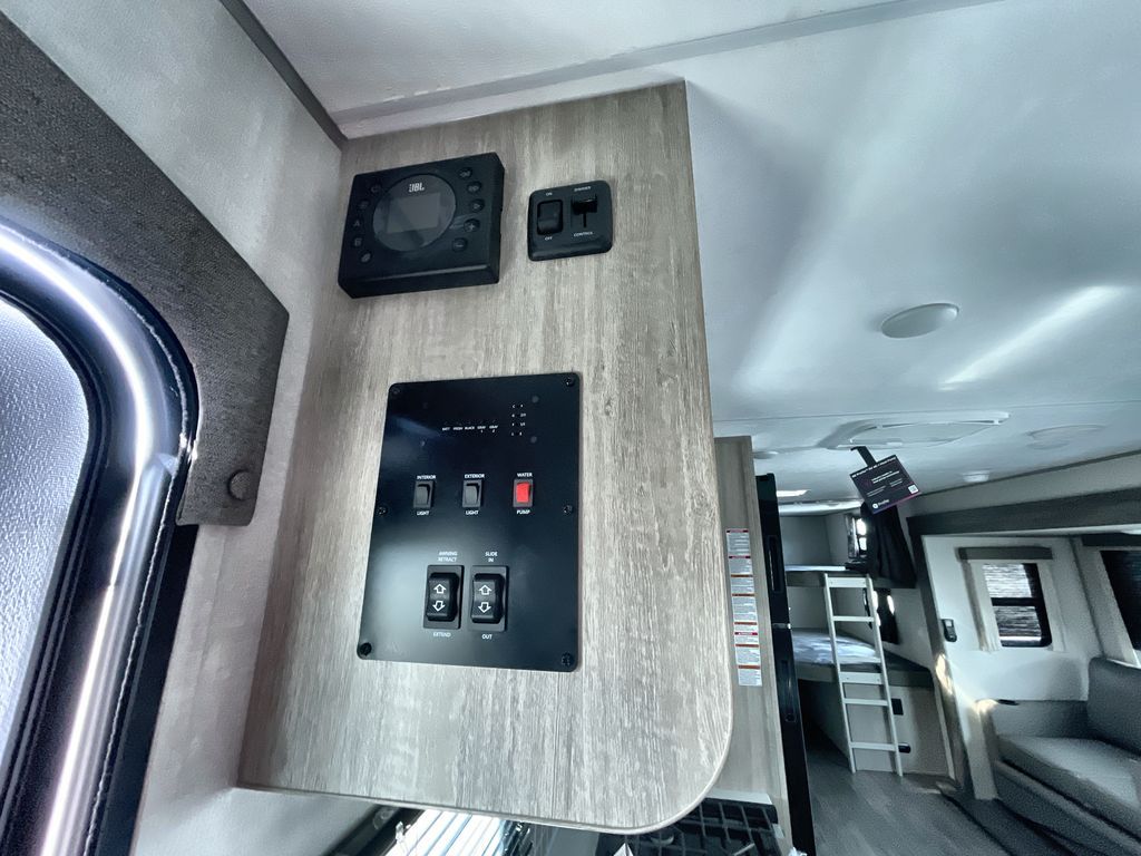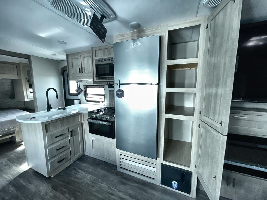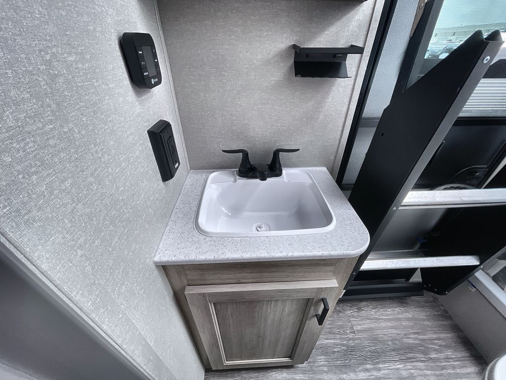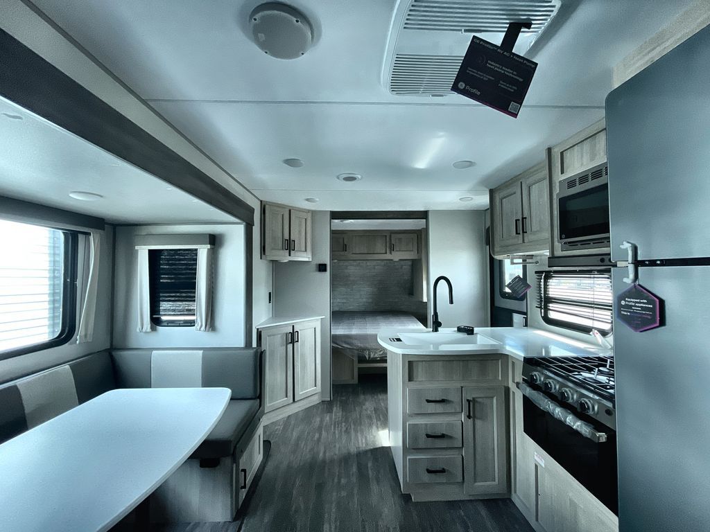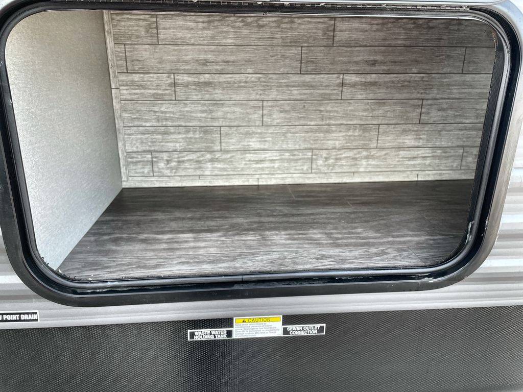 Life is easier in this travel trailer with dual entry doors! One of the entrances is right next to the front private bedroom which has a 60" x 74" queen bed with wardrobes on either side to keep your things tidy. The second entrance leads into the full bath, which also includes a full tub to make bathtime easier for little ones. The living area has everything you need for a cozy evening indoors between the 60" trundle sofa, U-shaped dinette, and entertainment center with a fireplace and 65" TV for cozy movie nights. Cook a sunrise breakfast at the outside camper kitchen with a griddle and mini refrigerator. There is also exterior storage with a fold-down table and a TV hookup if you plan to watch the big game outdoors!