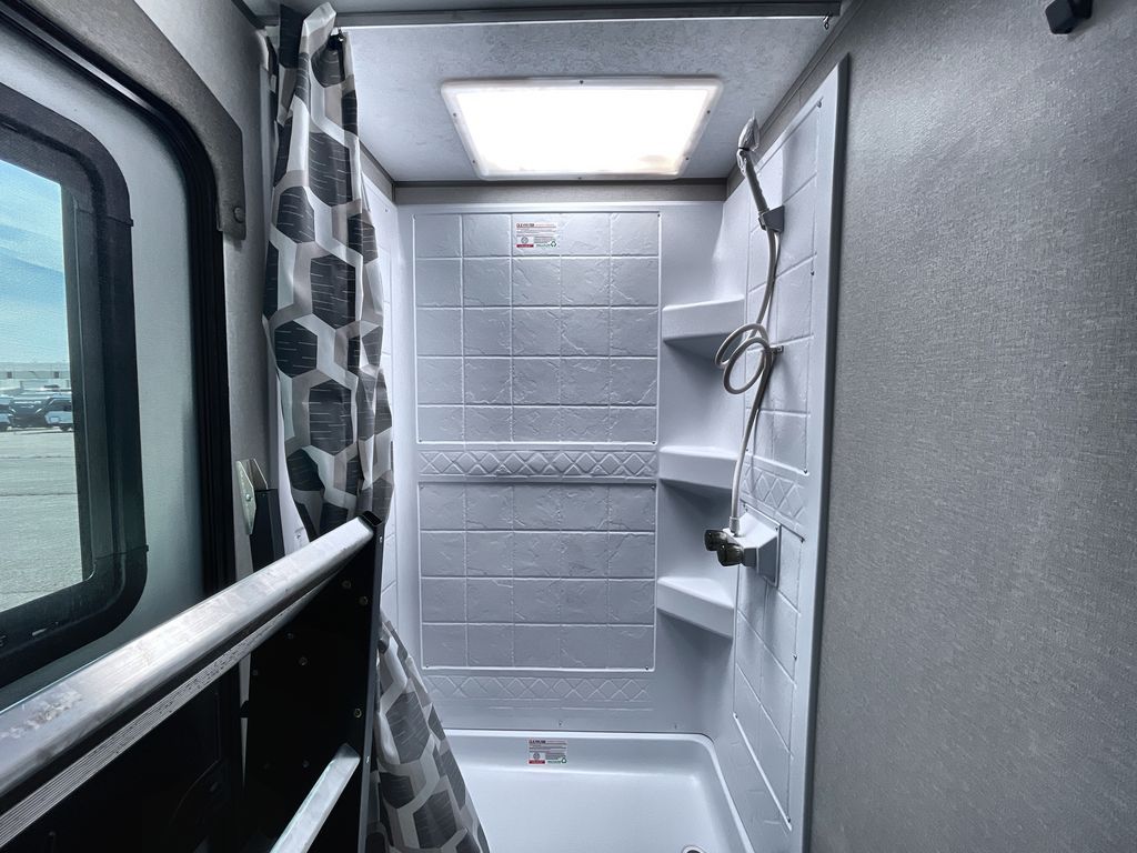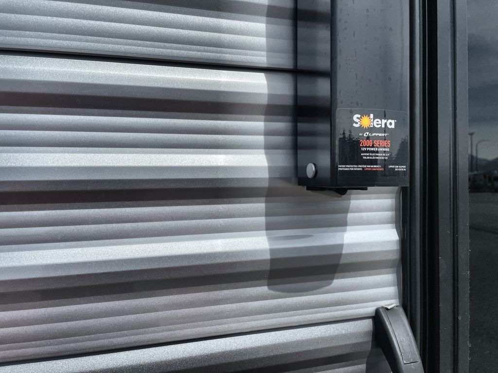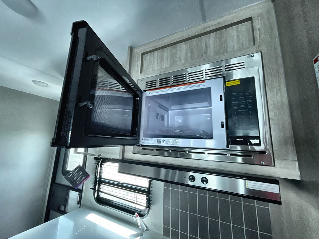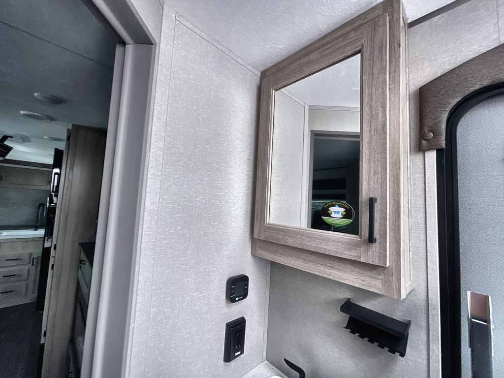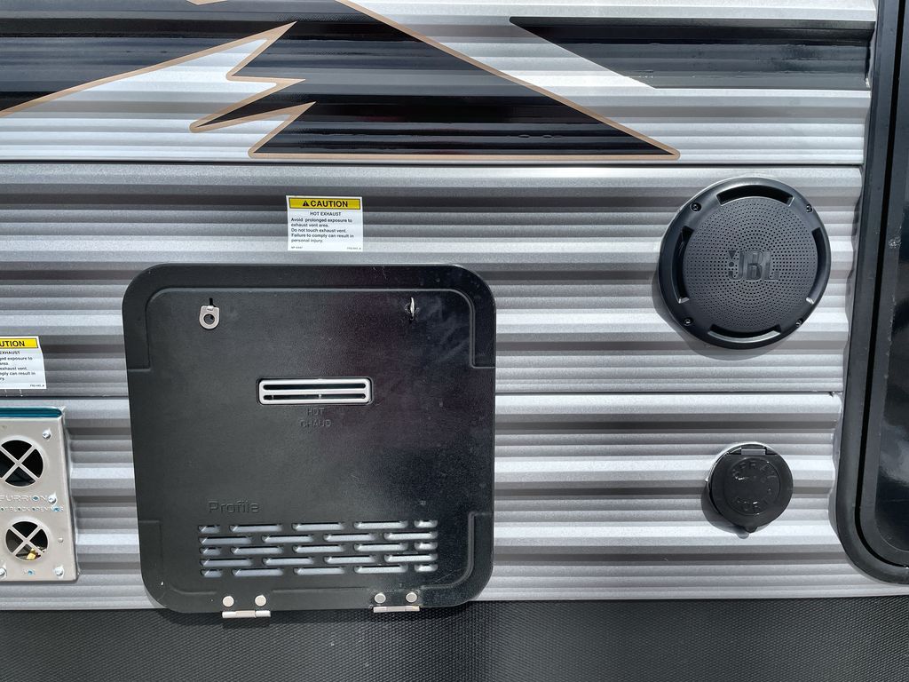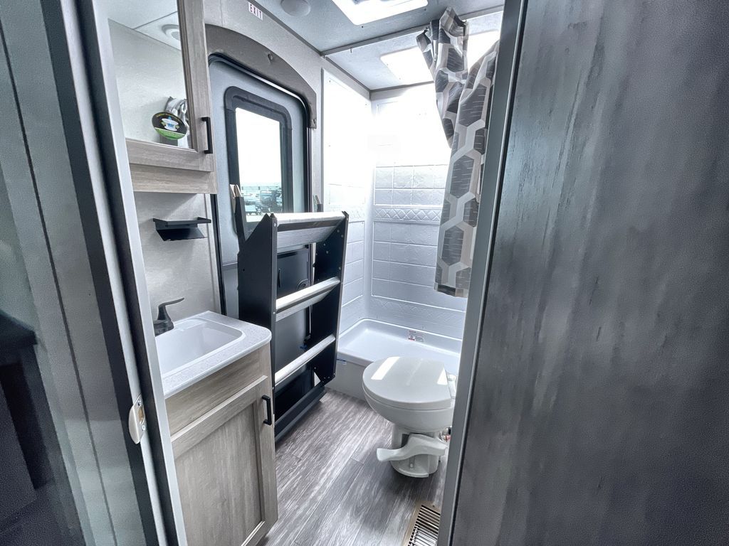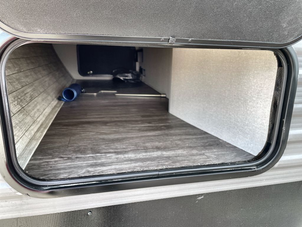 Life is easier in this travel trailer with dual entry doors! One of the entrances is right next to the front private bedroom which has a 60" x 74" queen bed with wardrobes on either side to keep your things tidy. The second entrance leads into the full bath, which also includes a full tub to make bathtime easier for little ones. The living area has everything you need for a cozy evening indoors between the 60" trundle sofa, U-shaped dinette, and entertainment center with a fireplace and 65" TV for cozy movie nights. Cook a sunrise breakfast at the outside camper kitchen with a griddle and mini refrigerator. There is also exterior storage with a fold-down table and a TV hookup if you plan to watch the big game outdoors!
