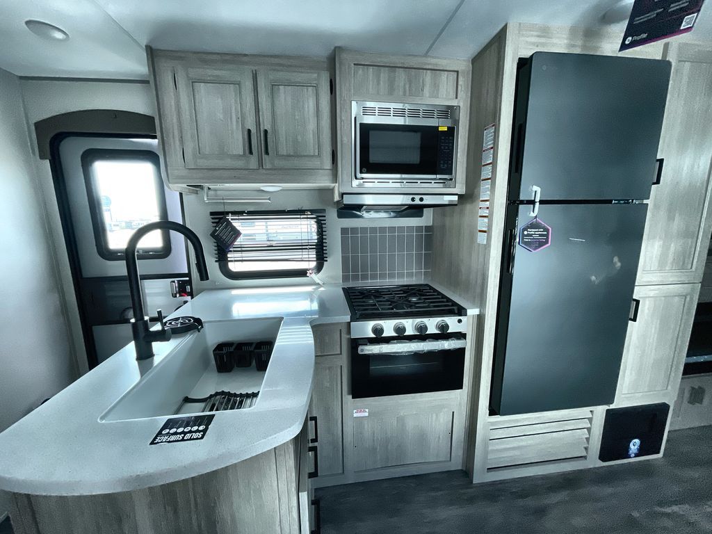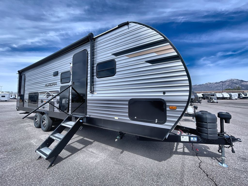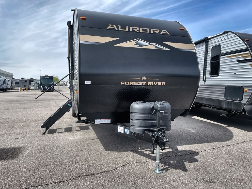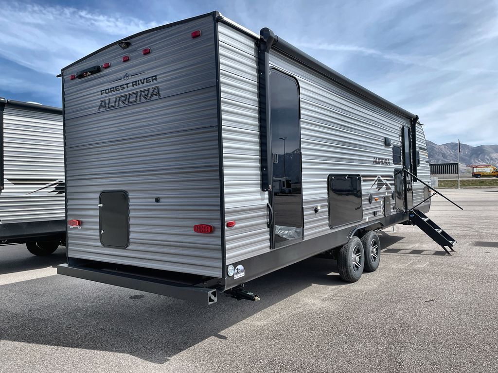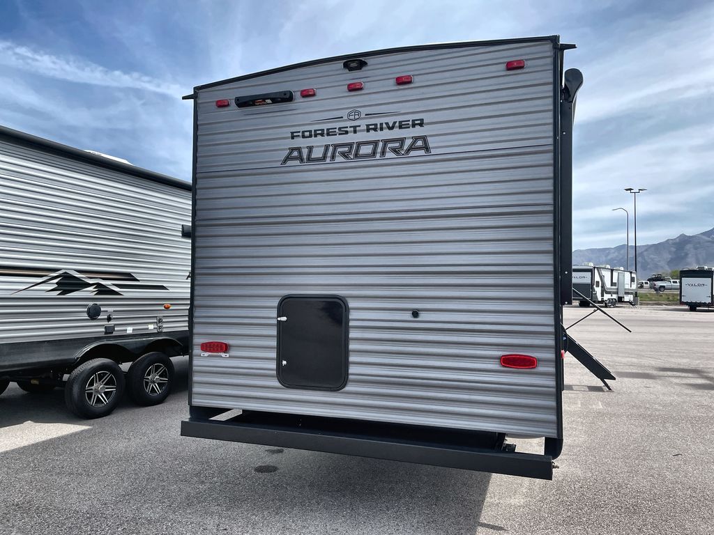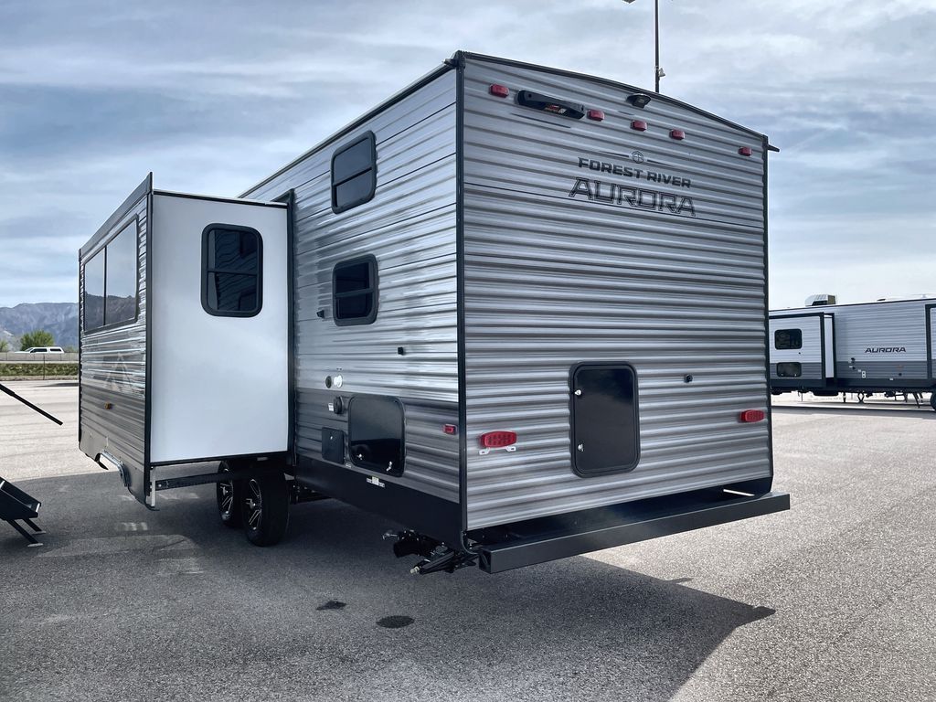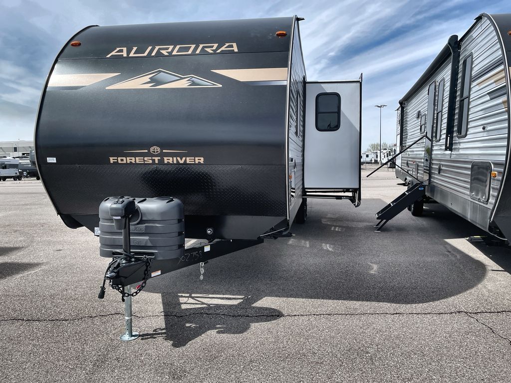 Comfortability, usability, and quality is what you will find in each one of these Forest River Aurora travel trailers, toy haulers or destination trailers! They are designed with a superior build and packed full with industry leading, functional, and distinctive standard features. SolidStep entrance steps and a Safe-T rail door assist on main entry door to help you safely enter and exit the unit. The diamond plate rock guard will protect your unit from road debris and the nitrogen filled radial tires, which keep their pressure longer, offer better fuel economy. You will also find upgraded JBL Elite exterior speakers outside, an electric awning with multicolor lights and remote, plus flush mount baggage doors for easy packing. The interiors are beautifully designed with a deep undermount farm style sink, stainless steel appliances, and linoleum flooring in the slide outs which will be easy to clean. Come find your favorite model today!