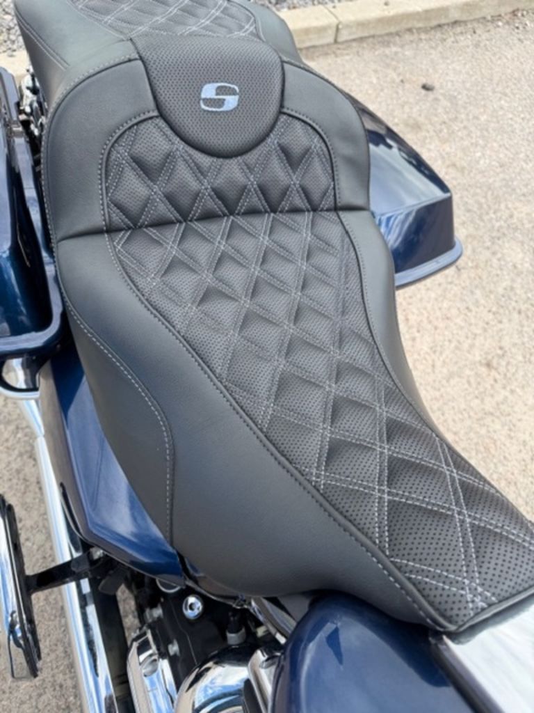 Classic Fuel TankPart of the unmistakable style of the Harley-Davidson® Road Glide® Custom motorcycle is plenty of room for showing off your paint. This classically styled, bold six-gallon fuel tank doesn't just give you a bigger canvas for premium or custom paint; it holds six gallons of go so you can eat up a lot more road between pit stops. We know fuel economy is important—but so is style. Sharp, eye-catching colors and crisp pinstripes that run the length of the bike from the Shark-Nose fairing to the premium GTX® saddlebags—a one-of-a-kind look for any individual soul.