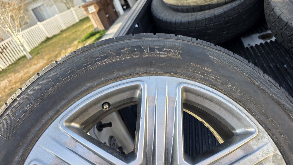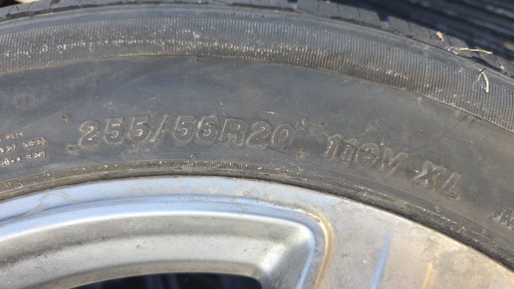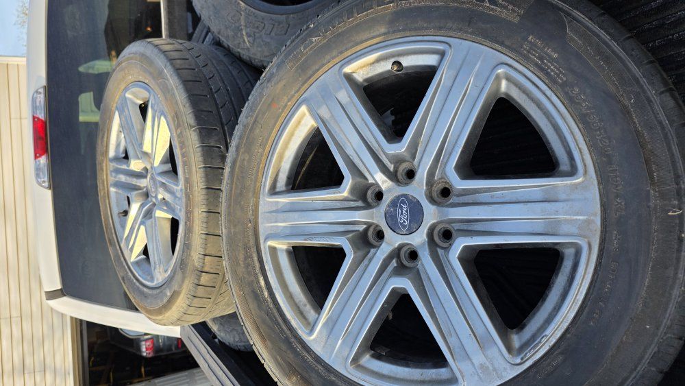 GooglePayset of 4 Ford wheels and tires. These are 20 inch rims with 255/55R20 tires. Decent tred left maybe one summer. One tire does have a small bubble on inner sidewall.