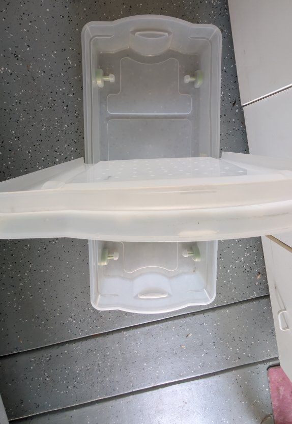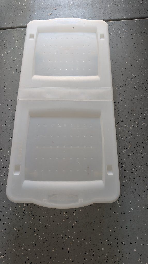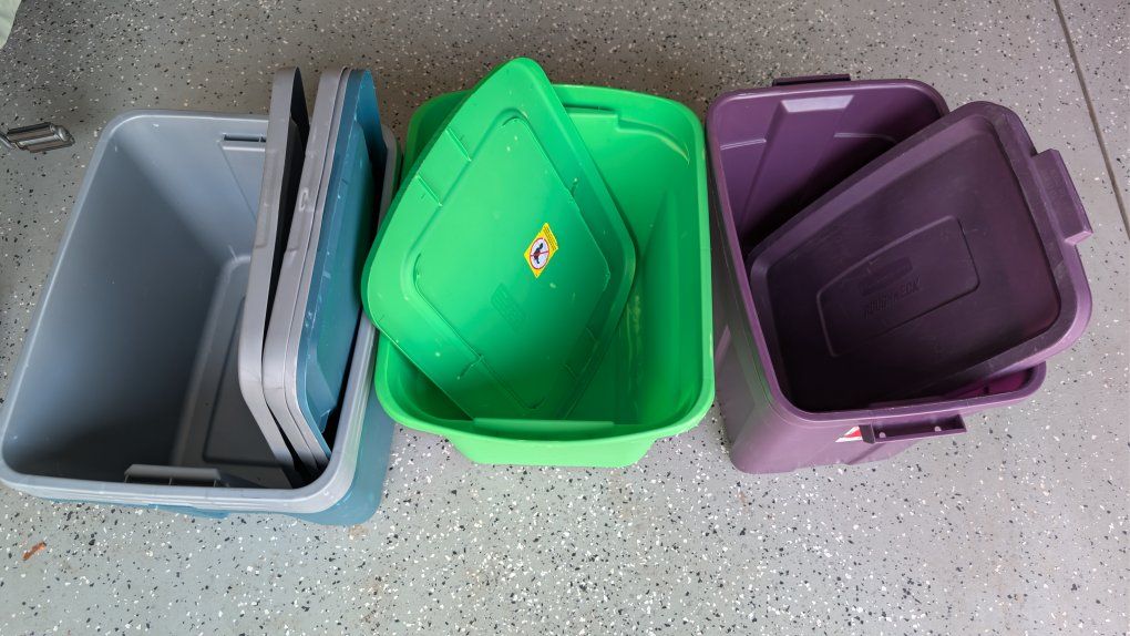 Six 18 Gal Storage Bins. One 16 Gal. with wheels. $25 For All.