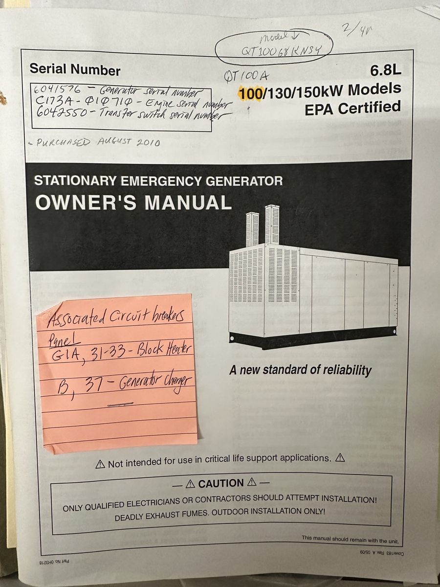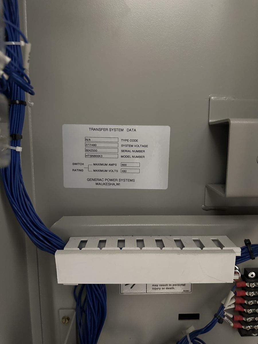 ZelleGenerac Stationary Emergency Natural Gas Generator 6.8L 100KW 3 Phase With Transfer Switch. Transfer switch is 400/800amps/277/480V. 368 running hours. Buyer responsible for removal, transport, and reconnect.