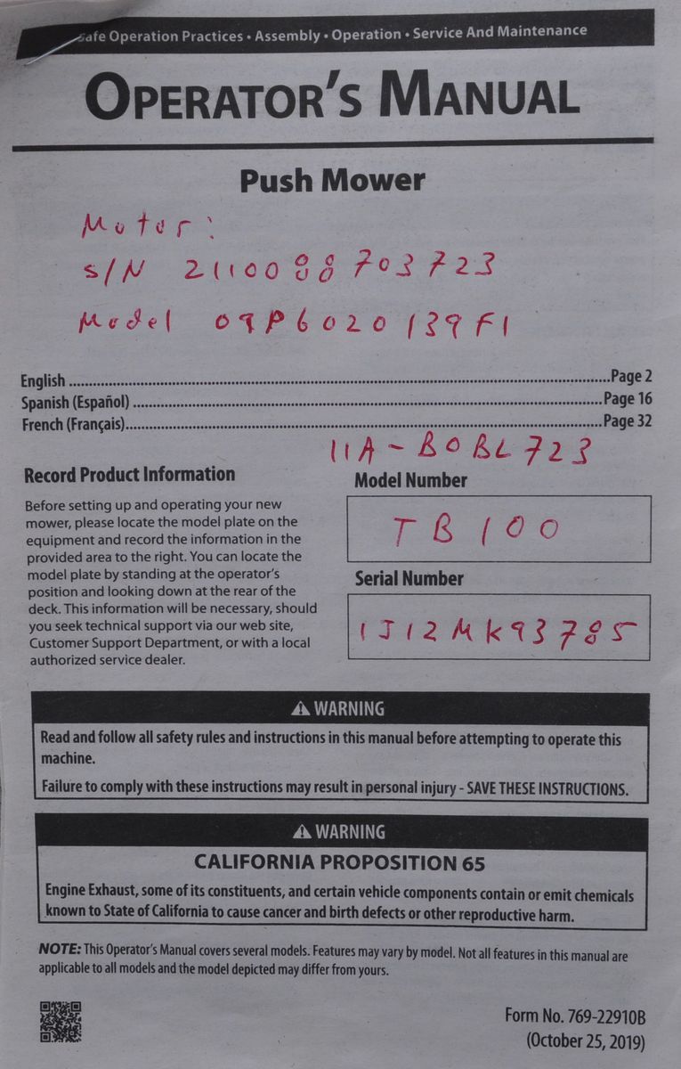 Troy-Bilt 21” push mower ($380 at Home Depot), 140 cc Briggs & Stratton motor, weight 65 lbs. It’s set up for mulching, but it also has a side discharge, but no bag. I used this mower on my home lawn the past 3 ½ years (about 60 hrs run time), it runs great (just bought a self-propelled mower because of health issue). Each year I change the oil, sharpen the blade, and clean the air filter, only used ethanol free gas. Manual is included. Cash only. If you see this ad, the mower is available.