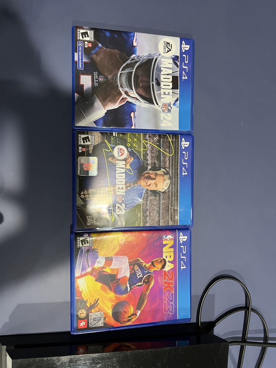 VenmoPS4 three controllers three games NBA 2K 23 Madden 23 and Madden 24 the HDMI cords there the three controllers come with a charging stand it’s been good. It just sits around now. Text or call if you have any questions at 435-534-1909.