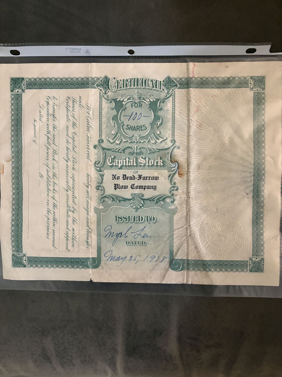 Venmohistoric stock certificate for 100 shares of the No Dead-Furrow Plow Company, issued in 1928 in Utah