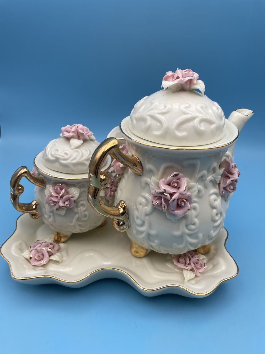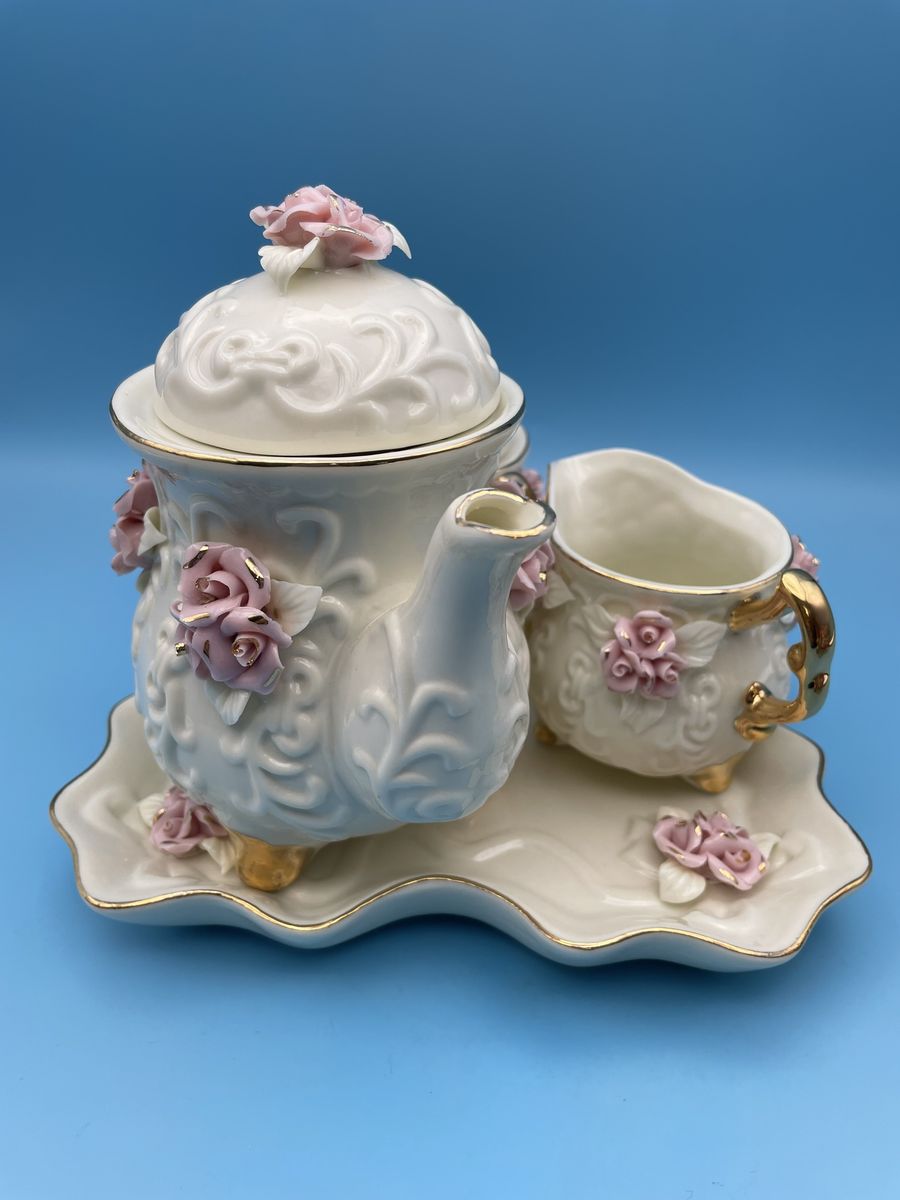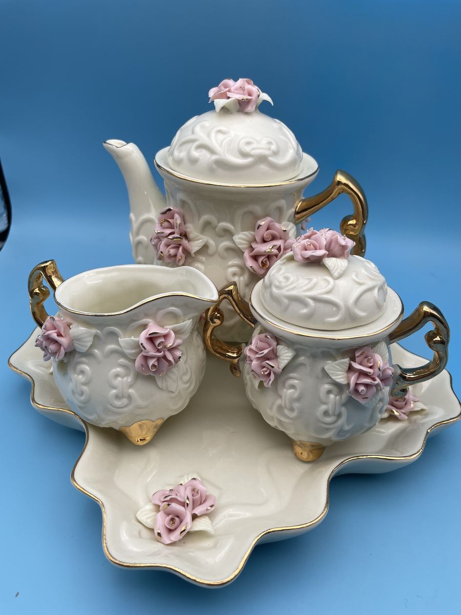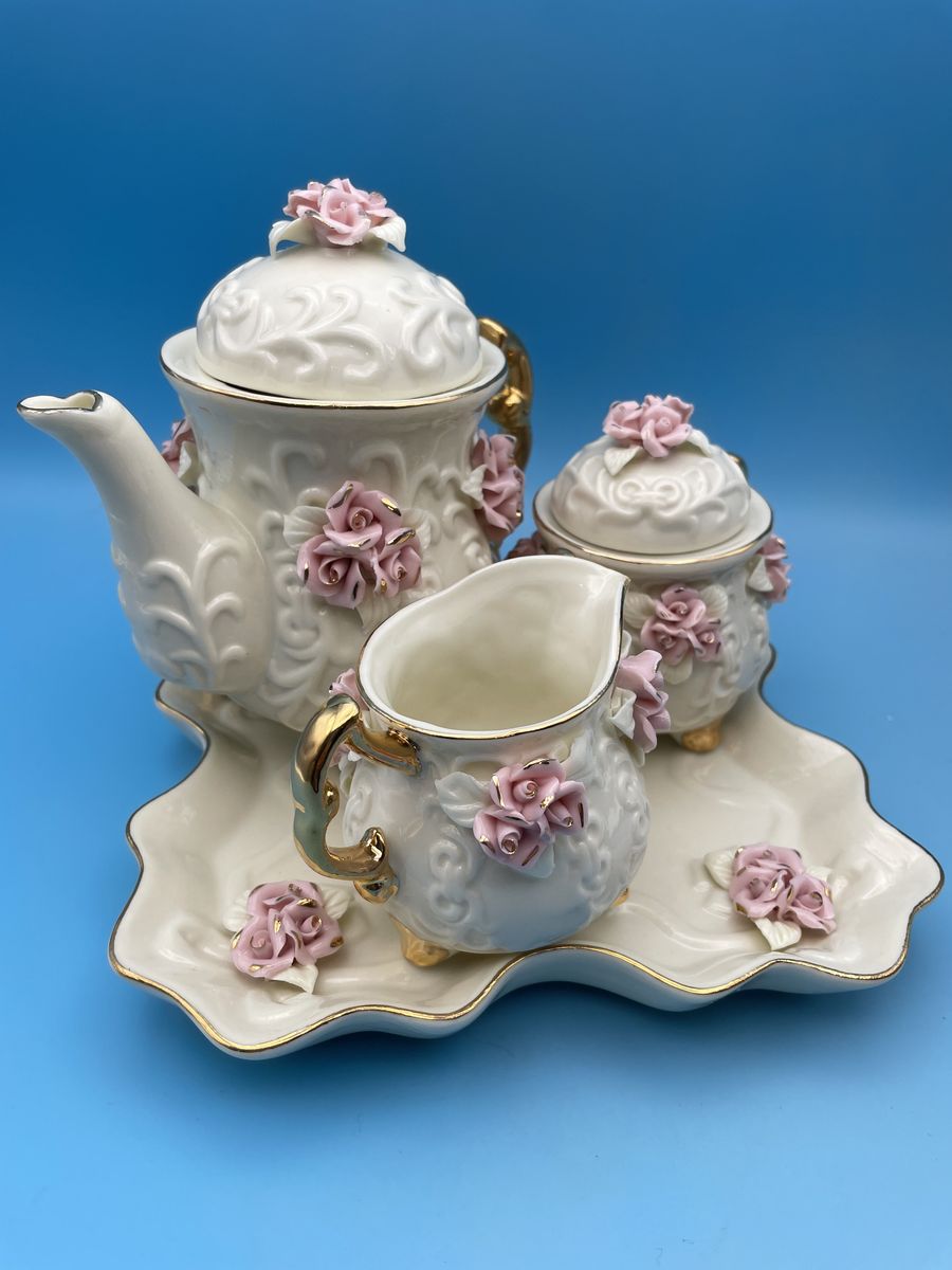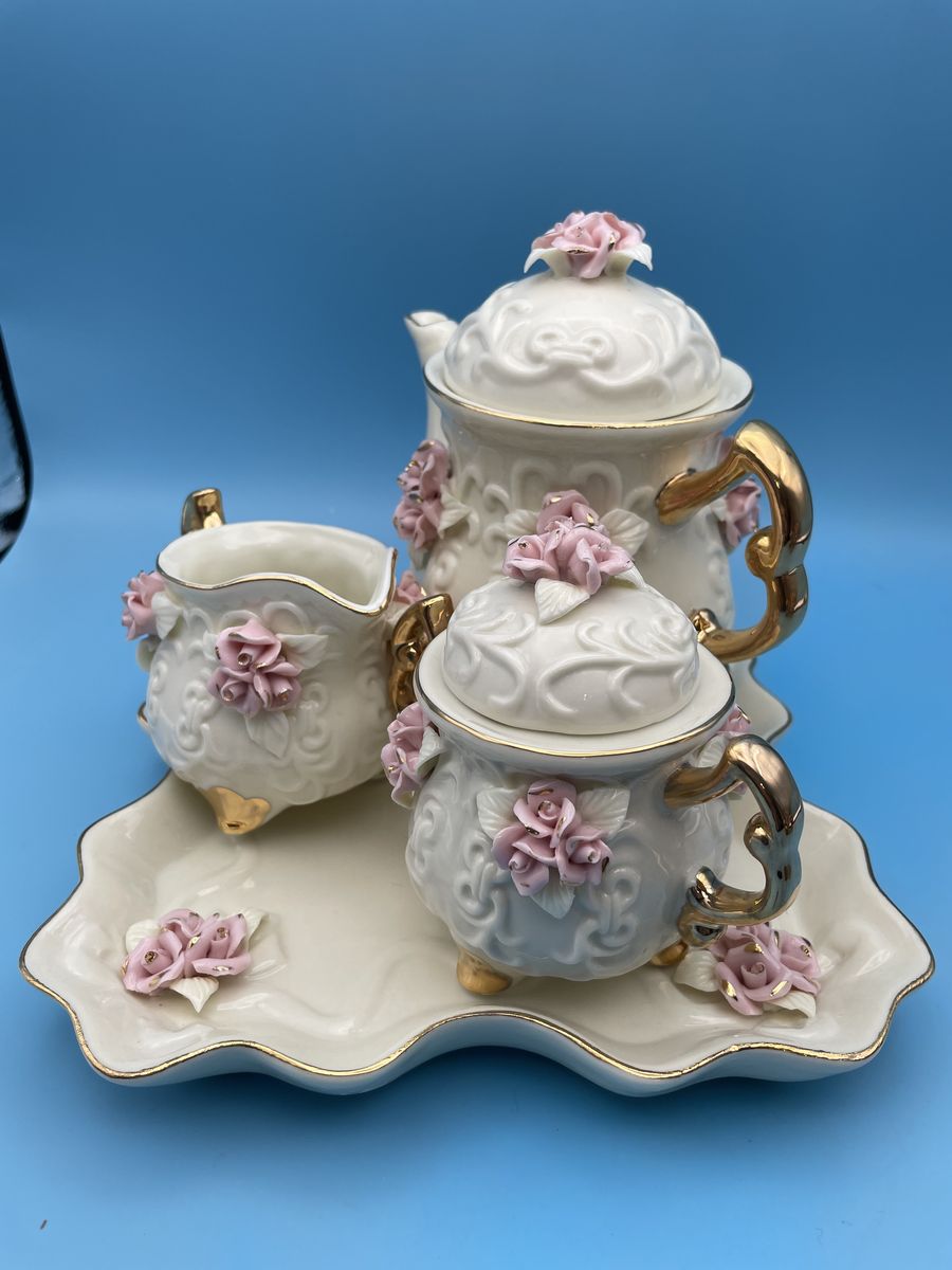 Very Nice Porcelain Cream Miniature Tea Set w/Pink Roses & 10K Gold Trim. The tea pot measures 6" tall x 6" wide, creamer measures 2 3/4" tall x 4" wide, sugar bowl measures 4" tall x 4 1/2" wide and the tray measures 7 3/4" x 7 3/4".