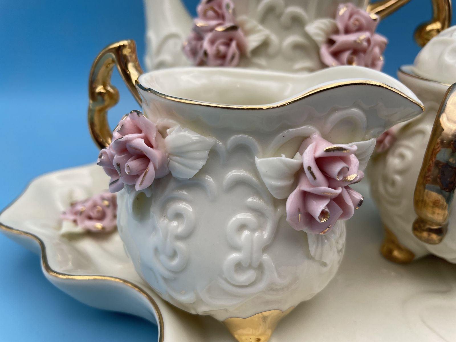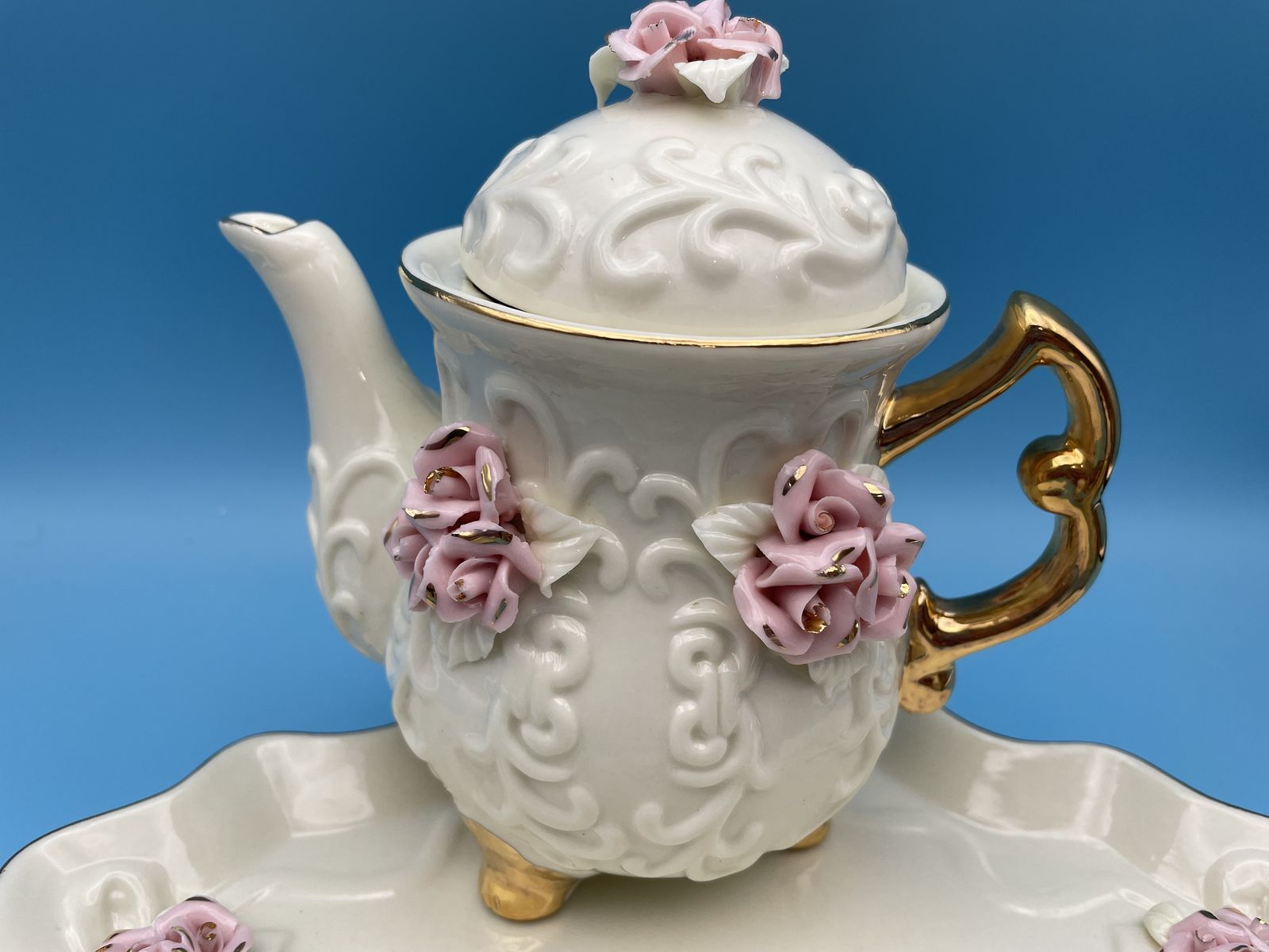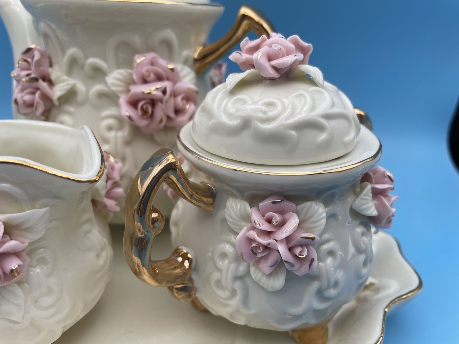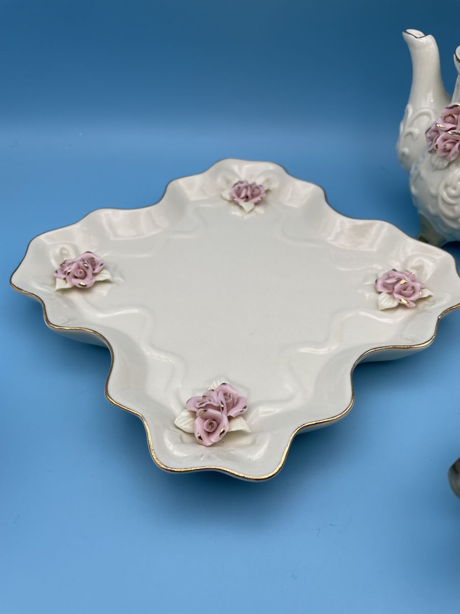 Very Nice Porcelain Cream Miniature Tea Set w/Pink Roses & 10K Gold Trim. The tea pot measures 6" tall x 6" wide, creamer measures 2 3/4" tall x 4" wide, sugar bowl measures 4" tall x 4 1/2" wide and the tray measures 7 3/4" x 7 3/4".