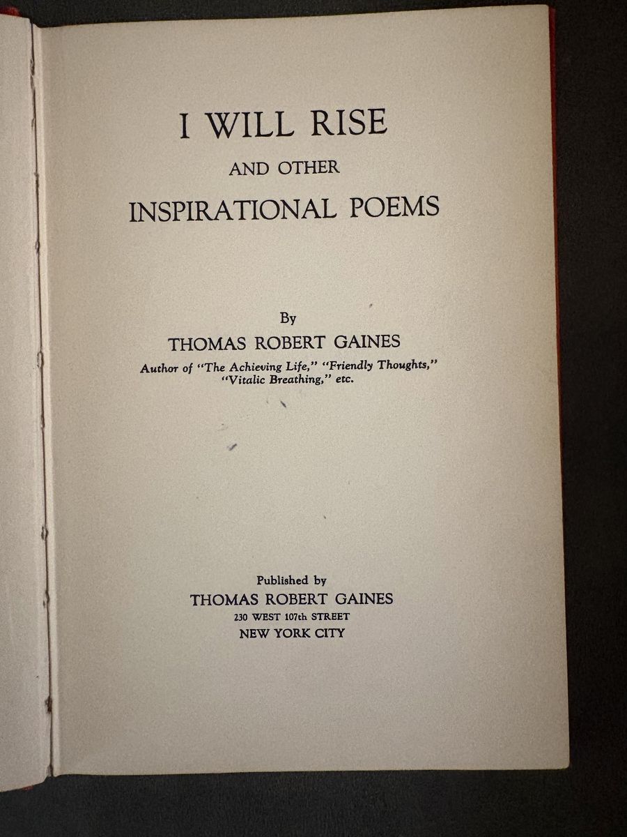 VenmoSIGNED 1927 1st Edition – I Will Rise and Other Inspirational Poems by Thomas Robert Gaines. No dust jacket but incredible condition, see pics