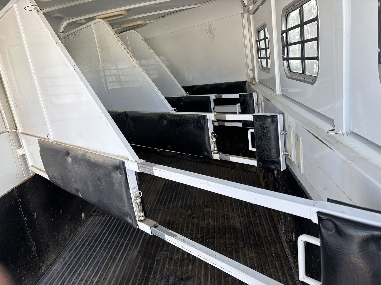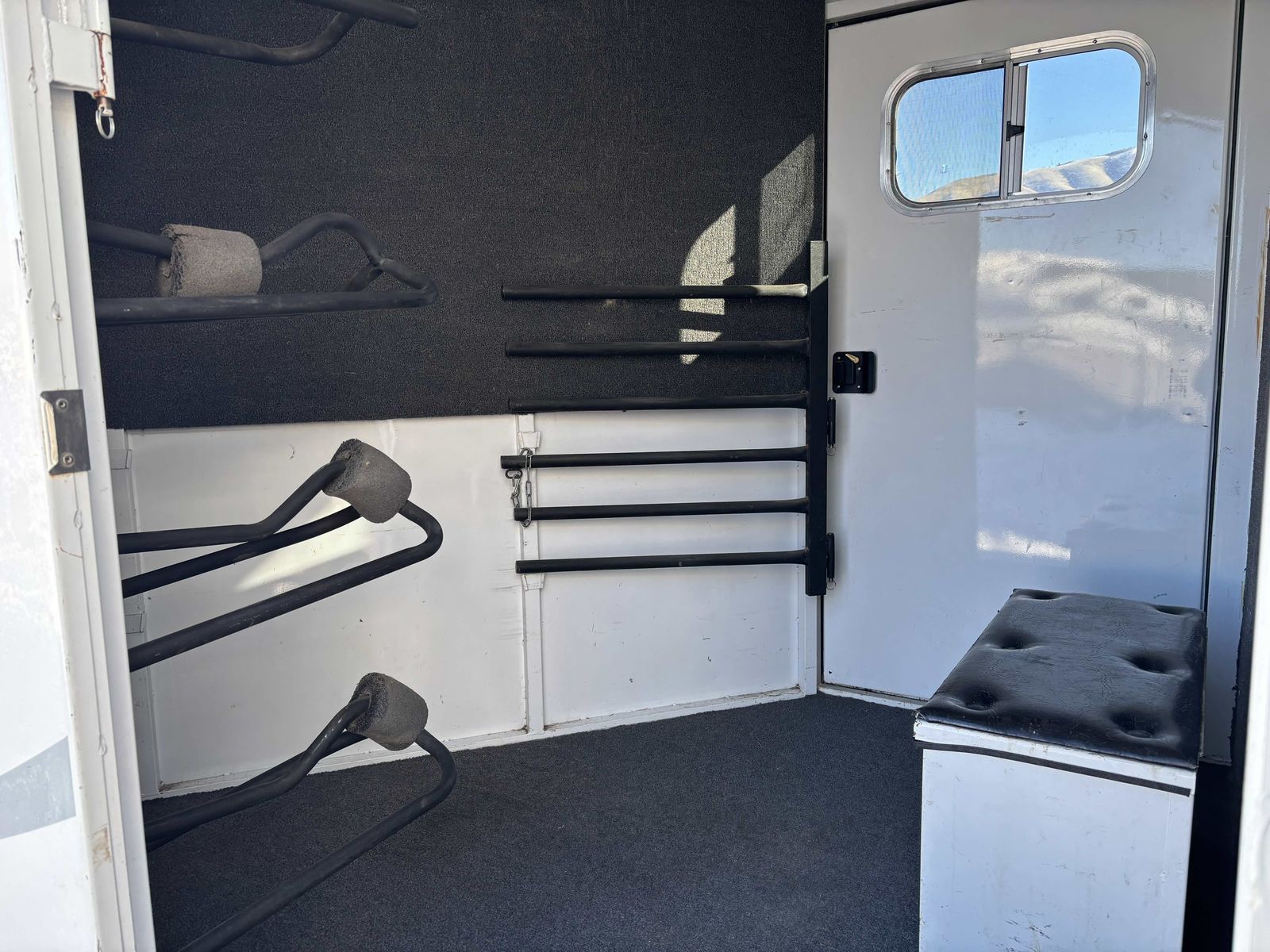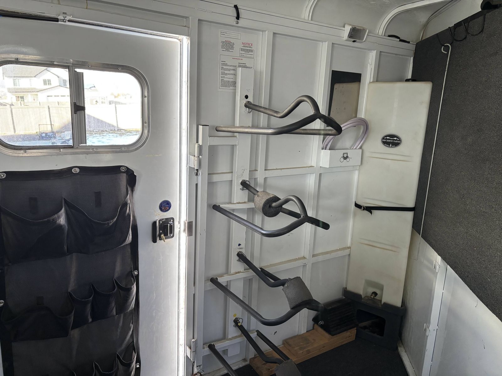 Swing-out saddle rack, pad rack, boot box, 50-gallon water tank.