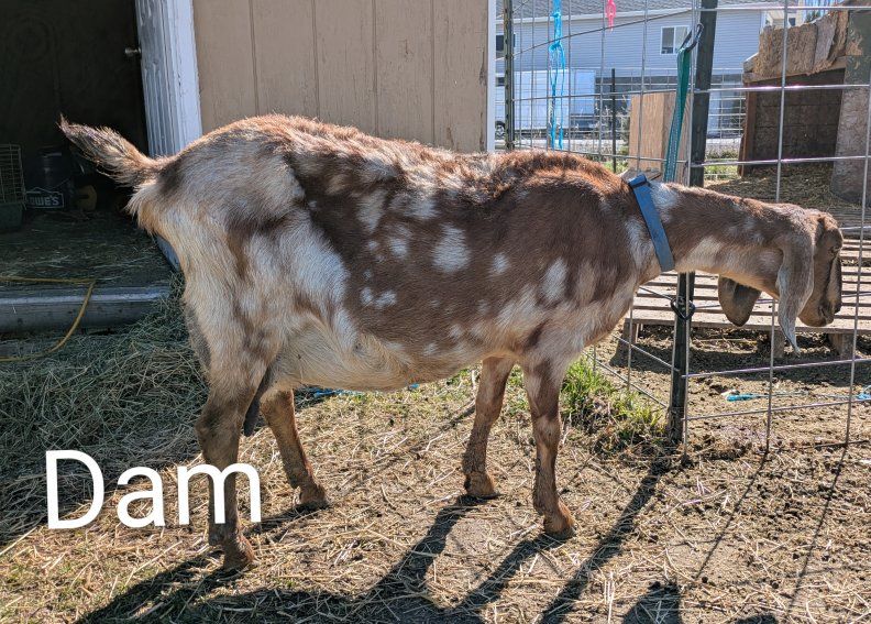 Dam is very sweet. She is tan moonspotted (pictured). She provides delicious milk.