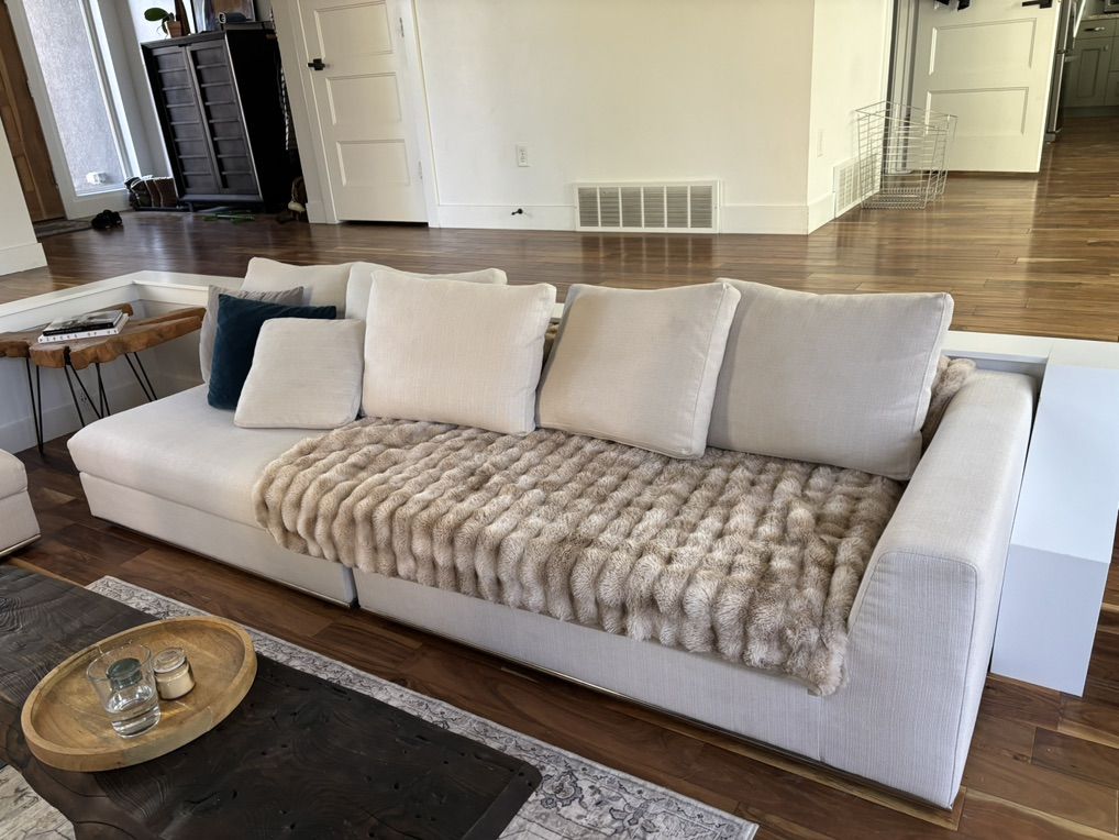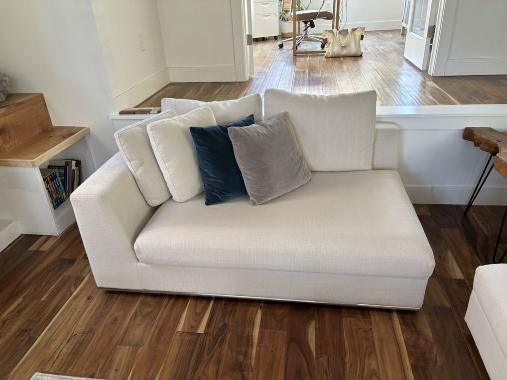 Contemporary white sectional couch with cushions. Professionally cleaned recently. Two pieces with an arm and one piece without arm. It can be flexible in configurations and the sectional can be turned to either left or right with the piece without arm being the extension.
