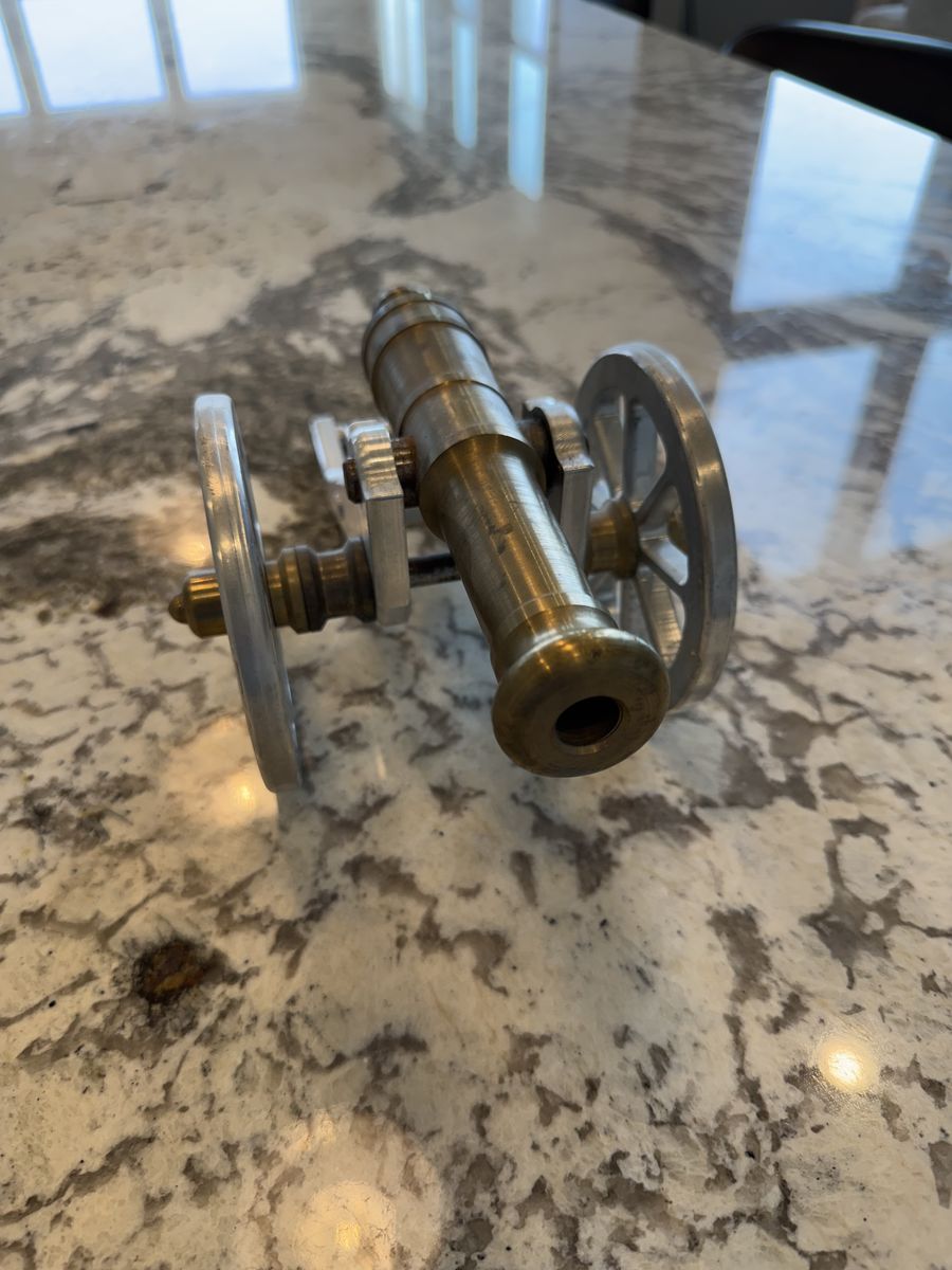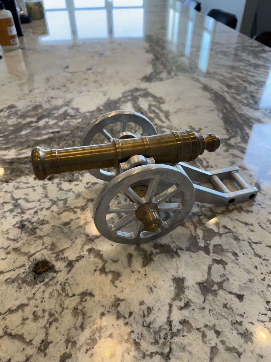 This is a fun display cannon that is non firing. It rolls and the turret tilts up and down. I had it displayed on my gun safe. It has a nice weight to it and is hand made by someone with some machining skills. There is opportunity to further customize it, you could antique it, engrave it, add leather accents, blacken the aluminum. The sky is the limit to adding to it. It is 4 1/2” high by about 11” long. Text with any questions. Pickup in Tremonton