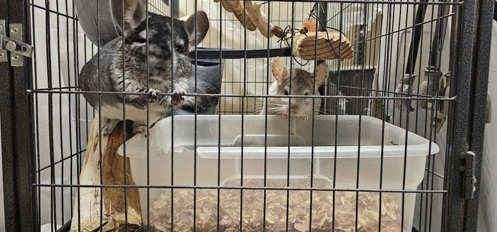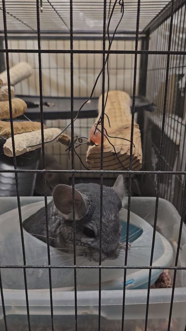 Free -2 bonded female chinchillas with older cage and a large ball to run around in. The gray's name is Squishy and we have had her for 5 years. she loves to snuggle in my son's bed under the blanket and be held. The light gray with freckles on her ears is Jill aka poo poo num num. We have had her for 6 years. she is very sweet but much more timid. it is fun sit in an eclosed room with them and watch them parkour! My boys, that own them, are either away at school or getting ready to graduate and move. They don't get attention anymore other then when it is cage cleaning time, refills on food or bathing. I am super torn giving them away but they need interaction. Plus, we now have two dogs large hunting dogs that would really love to taste/hunt/snuggle? them.