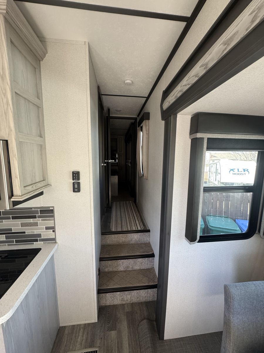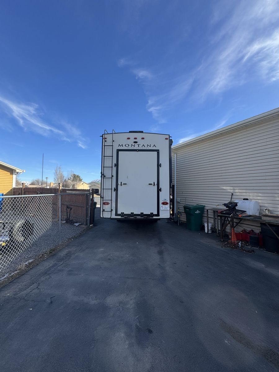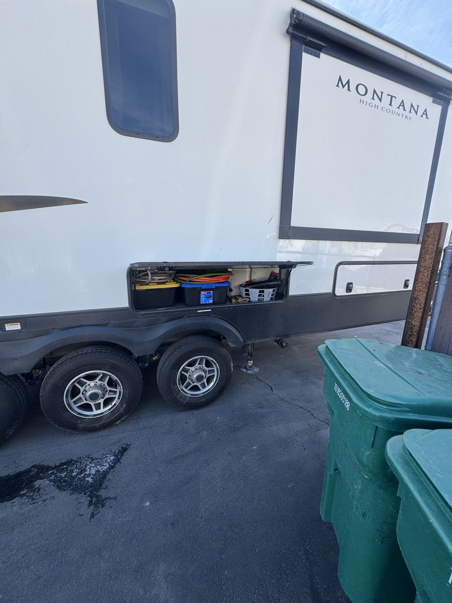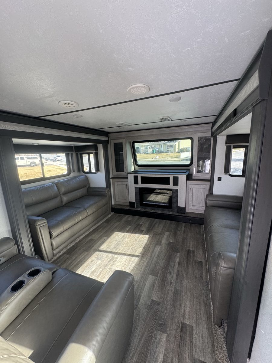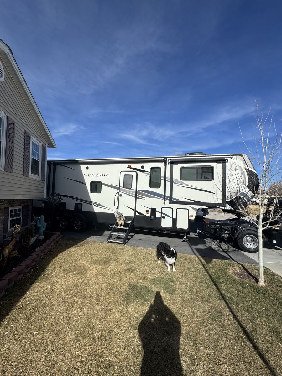 Spacious 2021 Montana High Country RV. Has a great cargo area in the rear with a ramp. Full size stainless steel fridge inside. Lots of storage space. Clean inside and out. Modern interior with wood-look floor and ceiling fan. Road Armor suspension.4 slides this is a must see See Less