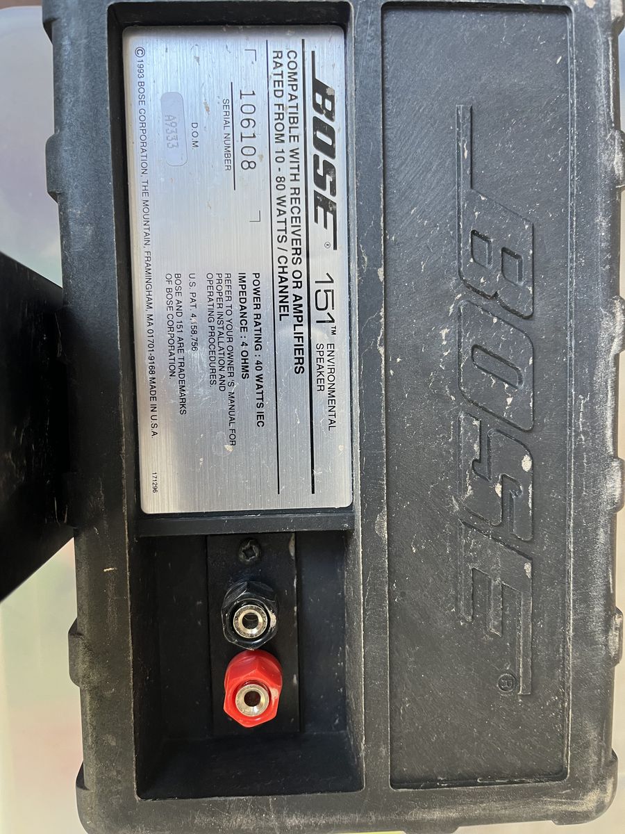 2 Bose 151 speakers. Compatible with receivers or amplifiers. 10 to 80 watts per channel. Marked environmental so I assume they are rated for outdoor use, but don’t see why they couldn’t be used for other applications.