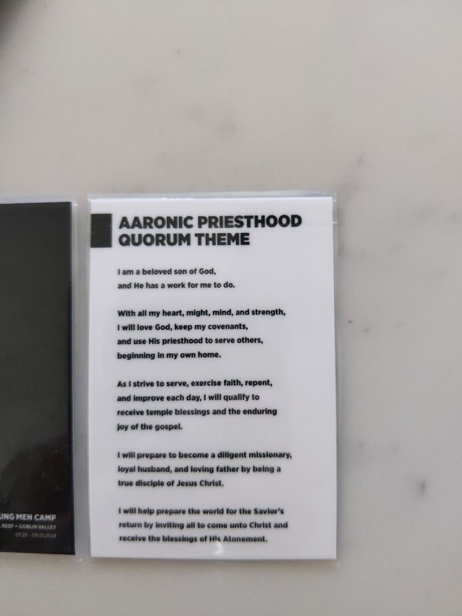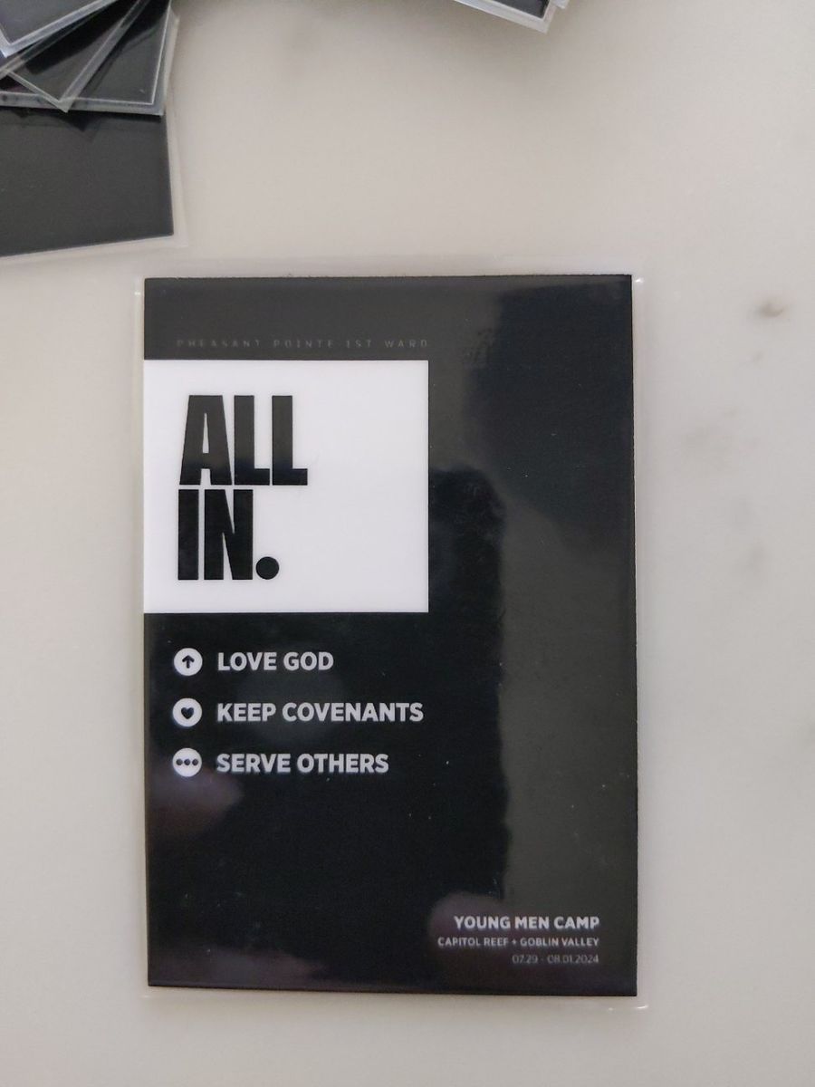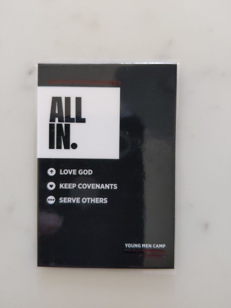 I have 12 of these laminated cards for a YM camp. The theme is All In--- Love God, Keep Covenants, Serve Others. The Aaronic Priesthood Quorum Theme is on the back. They can put these cards in their wallets or pockets.