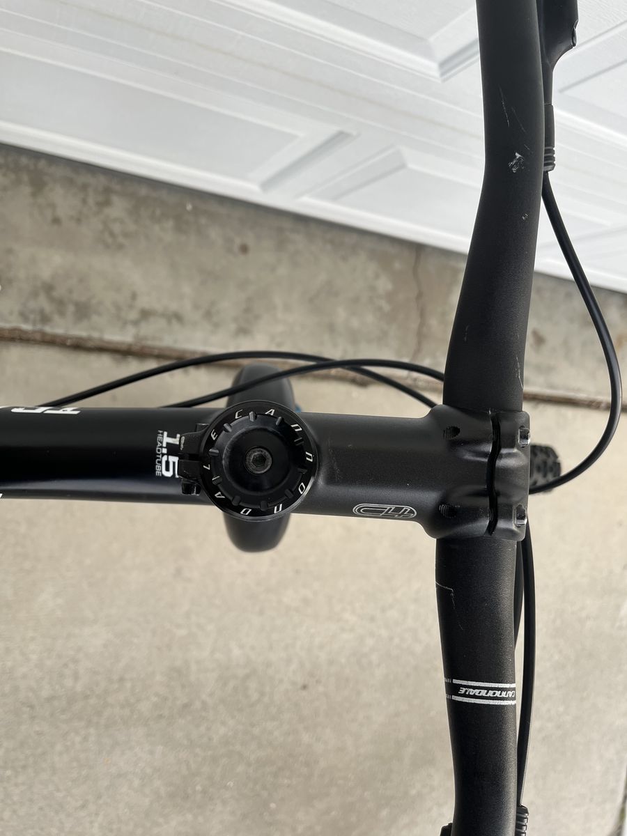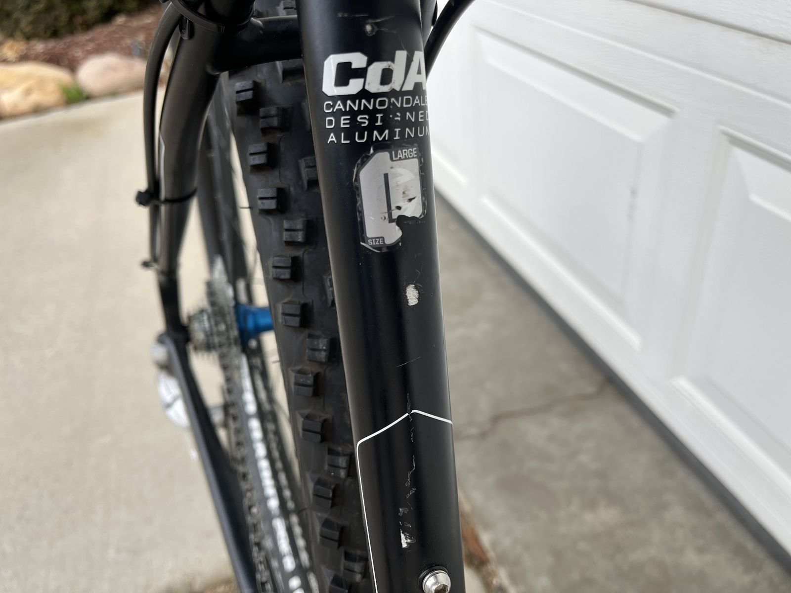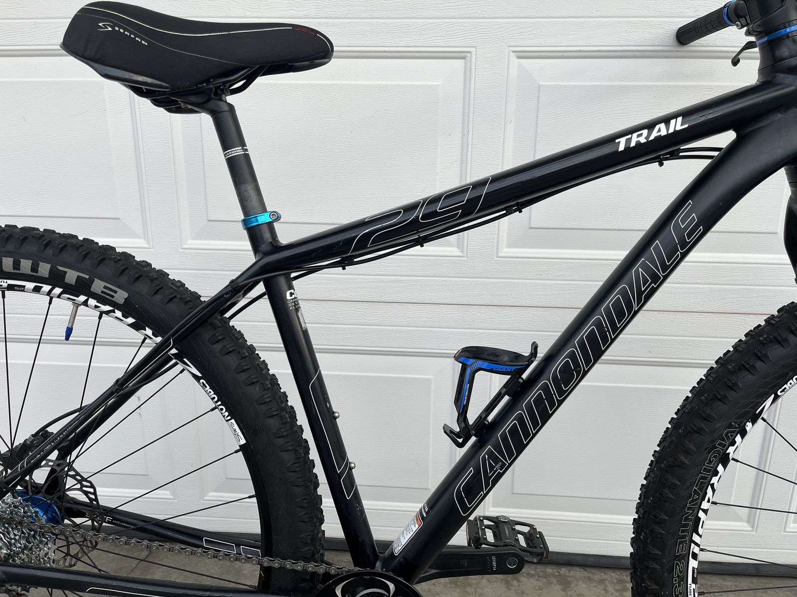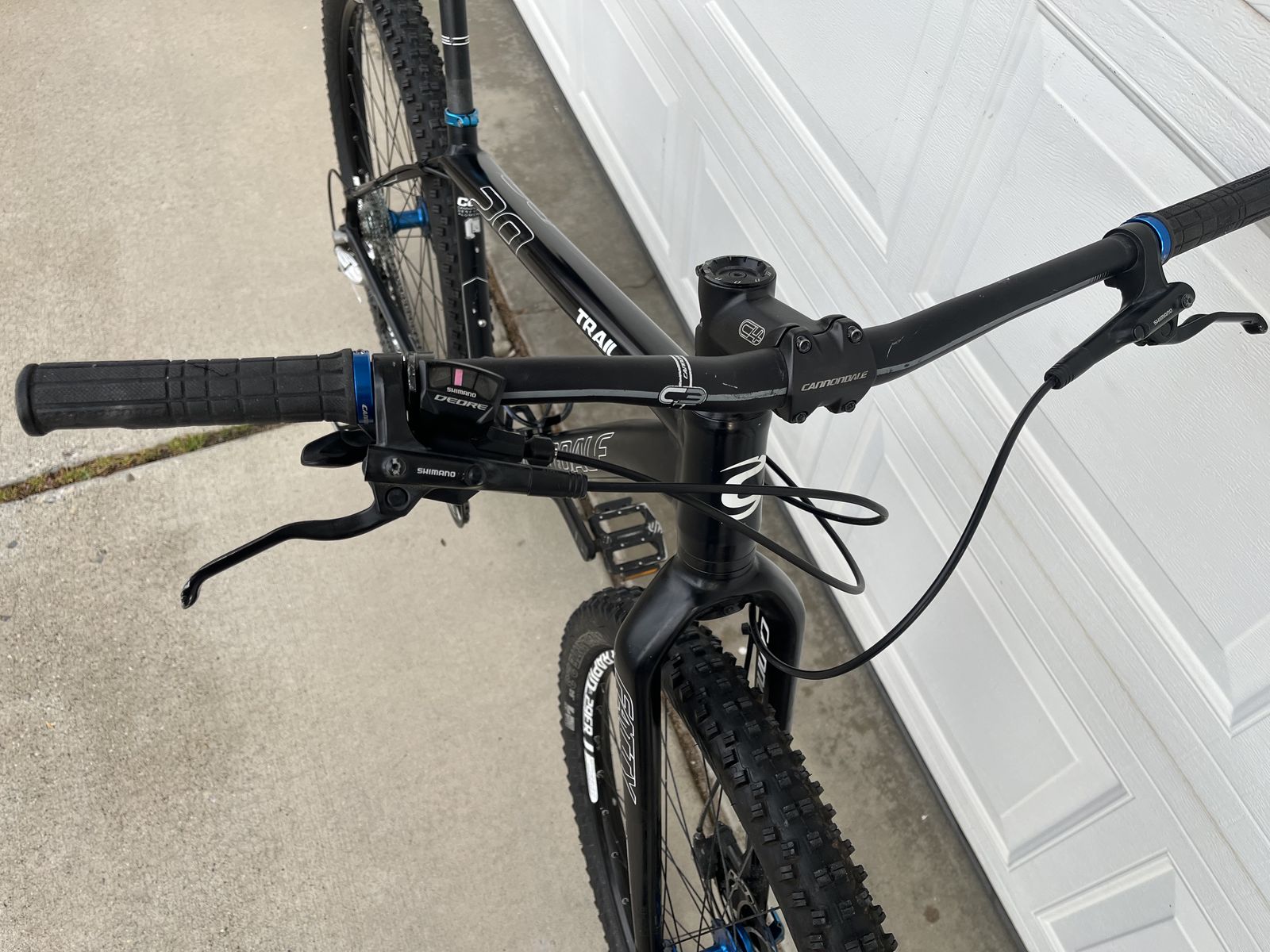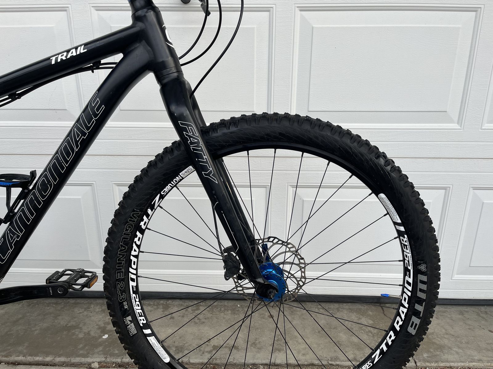 This is a simple, light and fast bike with 29 inch Stan’s wheels, 9 speeds (1x9), rigid Fatty fork, Shimano Deore components, and Shimano hydraulic disc brakes. The frame is a size large with a standover of around 31 inches.