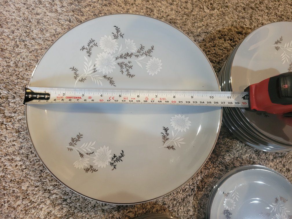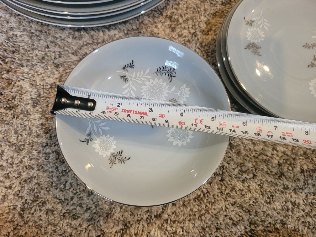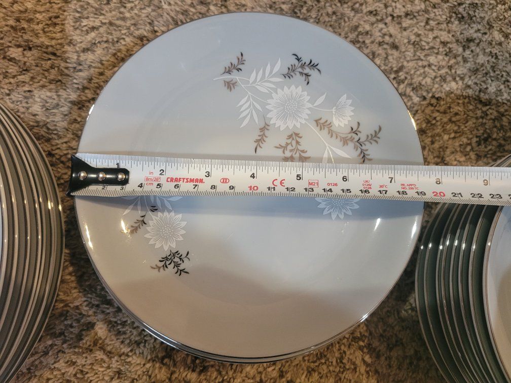 $350 for 24 pieces listed below: 8 dinner plates 10.5". (One has a small chip, see pics). 8 plates approx. 7.5" 8 soup bowls 7.5"