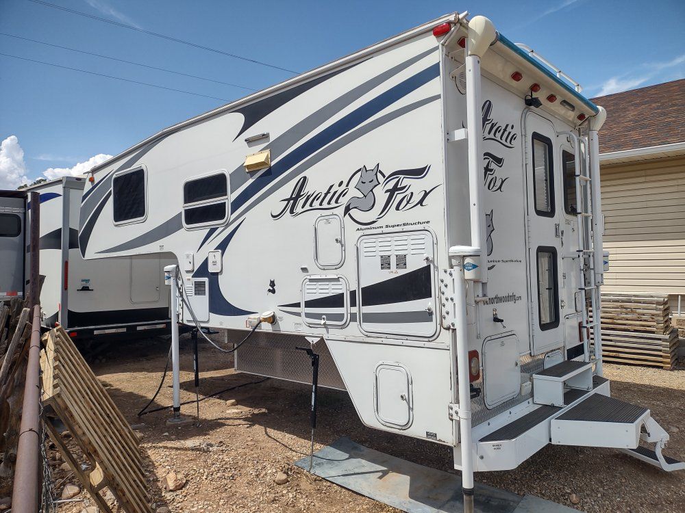 Very clean and well maintained Arctic Fox 811 camper. Roof is in good condition, no leaks. All systems in camper function properly. Features: Sleeps 4, dinette slide out, rear awning, newer tempurpedic mattress, 50 gal fresh water tank, full wet bath, microwave, a/c, heater, arctic package insulation, on board propane powered generator, dual batteries, dual propane tanks, outdoor utility shower, electric jacks with controller, lots of storage. Comes with an extended hitch to tow your toys, and torklift camper tie downs.